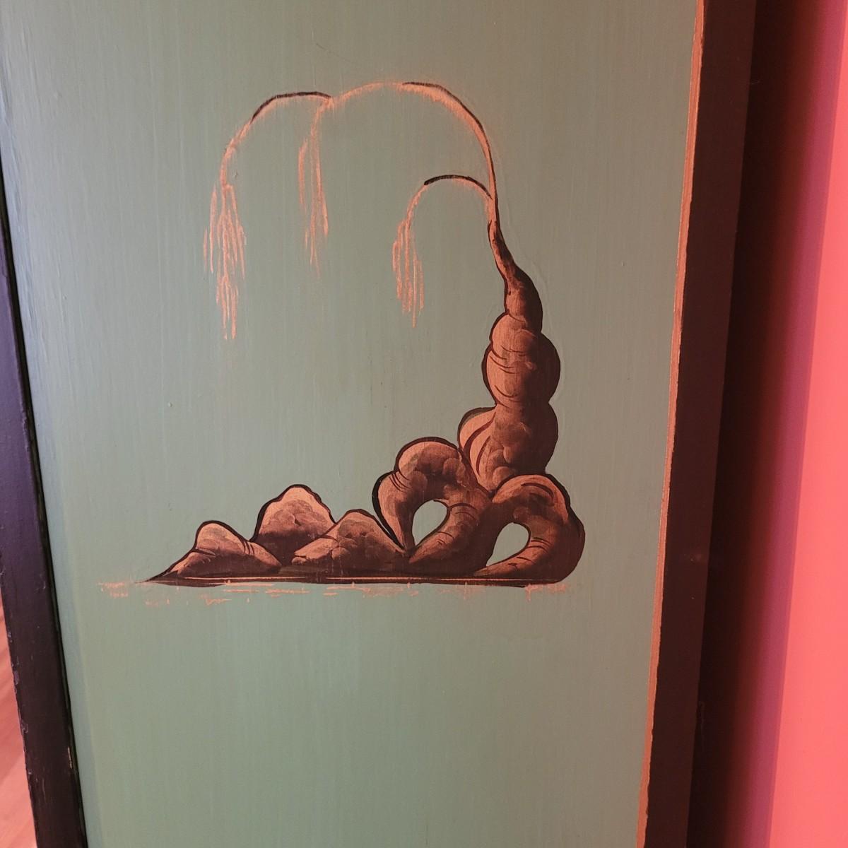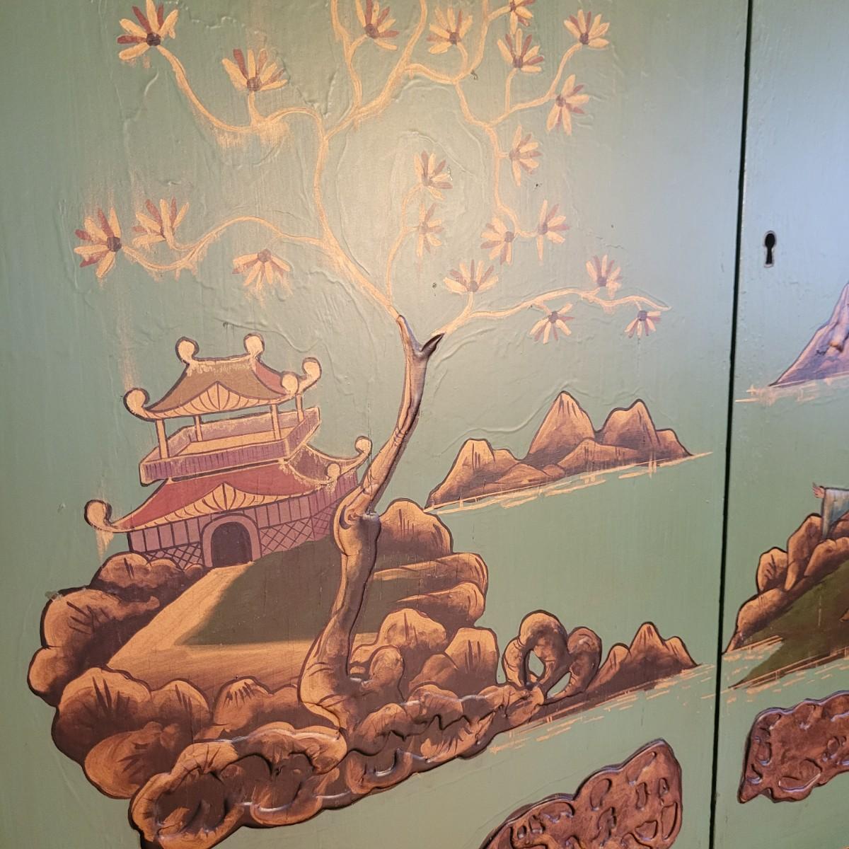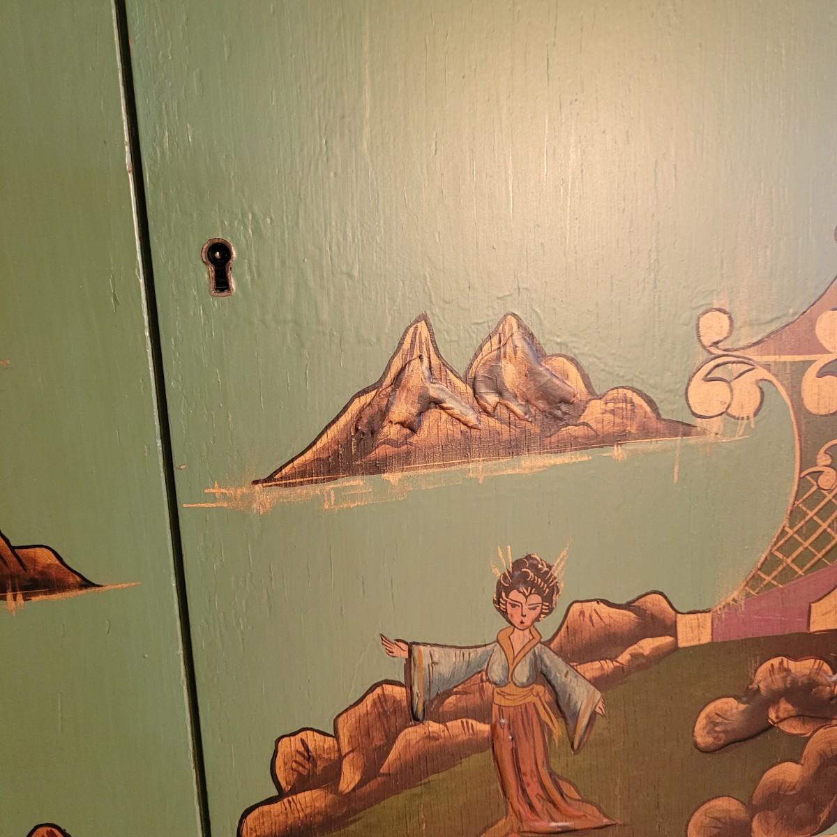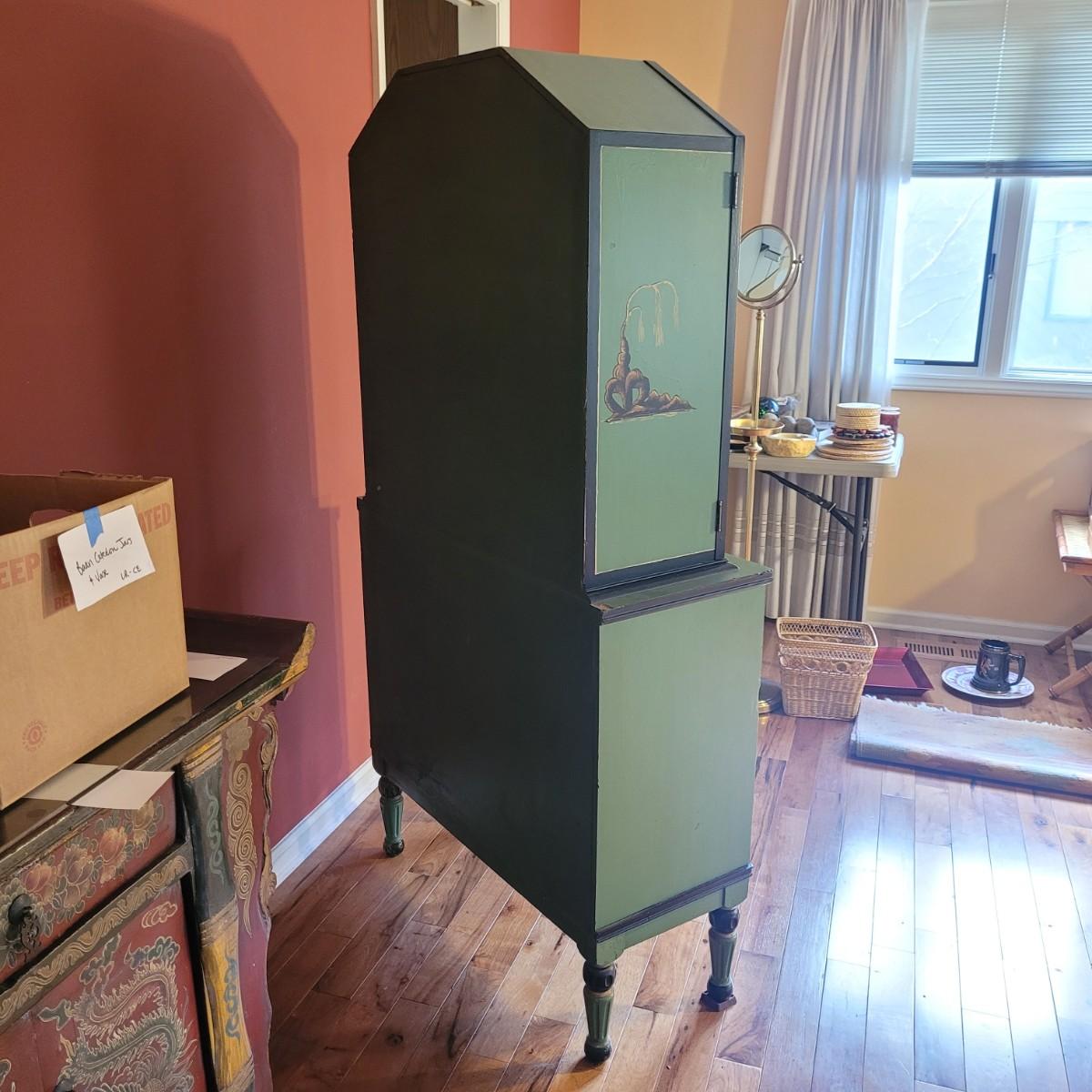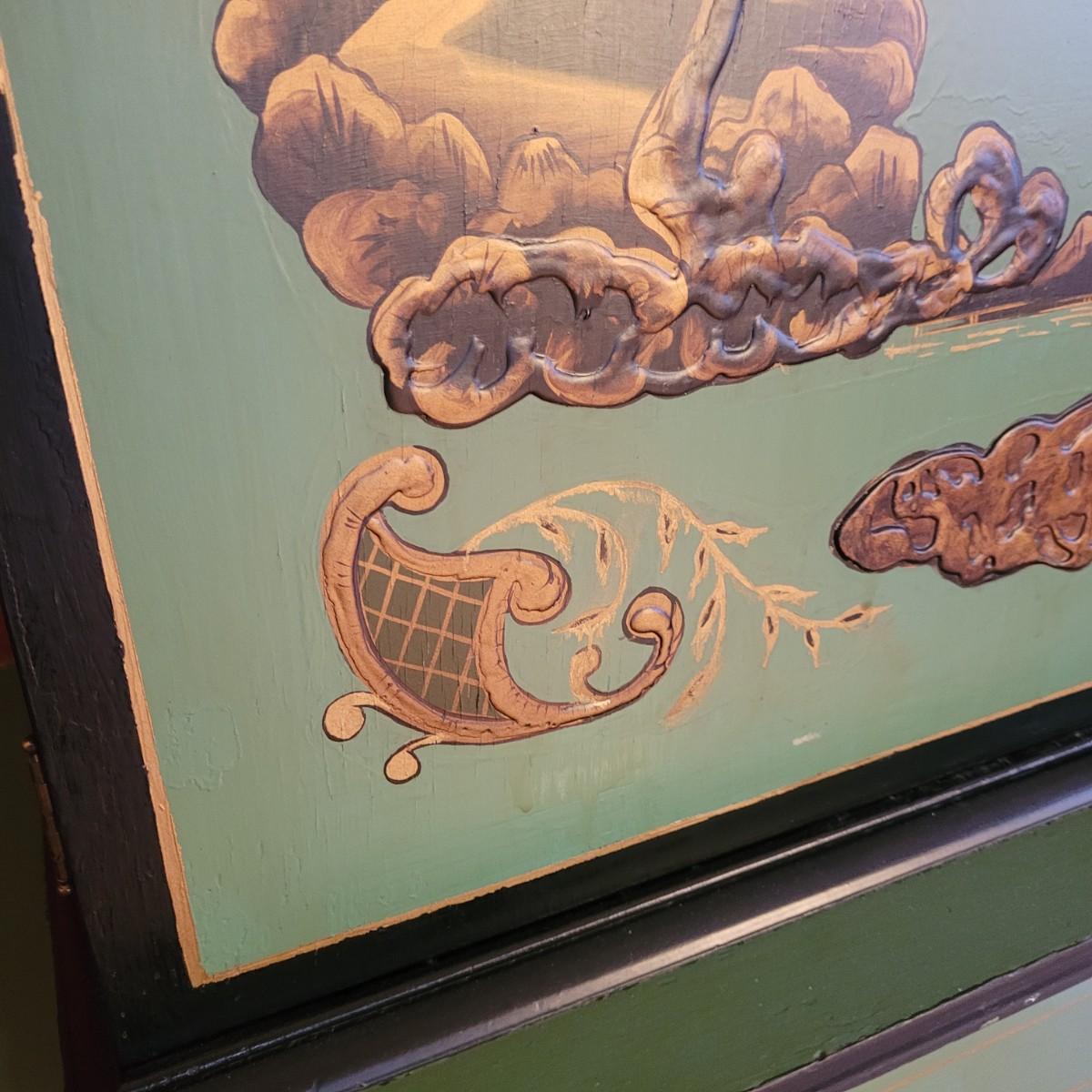 This engraved and hand painted cabinet depicts an Asian-style nature scene with inlaid, carved wooden decor. Drawers have dovetailed construction. No key is included. Note that two front legs are on risers to balance out furniture. Some chips and scuffs throughout (see photos). Measures approximately 33.5” x 14” x 64.5”H. Label states that it is from Al Carlson Mfg. Co. Local pickup only. Winning bidder must bring assistance to help move and load this item due to its weight and size. It is located on the main floor and will not need to be moved up or down any stairs.