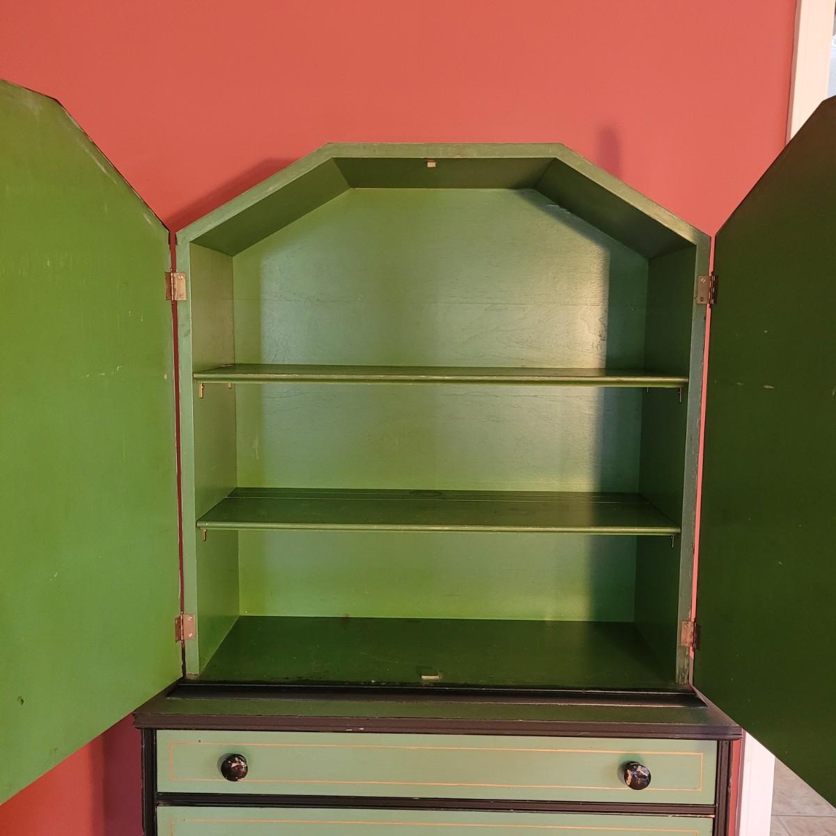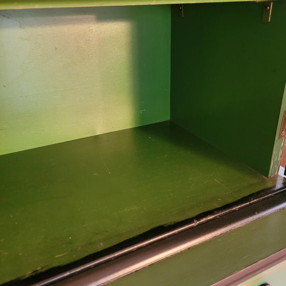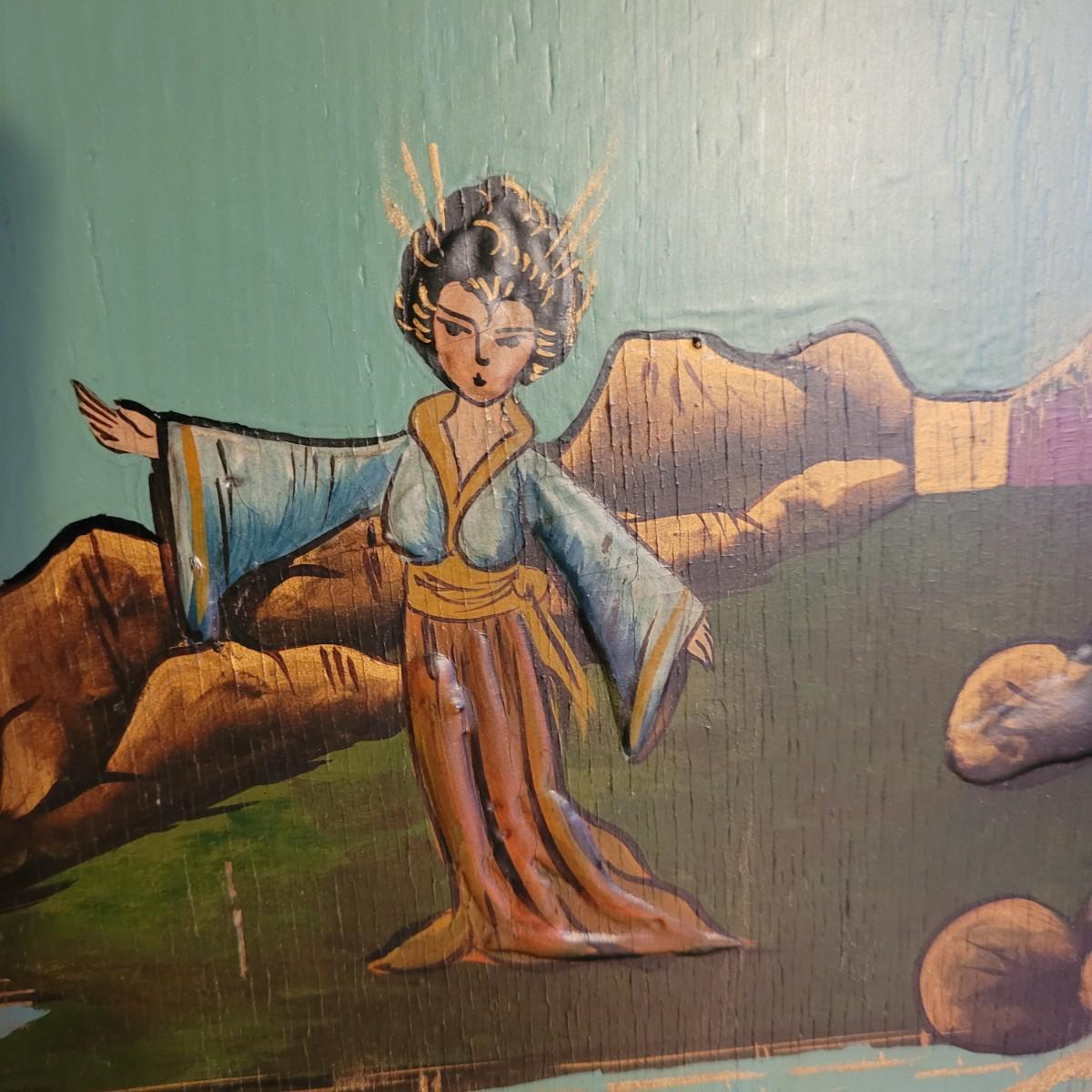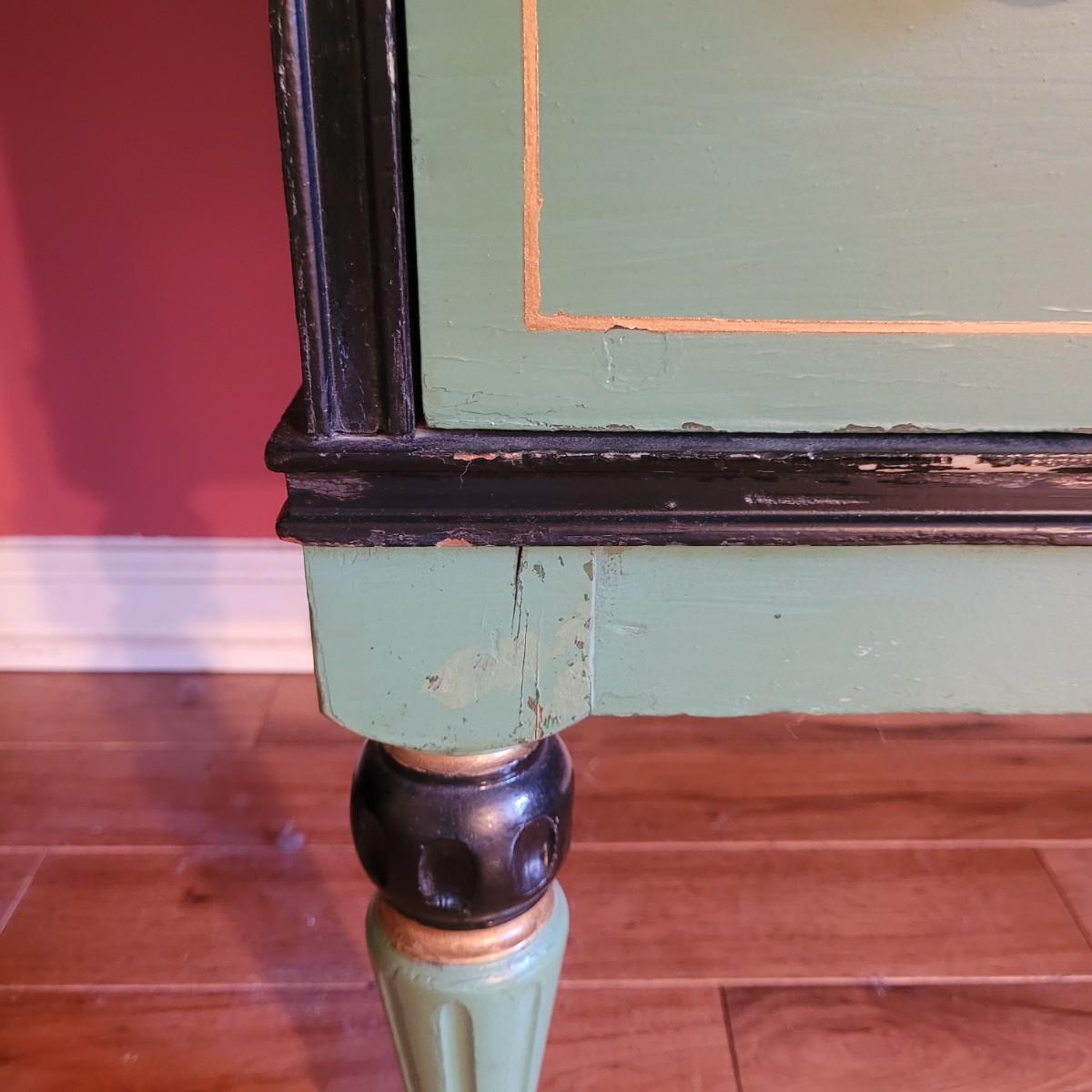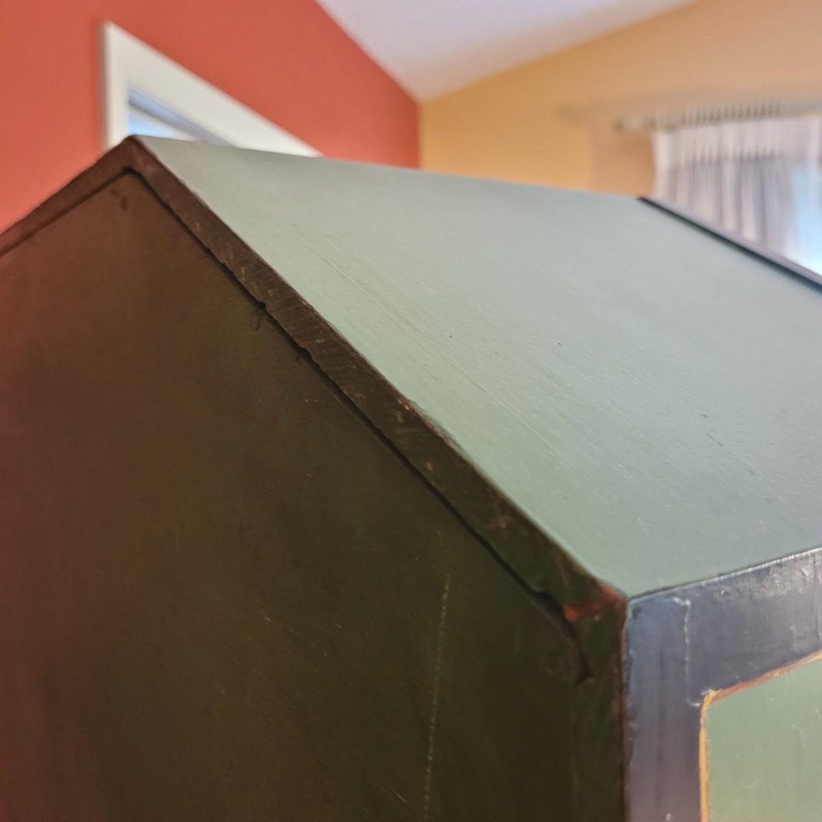 This engraved and hand painted cabinet depicts an Asian-style nature scene with inlaid, carved wooden decor. Drawers have dovetailed construction. No key is included. Note that two front legs are on risers to balance out furniture. Some chips and scuffs throughout (see photos). Measures approximately 33.5” x 14” x 64.5”H. Label states that it is from Al Carlson Mfg. Co. Local pickup only. Winning bidder must bring assistance to help move and load this item due to its weight and size. It is located on the main floor and will not need to be moved up or down any stairs.