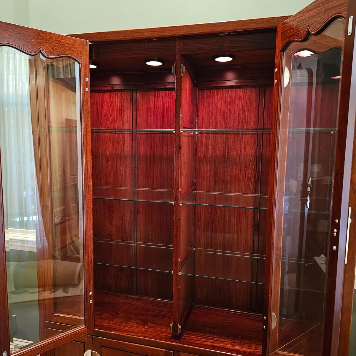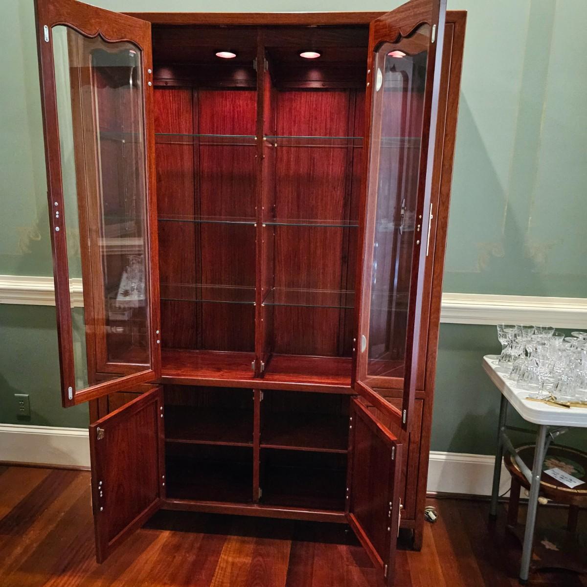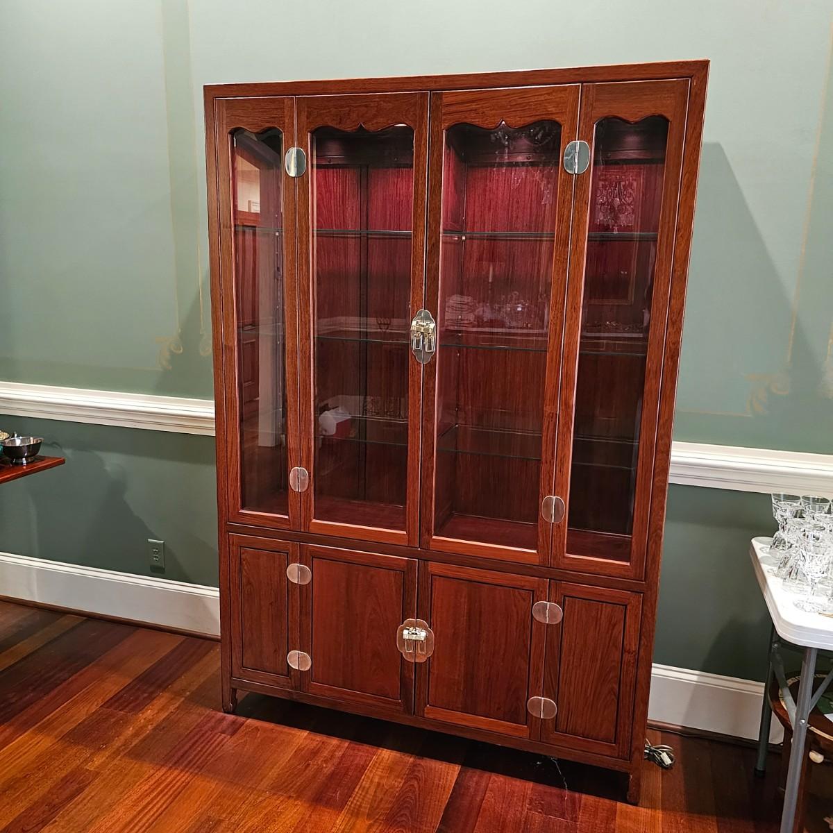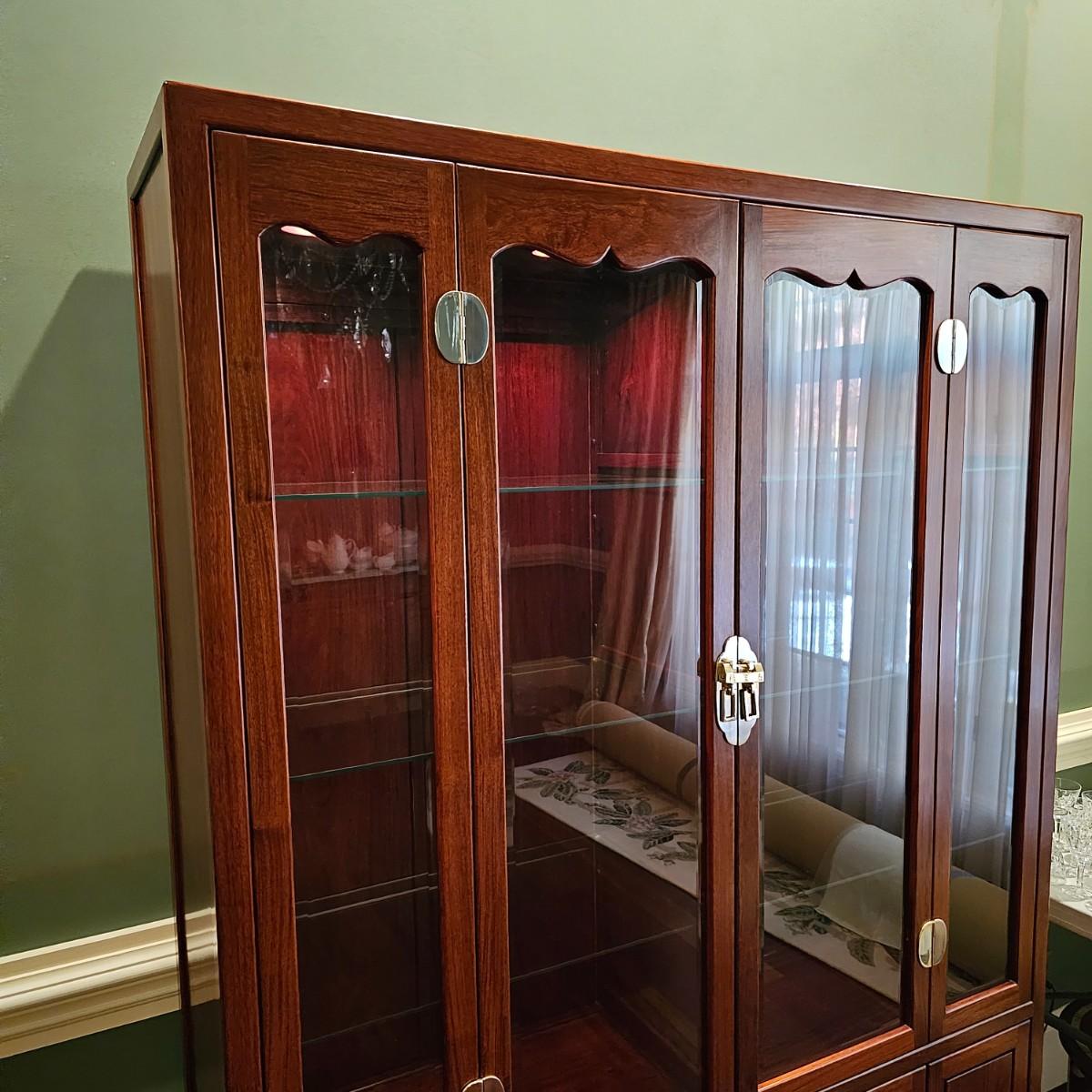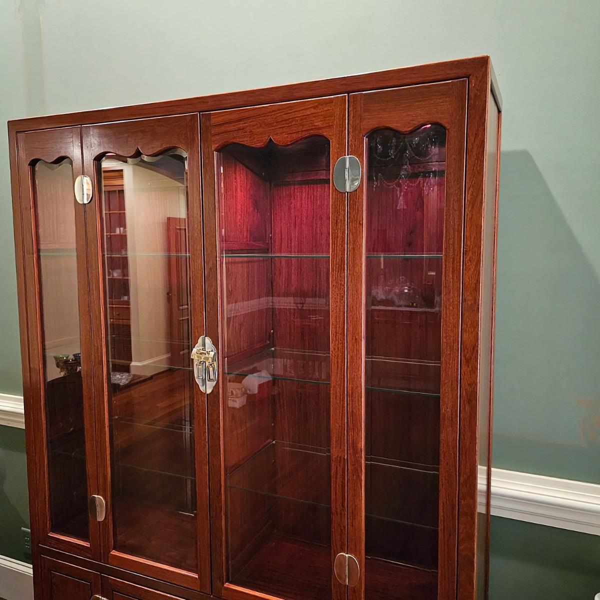Solid wood four door china cabinet with top lighting, glass shelves with plate channels and brass hardware, including 'puzzle style locks' with keys. Six glass shelves are adjustable. Cabinet measures 56" x 16" x 82"H, appears to be made of rosewood. Note that lower cabinet has one broken magnetic catch. Also matching sideboard/ storage piece in this auction. See photos for details. Local pickup only. Winning bidder must bring assistance to help move and load this item due to its weight and/or size.