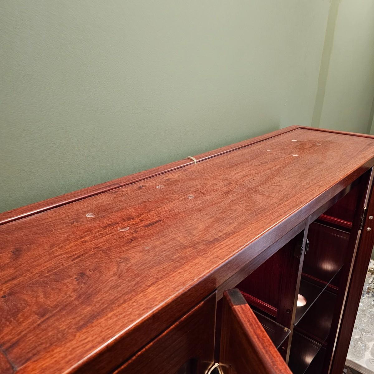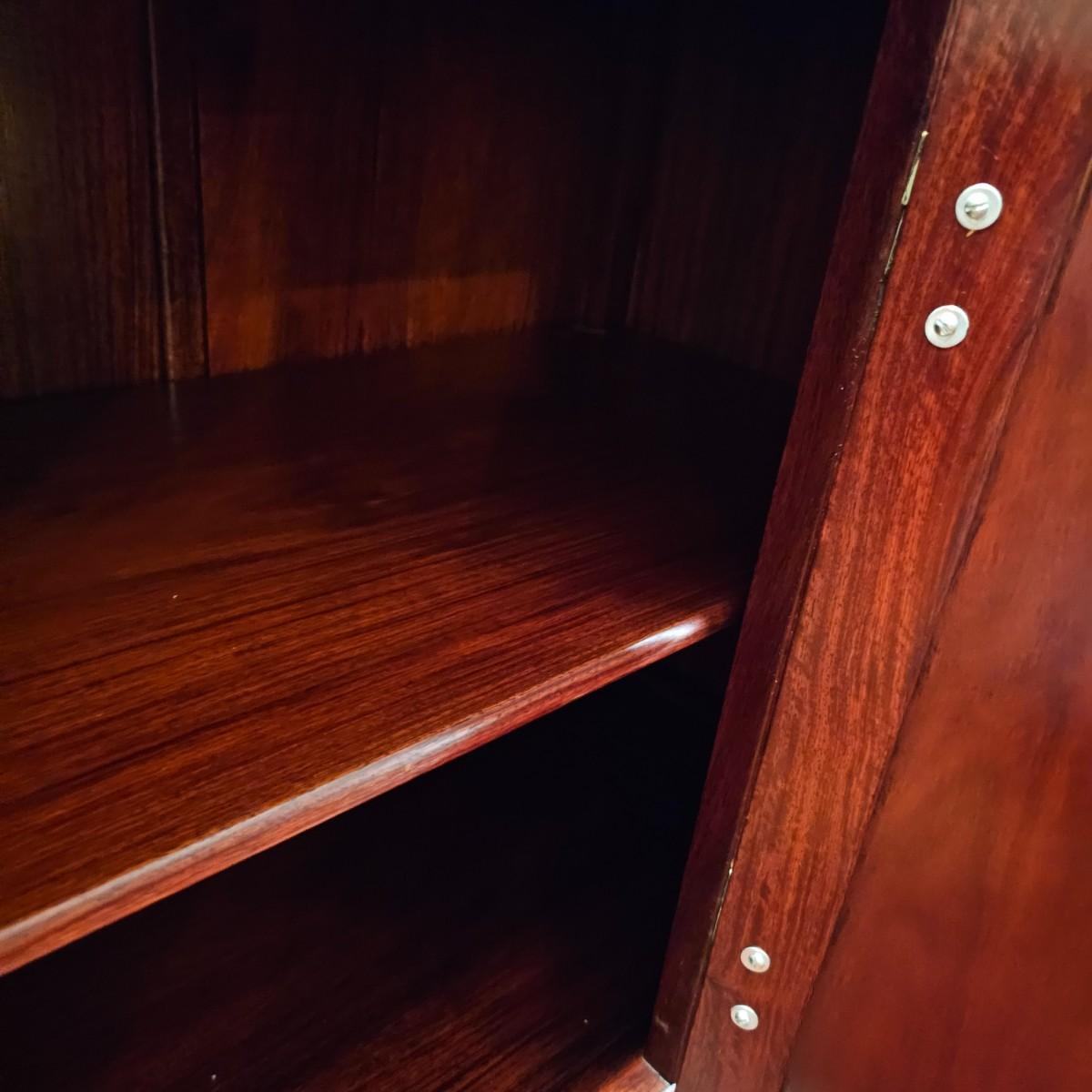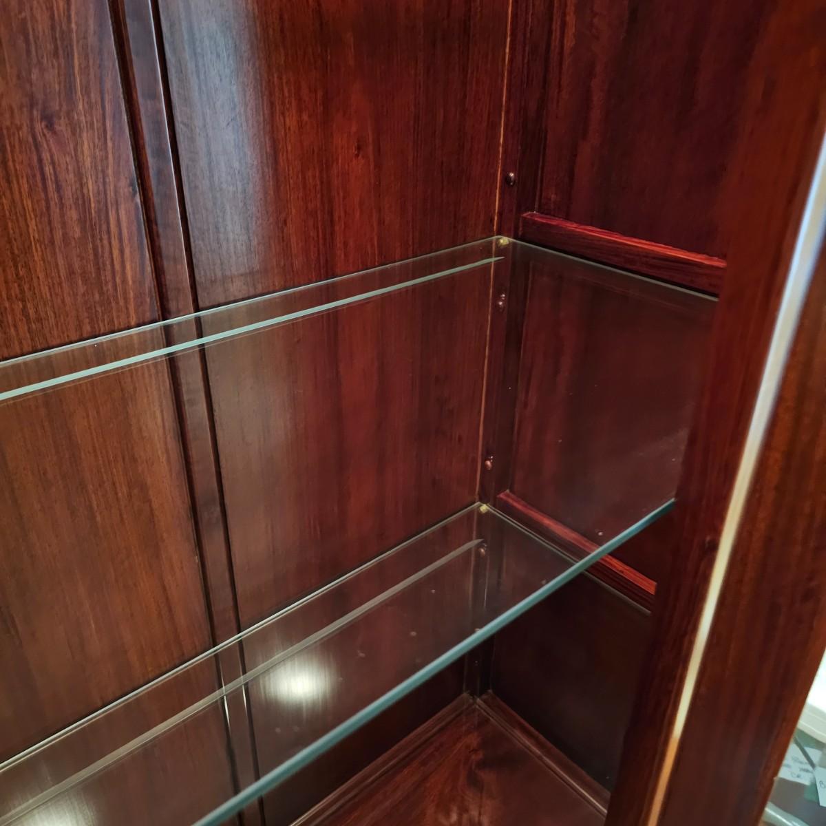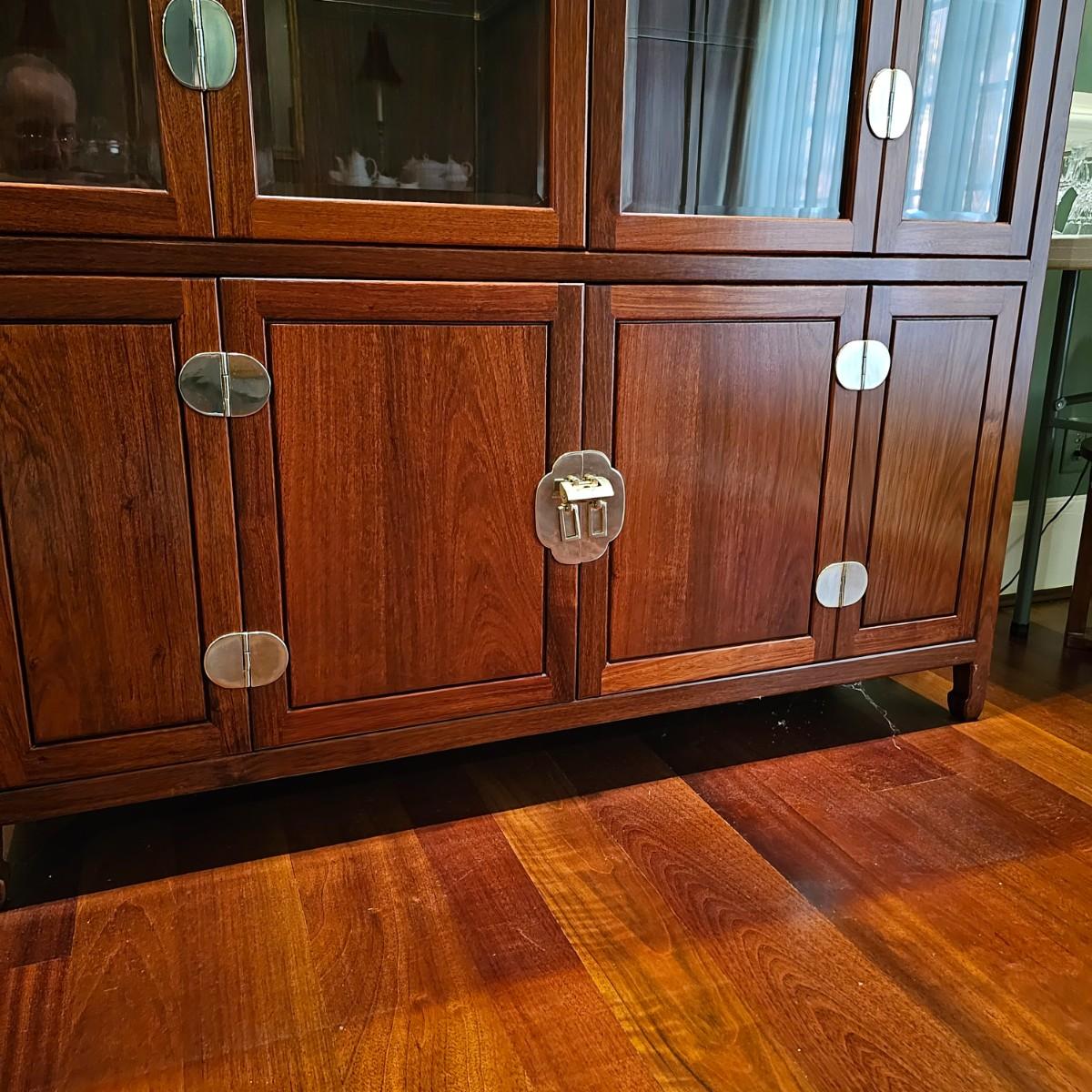 Solid wood four door china cabinet with top lighting, glass shelves with plate channels and brass hardware, including 'puzzle style locks' with keys. Six glass shelves are adjustable. Cabinet measures 56" x 16" x 82"H, appears to be made of rosewood. Note that lower cabinet has one broken magnetic catch. Also matching sideboard/ storage piece in this auction. See photos for details. Local pickup only. Winning bidder must bring assistance to help move and load this item due to its weight and/or size.