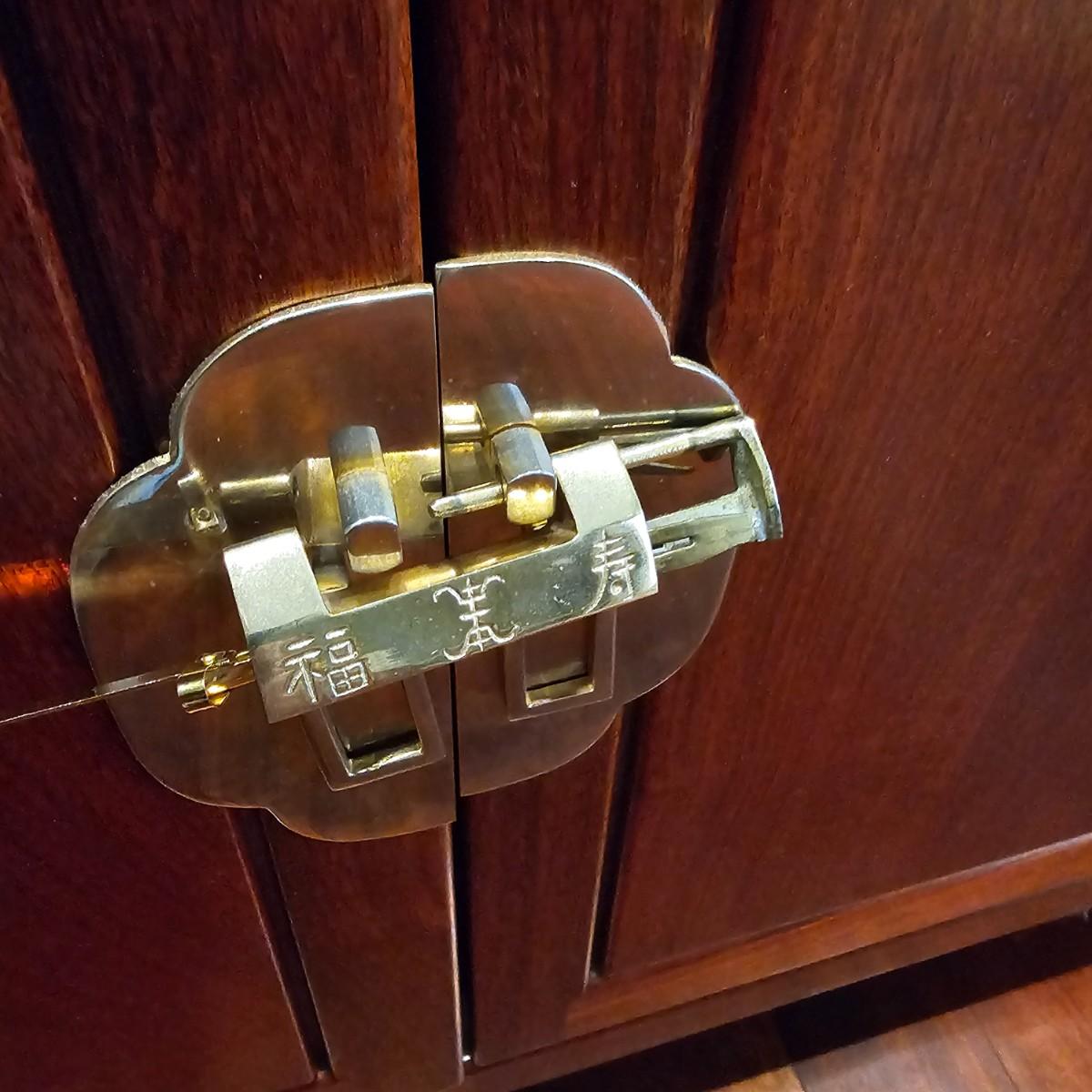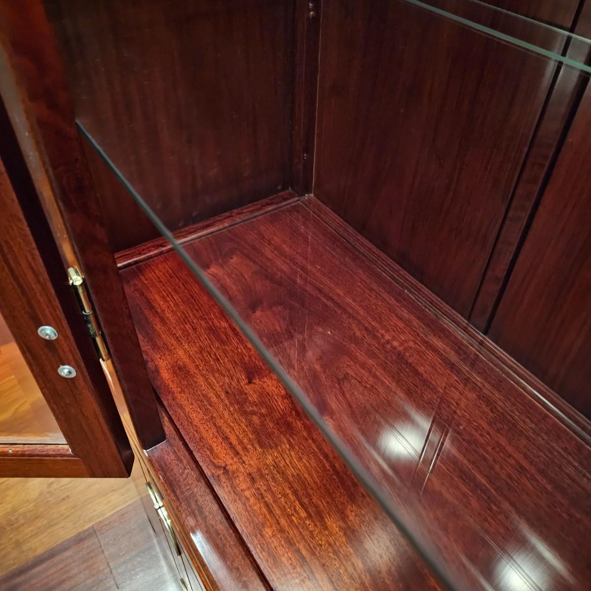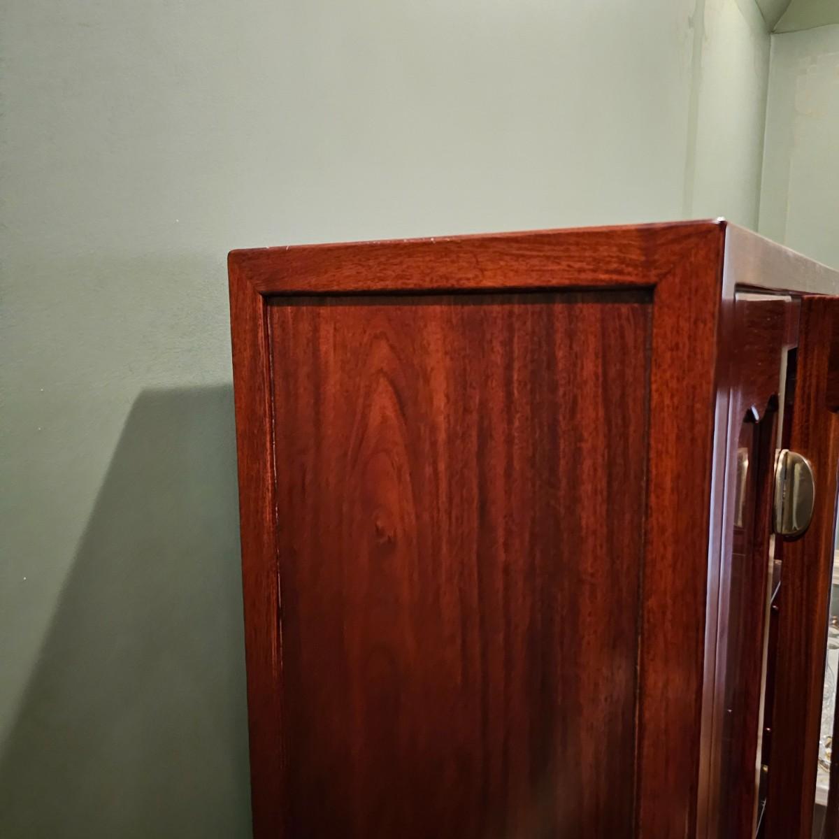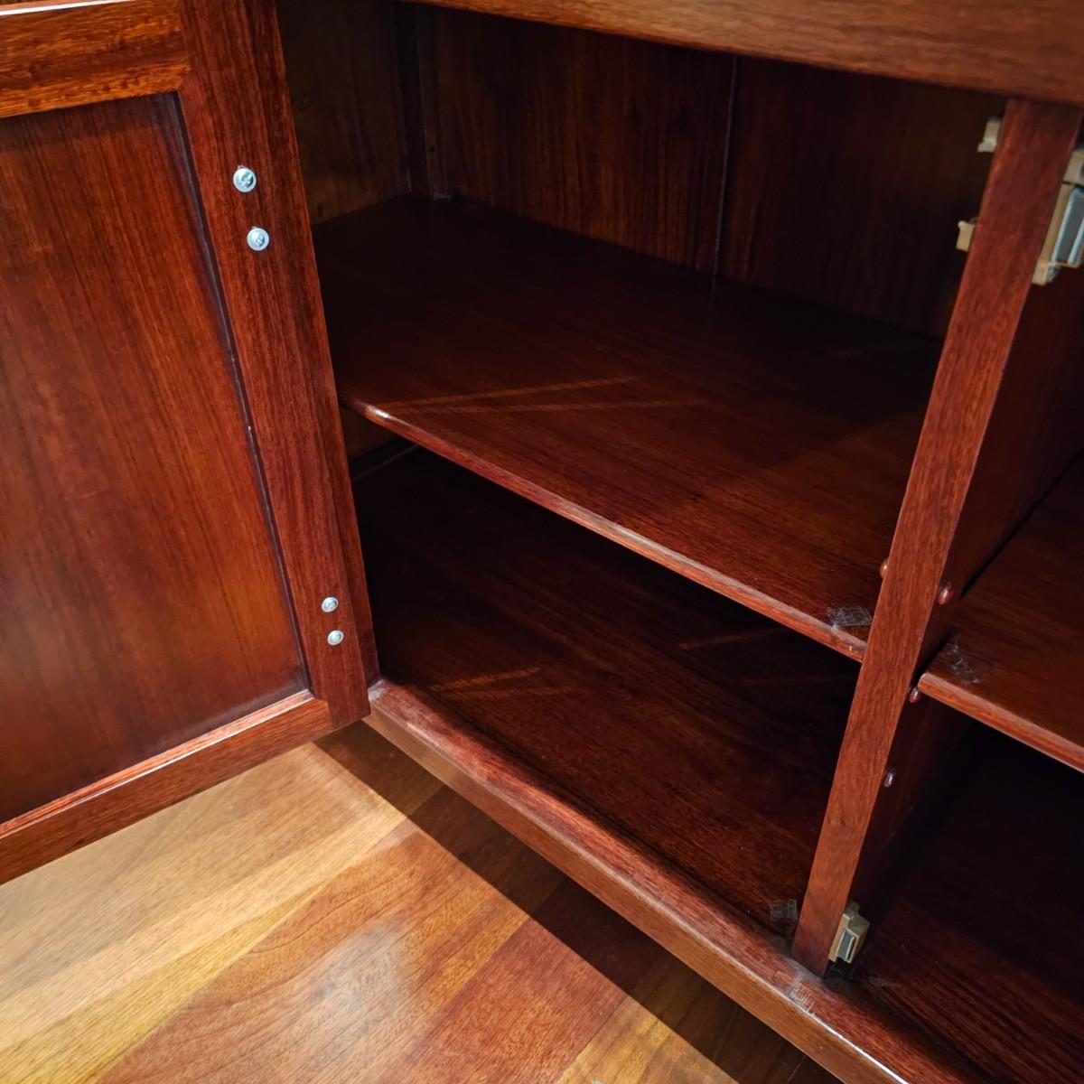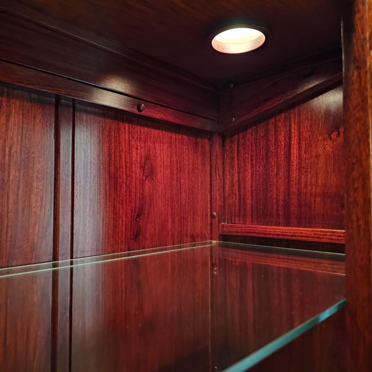 Solid wood four door china cabinet with top lighting, glass shelves with plate channels and brass hardware, including 'puzzle style locks' with keys. Six glass shelves are adjustable. Cabinet measures 56" x 16" x 82"H, appears to be made of rosewood. Note that lower cabinet has one broken magnetic catch. Also matching sideboard/ storage piece in this auction. See photos for details. Local pickup only. Winning bidder must bring assistance to help move and load this item due to its weight and/or size.