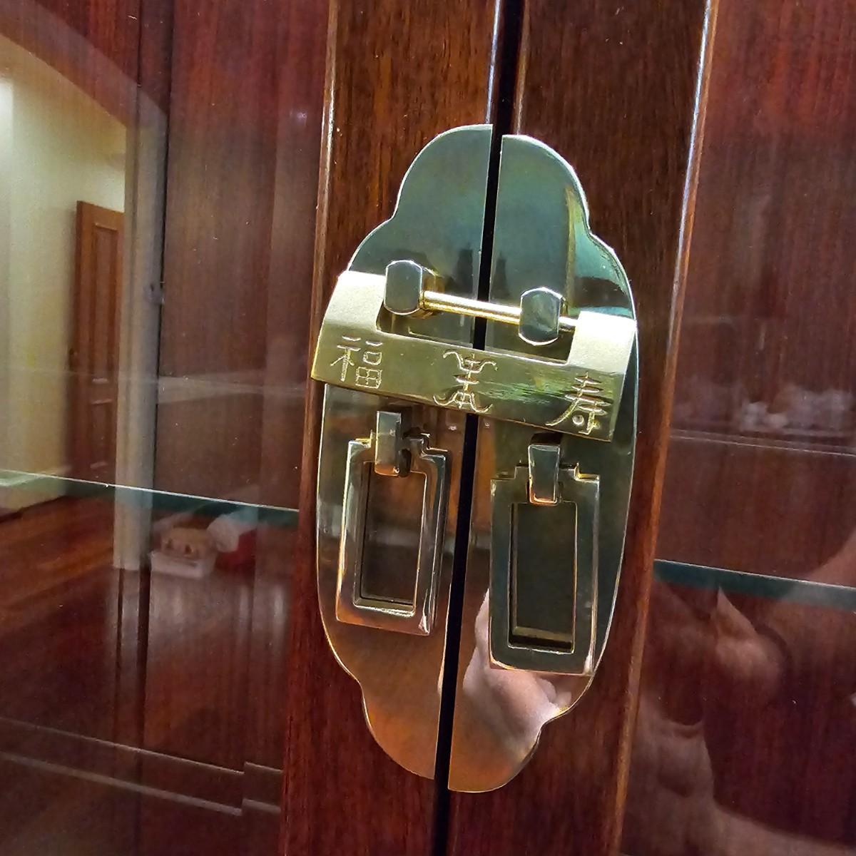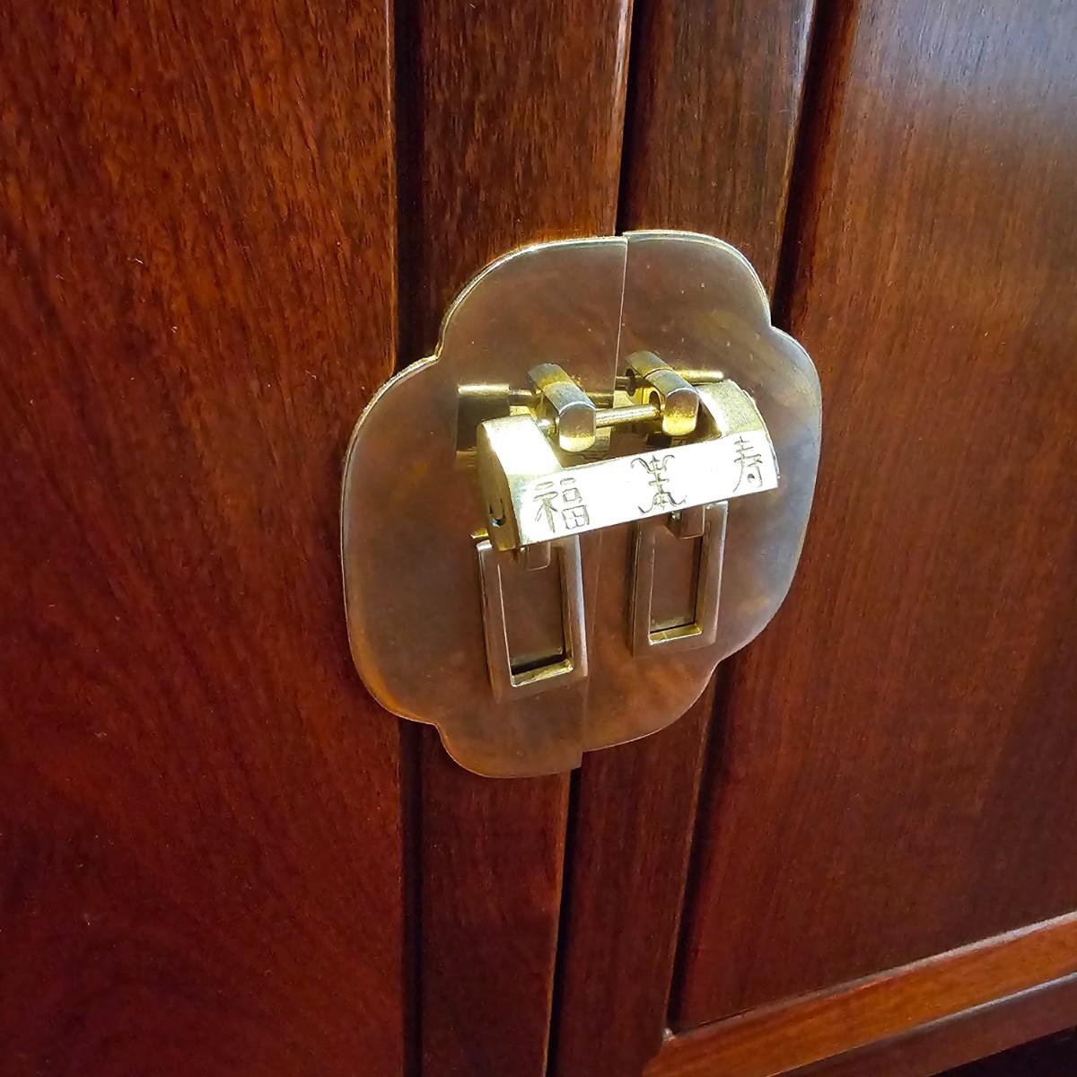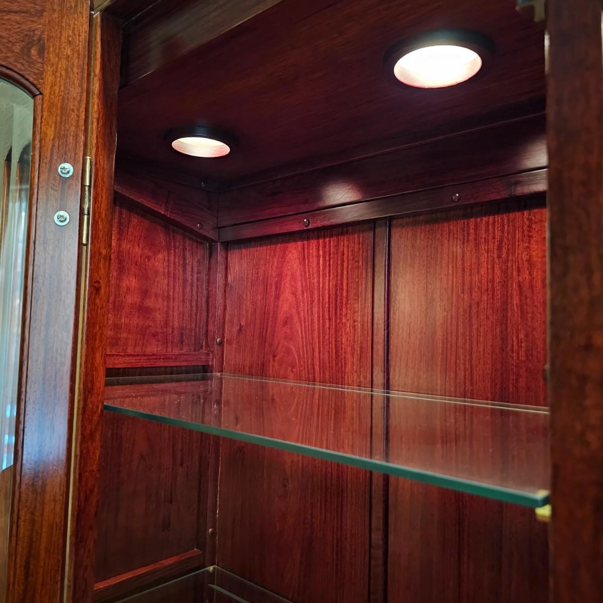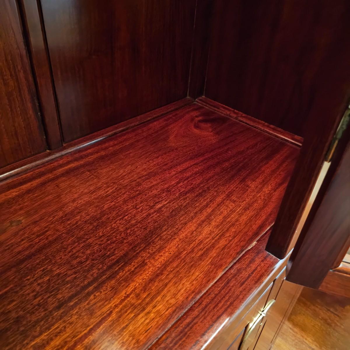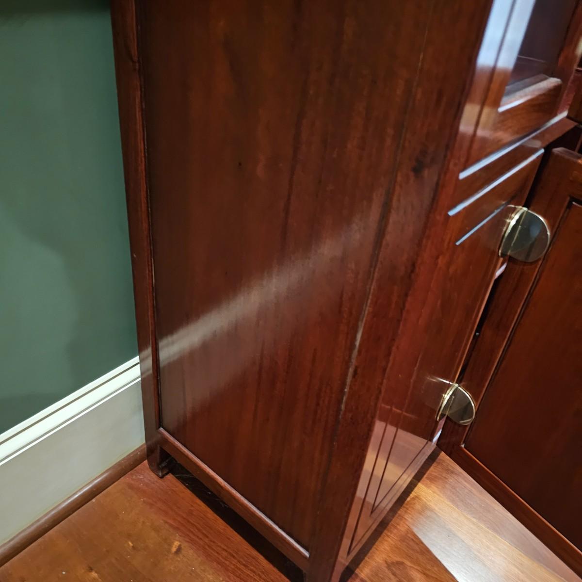 Solid wood four door china cabinet with top lighting, glass shelves with plate channels and brass hardware, including 'puzzle style locks' with keys. Six glass shelves are adjustable. Cabinet measures 56" x 16" x 82"H, appears to be made of rosewood. Note that lower cabinet has one broken magnetic catch. Also matching sideboard/ storage piece in this auction. See photos for details. Local pickup only. Winning bidder must bring assistance to help move and load this item due to its weight and/or size.