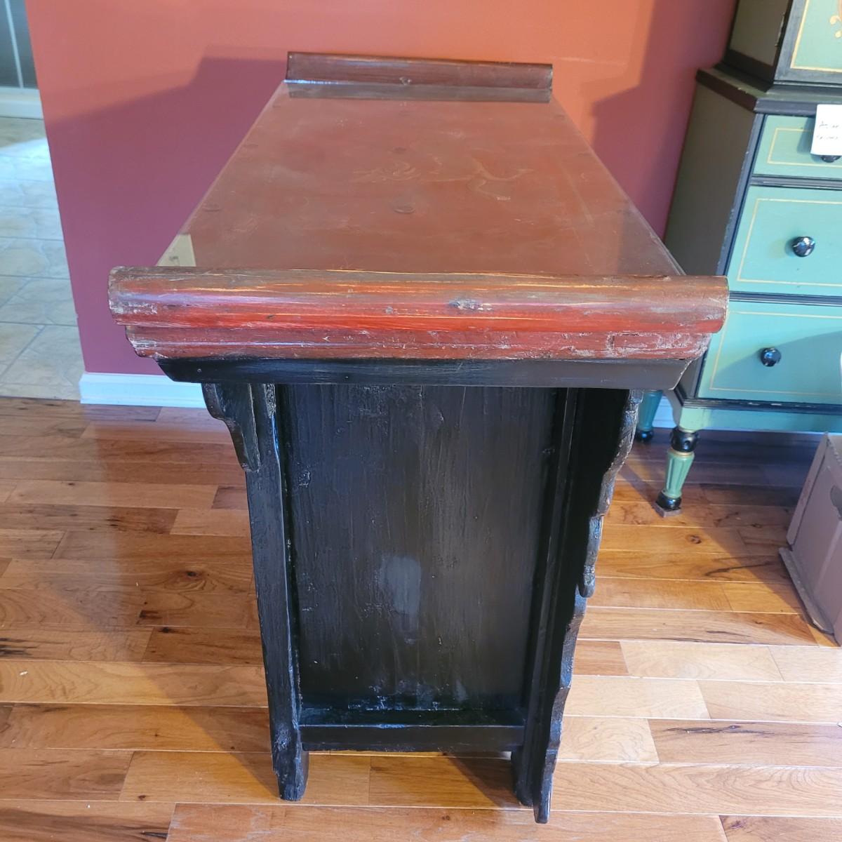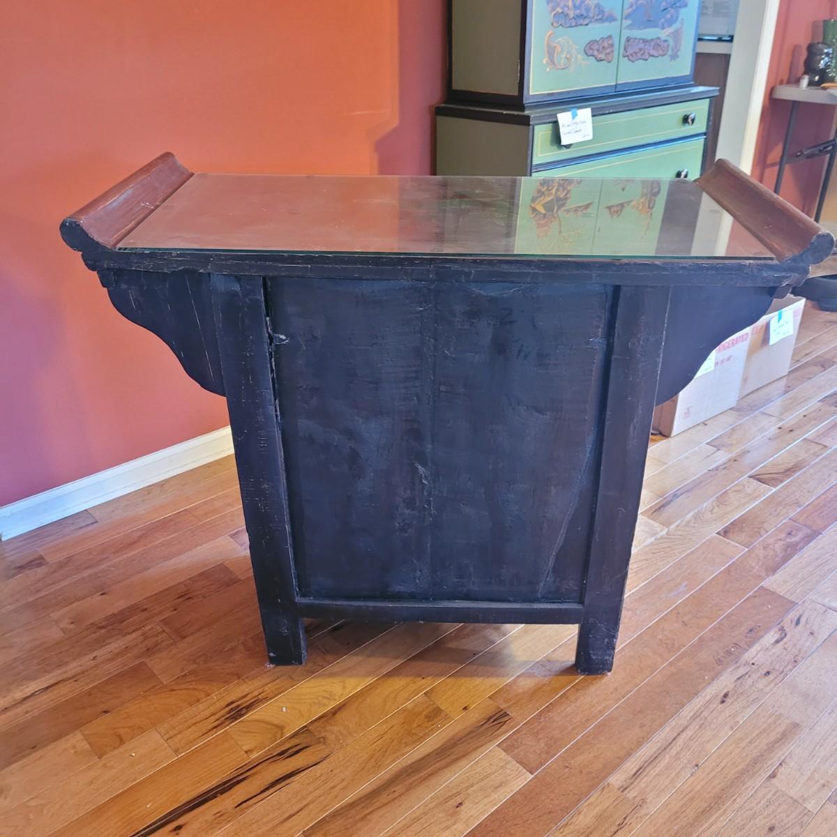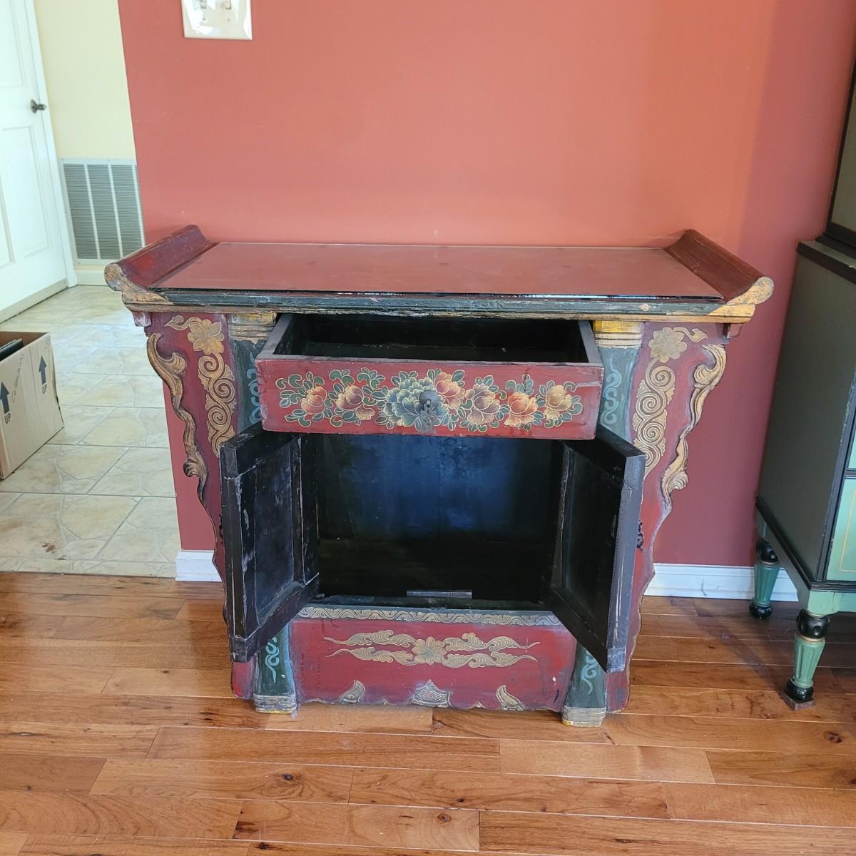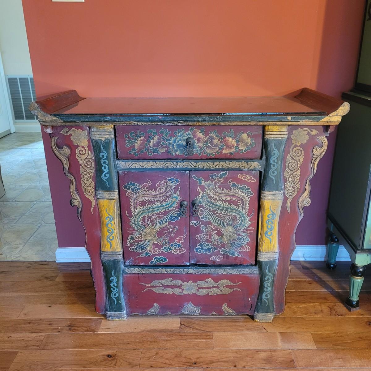 This Asian style engraved and painted cabinet depicts phoenix dragons on the cabinet doors and an elephant on the tabletop, surrounded by floral motifs. Some scuffs and chips throughout (see photos). Measures approximately 40” x 17.5” x 32.5”H. Local pickup only. Winning bidder must bring assistance to help move and load this item due to its weight and size.