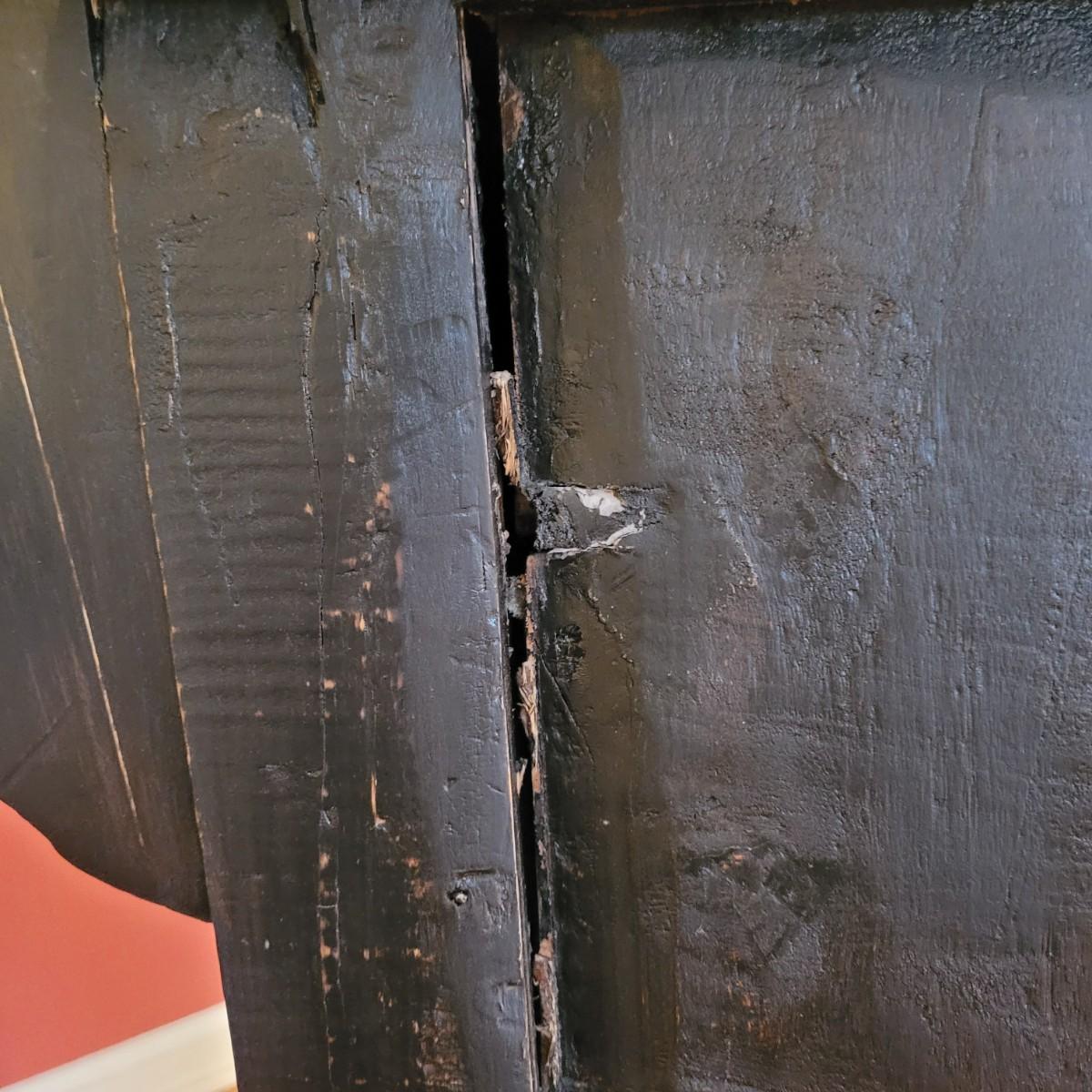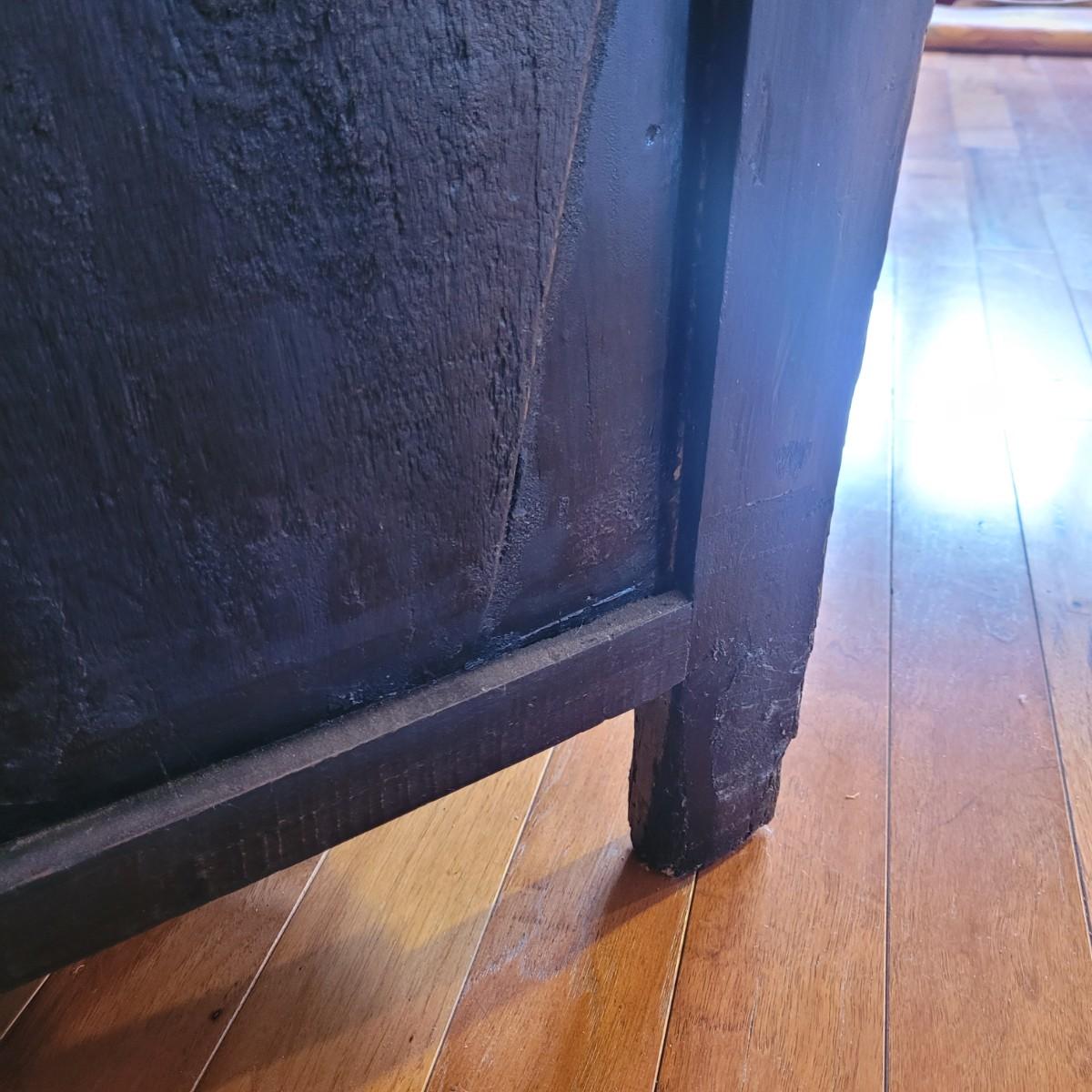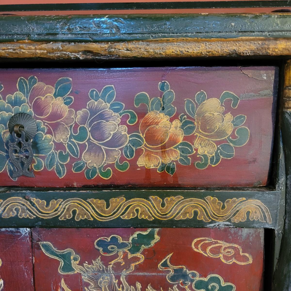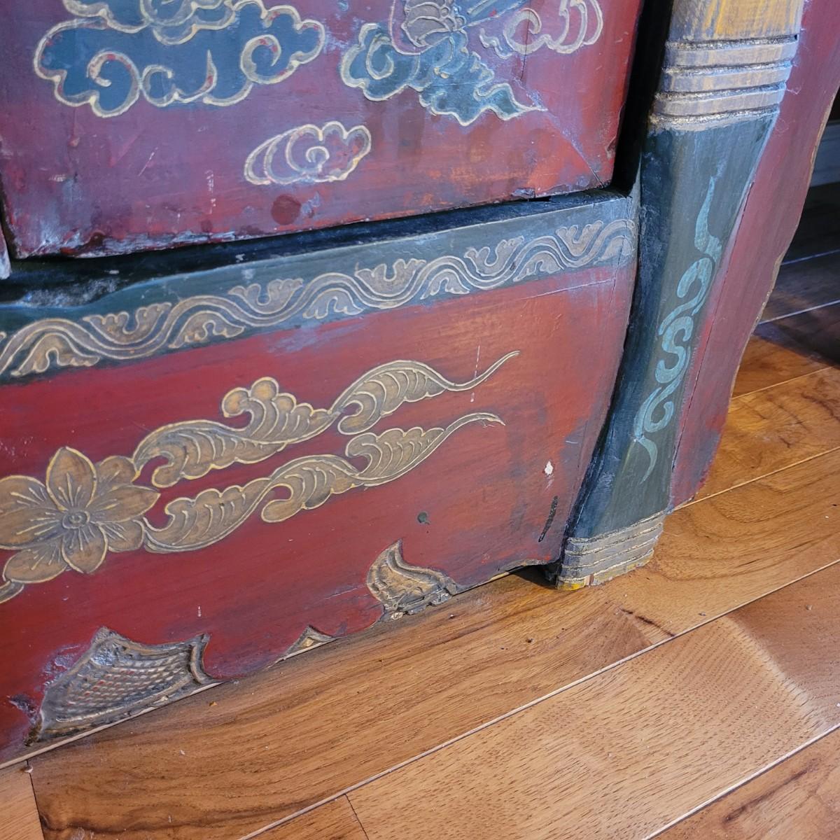 This Asian style engraved and painted cabinet depicts phoenix dragons on the cabinet doors and an elephant on the tabletop, surrounded by floral motifs. Some scuffs and chips throughout (see photos). Measures approximately 40” x 17.5” x 32.5”H. Local pickup only. Winning bidder must bring assistance to help move and load this item due to its weight and size.