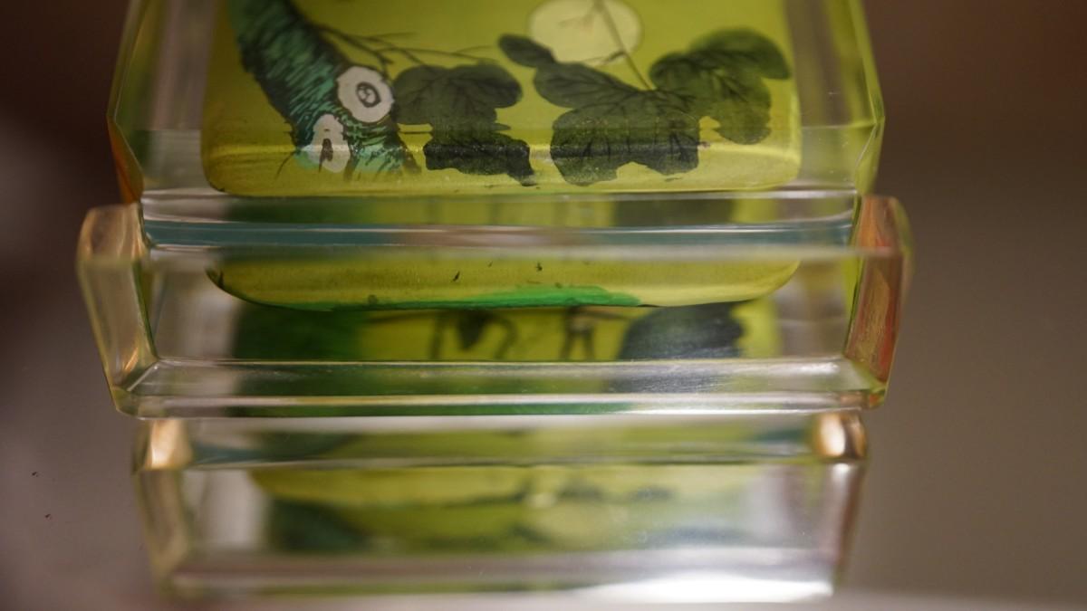 the interior bottle holds the perfume of your choice. the green frosted interior bottle has been hand painted with Japanese lettering. The stopper is a glass opaque dome with a rubber stopper.