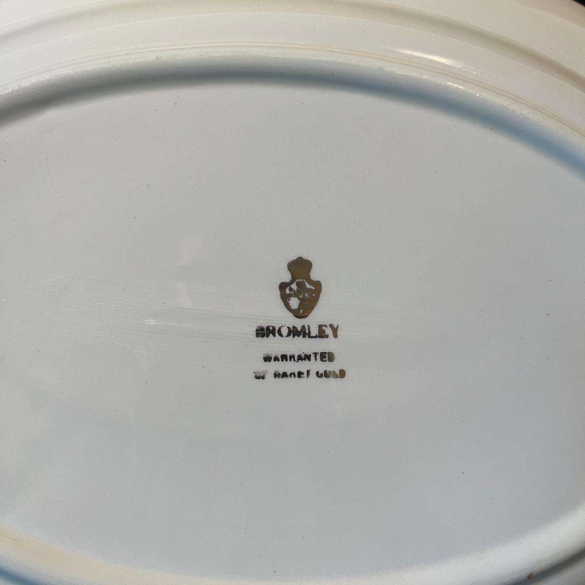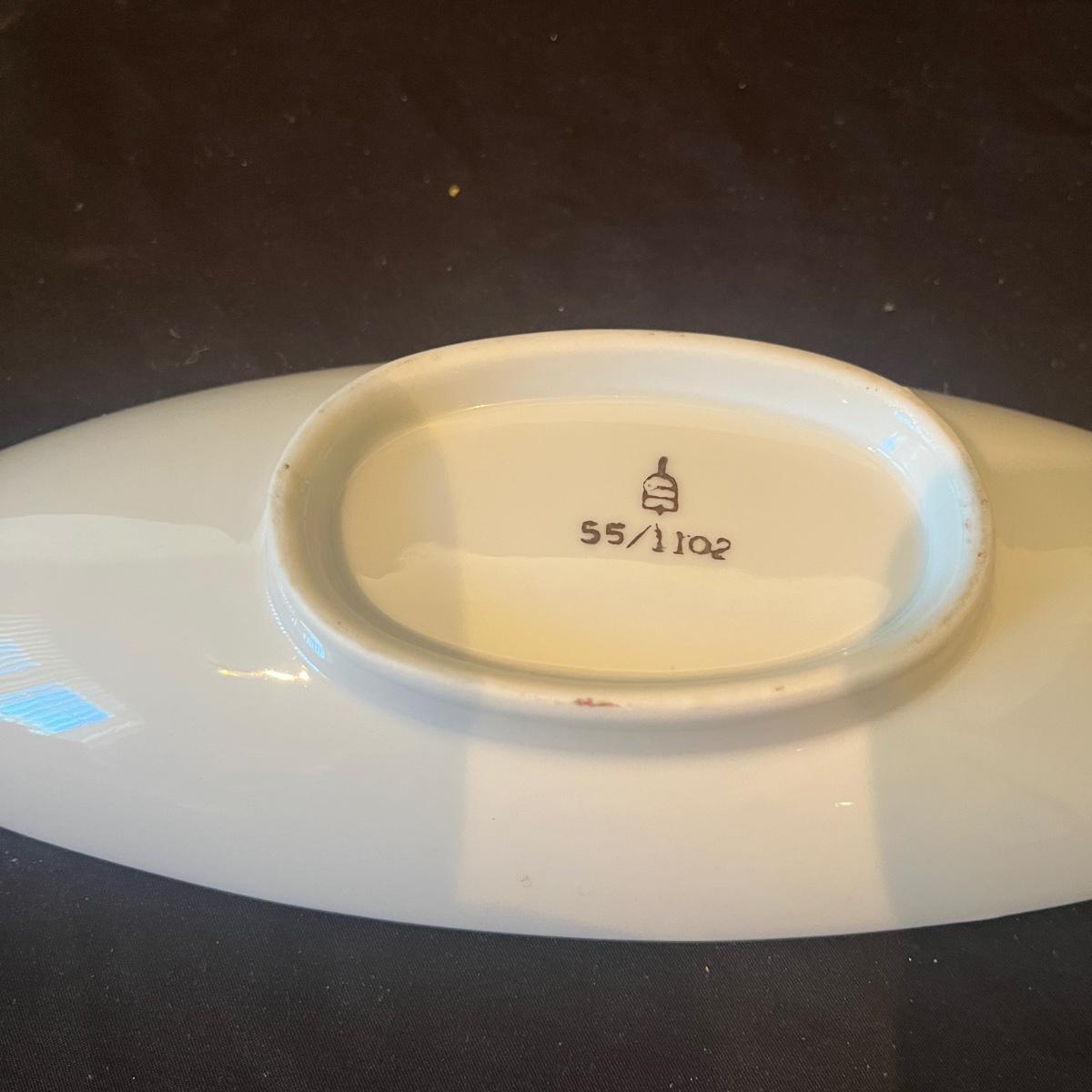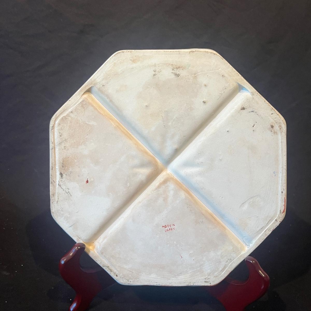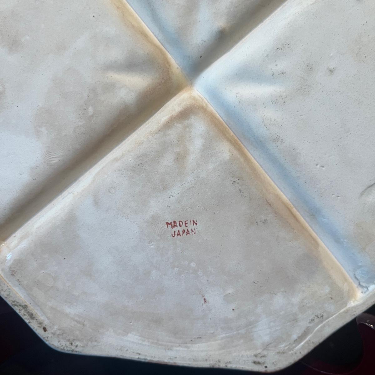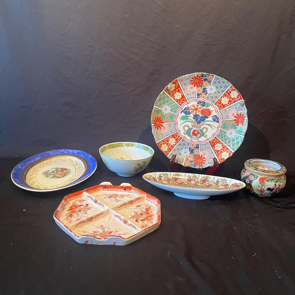 Lot includes two plates, sectioned plate, oblong dish, round dish and a bowl. Round plate measures 10”D.
