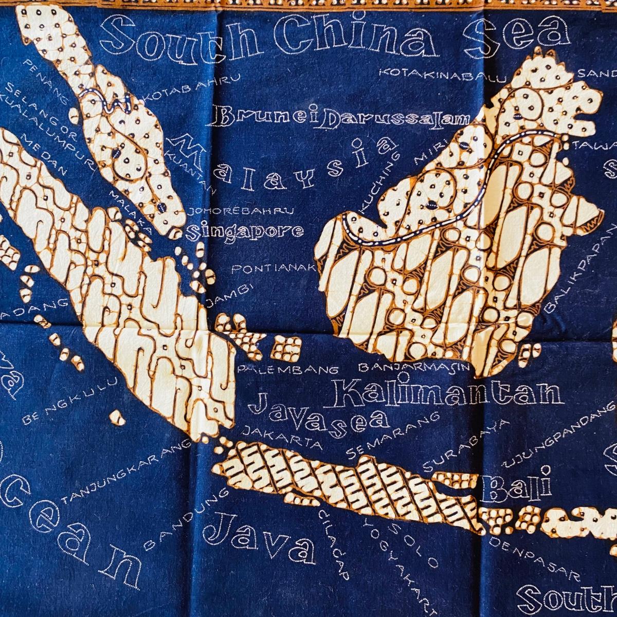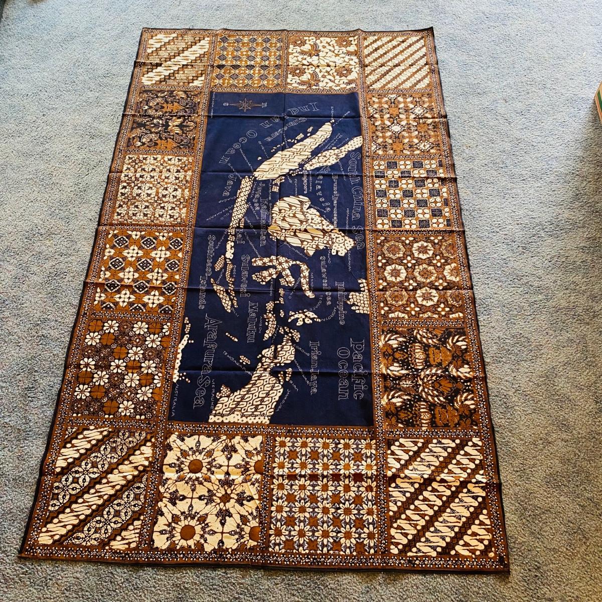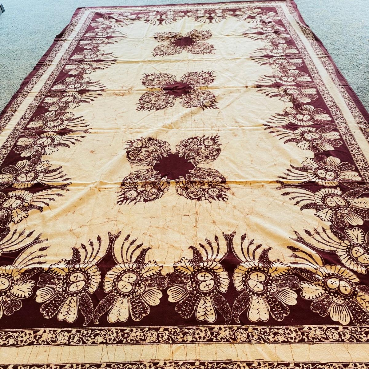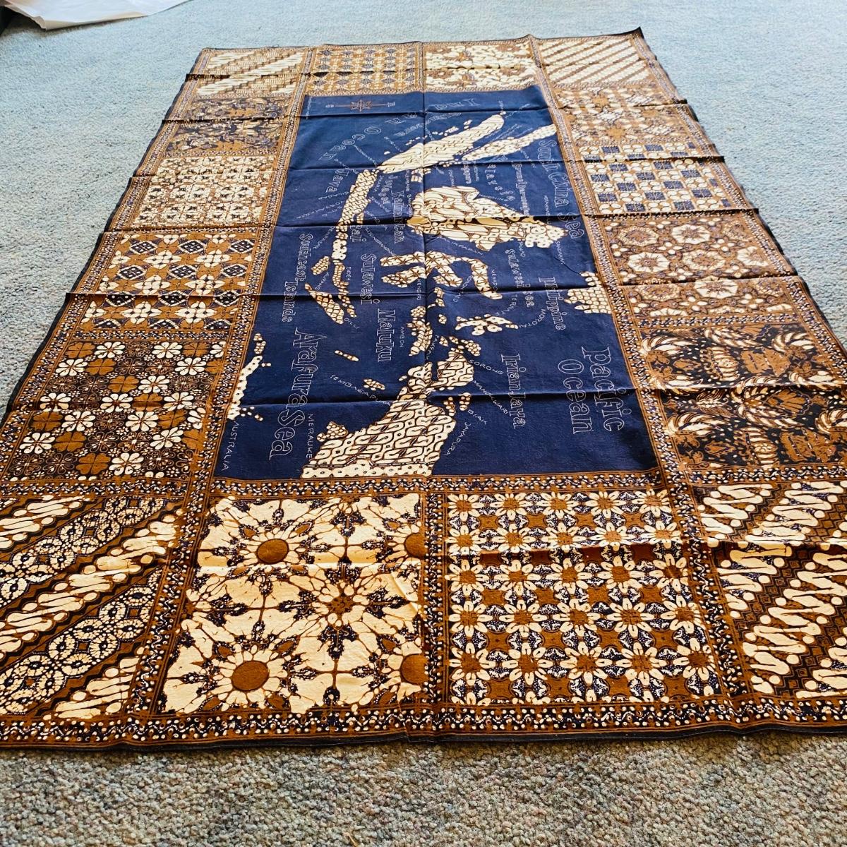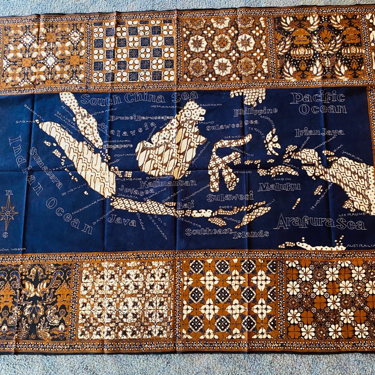 Six Asian tapestries and one fabric swatch. Four tapestries with map of Southeast Asia measures 69” x 40”. Square blue and brown tapestry measures 40” x 40”. Swatch measures 46” x 38”. Large white and maroon tapestry measures 90” x 52”. Two copper painted glass decanters with stoppers from Andros Distillery in Tilburg, Holland Tall decanter measures 12”H. All in good condition.
