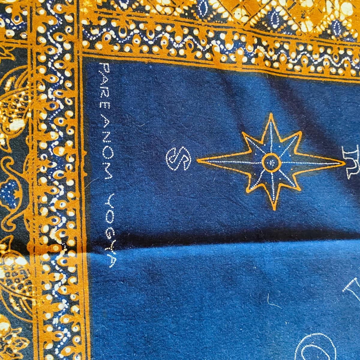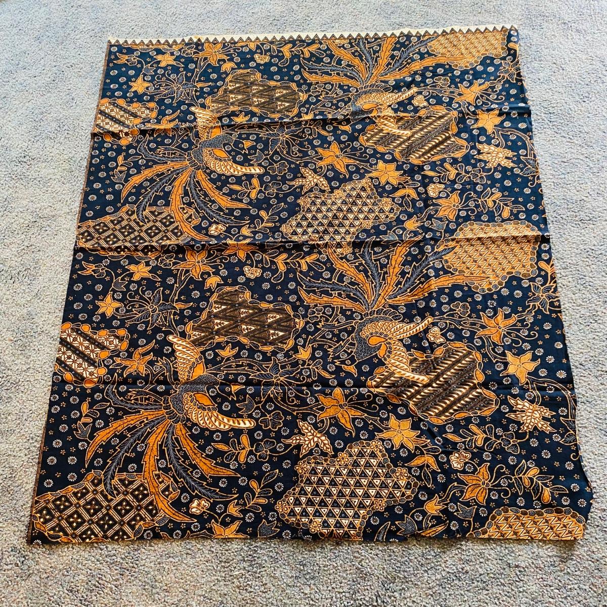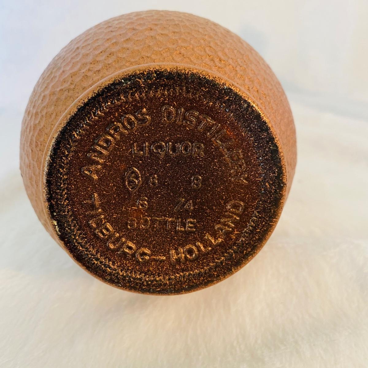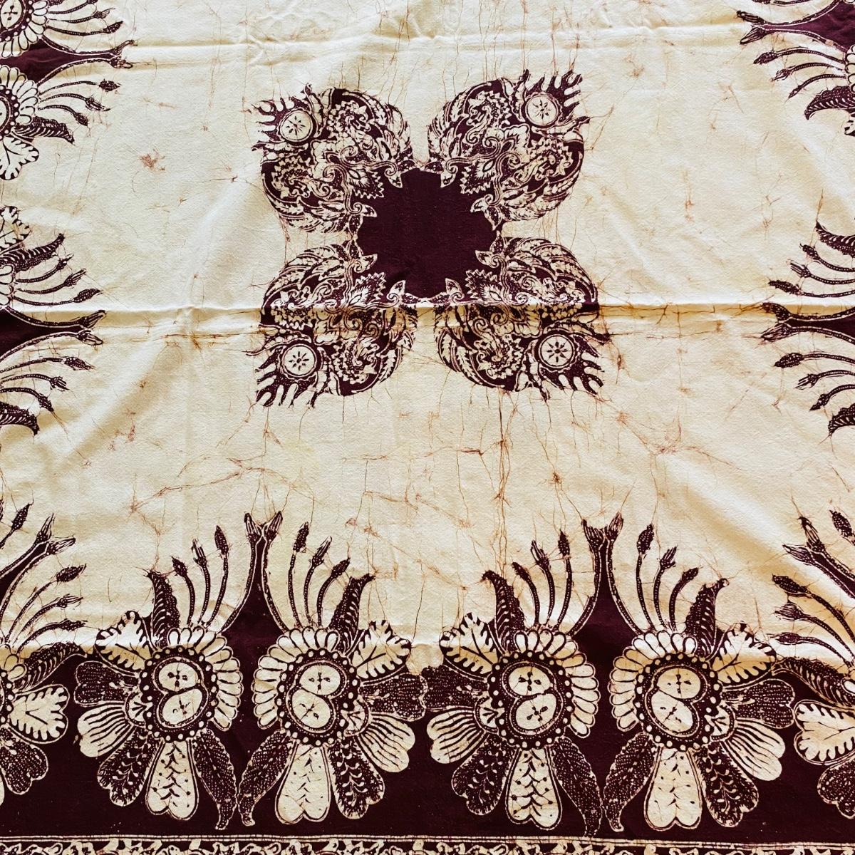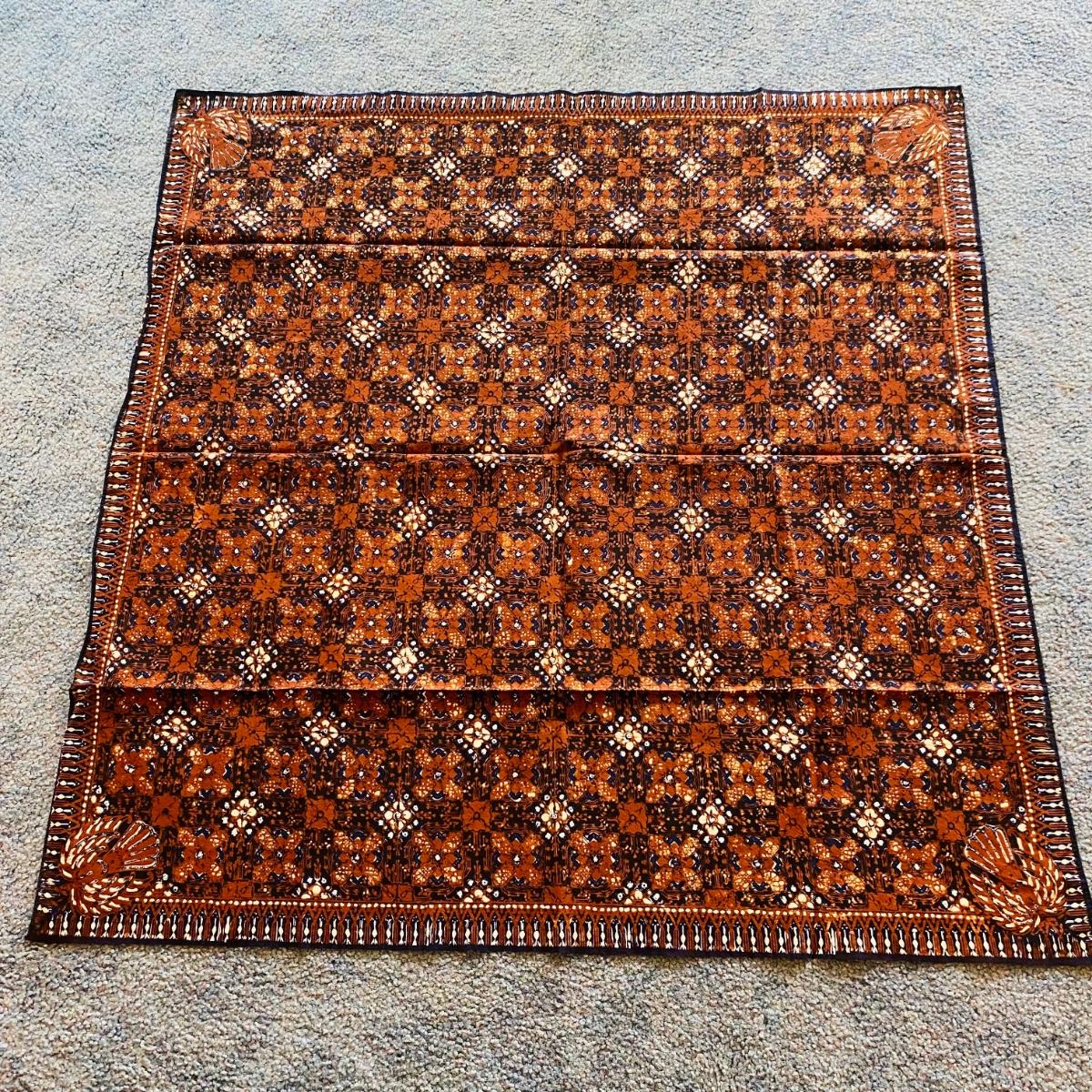 Six Asian tapestries and one fabric swatch. Four tapestries with map of Southeast Asia measures 69” x 40”. Square blue and brown tapestry measures 40” x 40”. Swatch measures 46” x 38”. Large white and maroon tapestry measures 90” x 52”. Two copper painted glass decanters with stoppers from Andros Distillery in Tilburg, Holland Tall decanter measures 12”H. All in good condition.