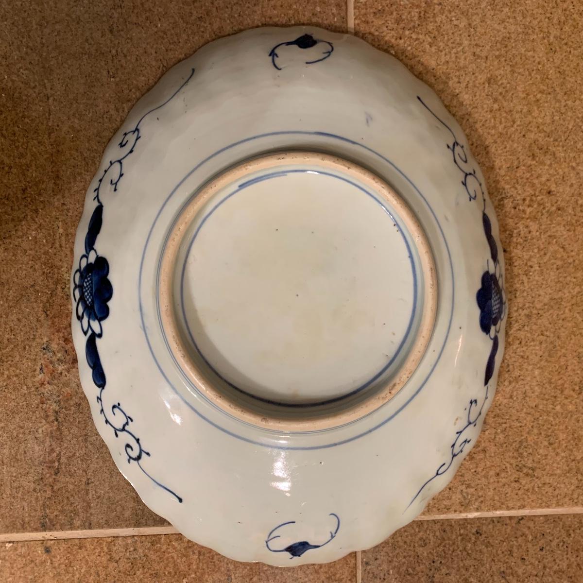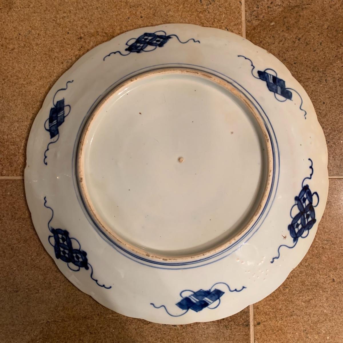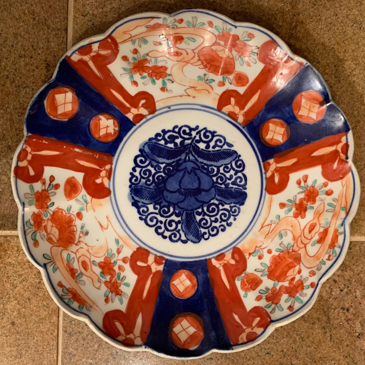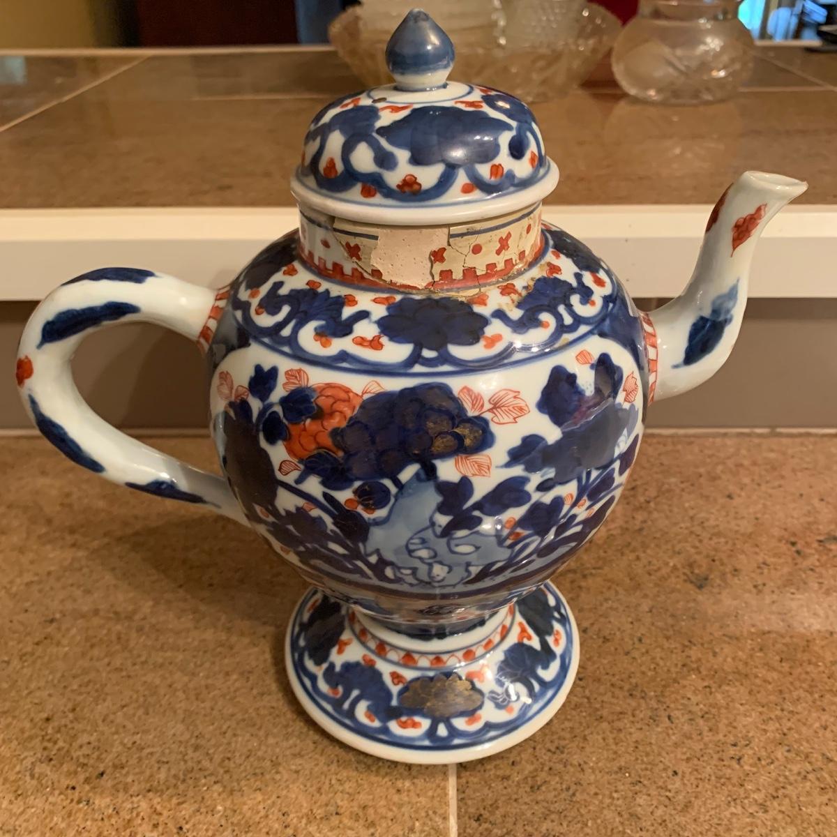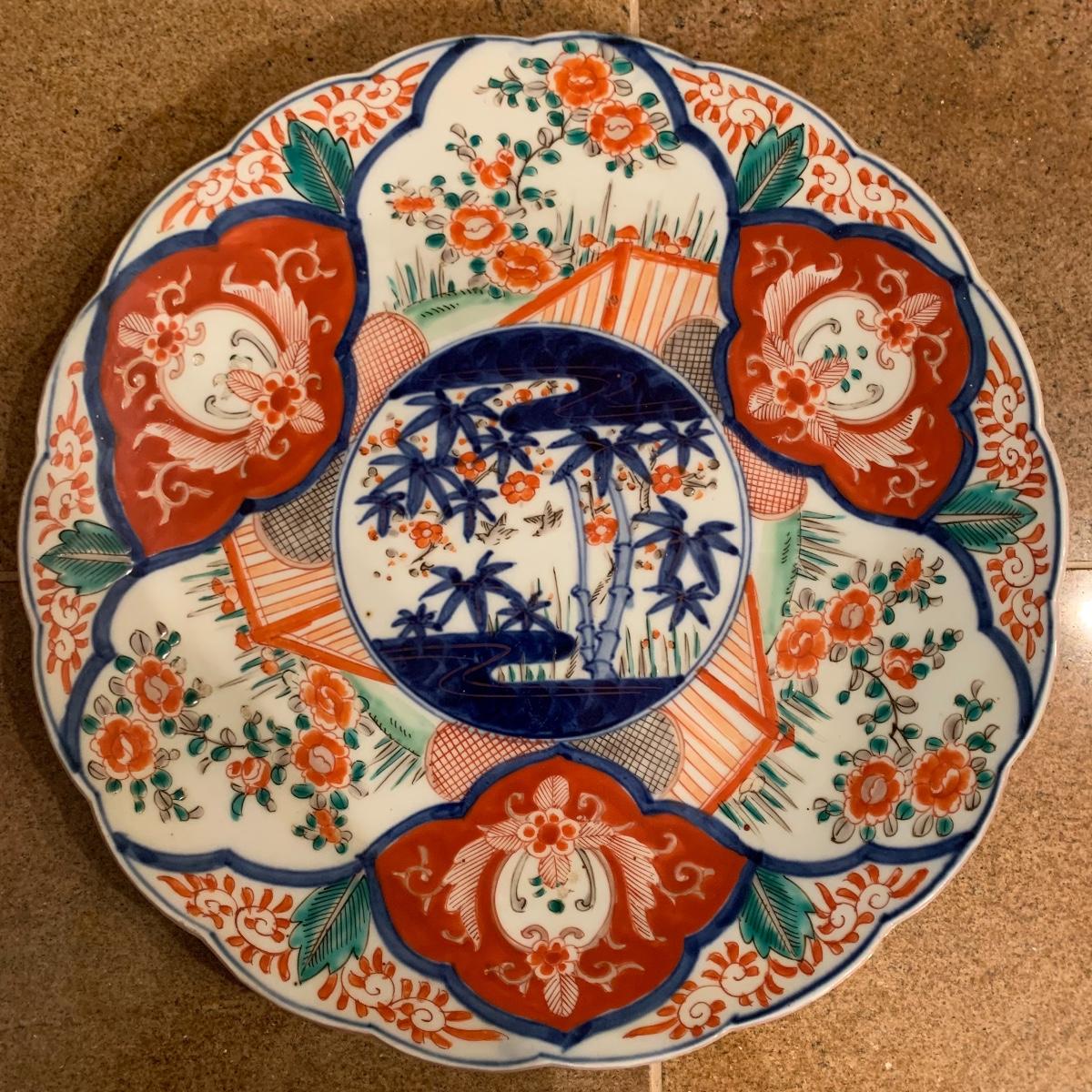 This beautiful group includes a tea pot measuring 10” tall, as well as three plates and a bowl that neatly nest together and make a great display. Tea pots is chipped and has been repaired around the top rim. There is a large bowl and small bowl and fan shaped plate as well as a brass adjustable footed stand. Shipping available.