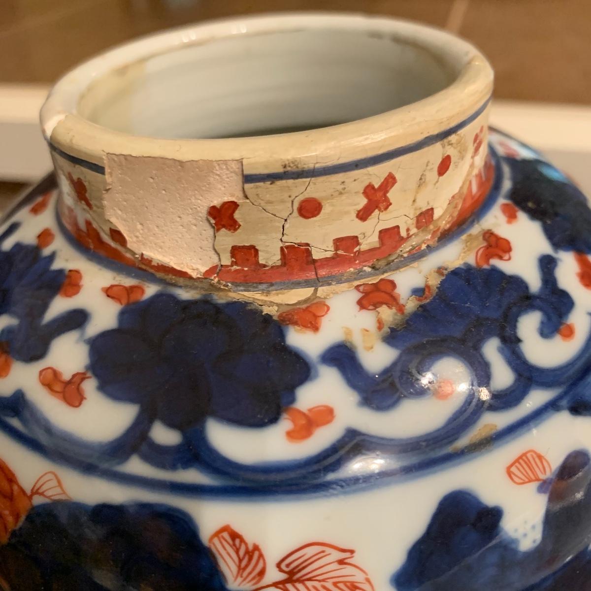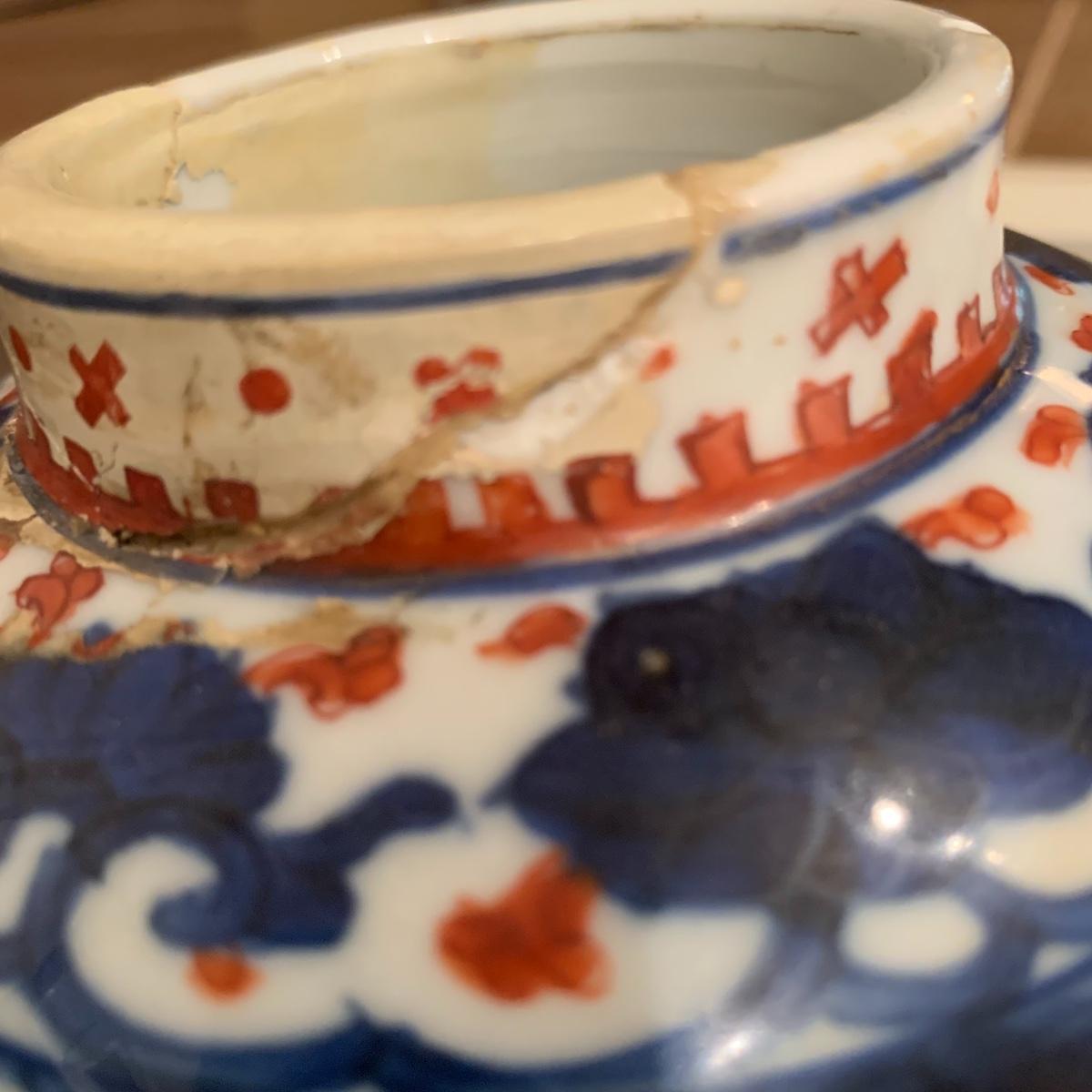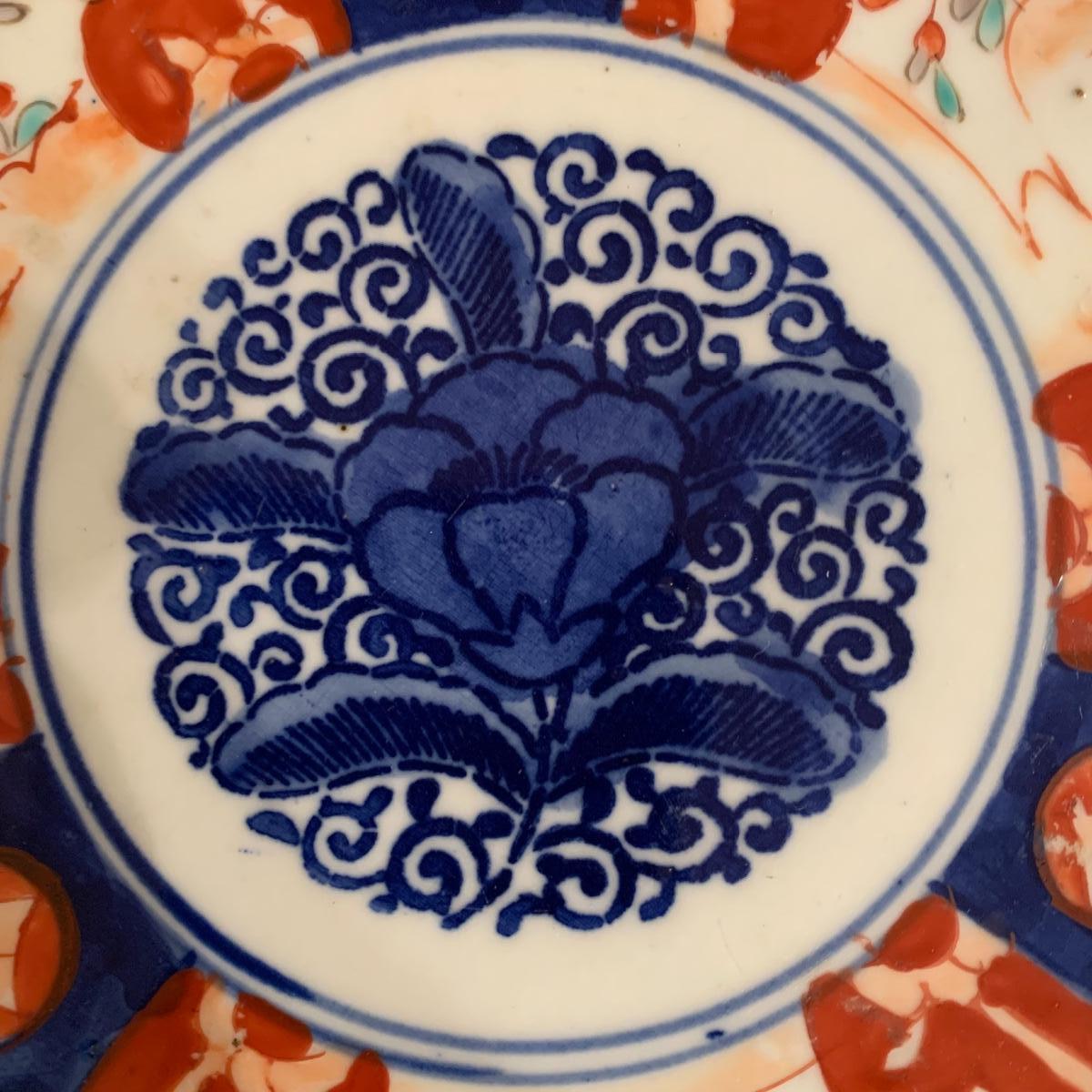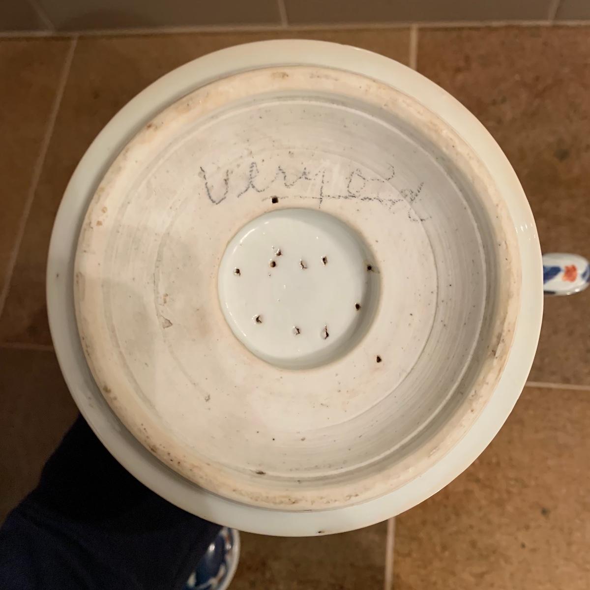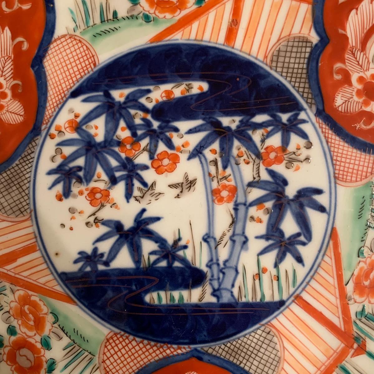 This beautiful group includes a tea pot measuring 10” tall, as well as three plates and a bowl that neatly nest together and make a great display. Tea pots is chipped and has been repaired around the top rim. There is a large bowl and small bowl and fan shaped plate as well as a brass adjustable footed stand. Shipping available.