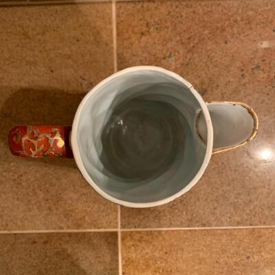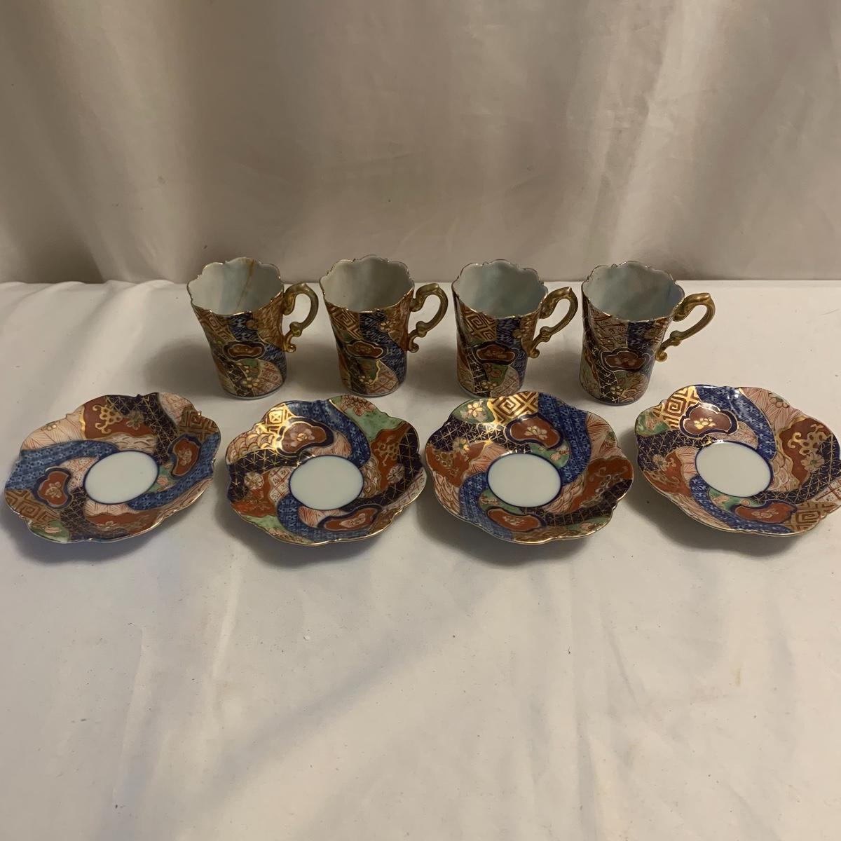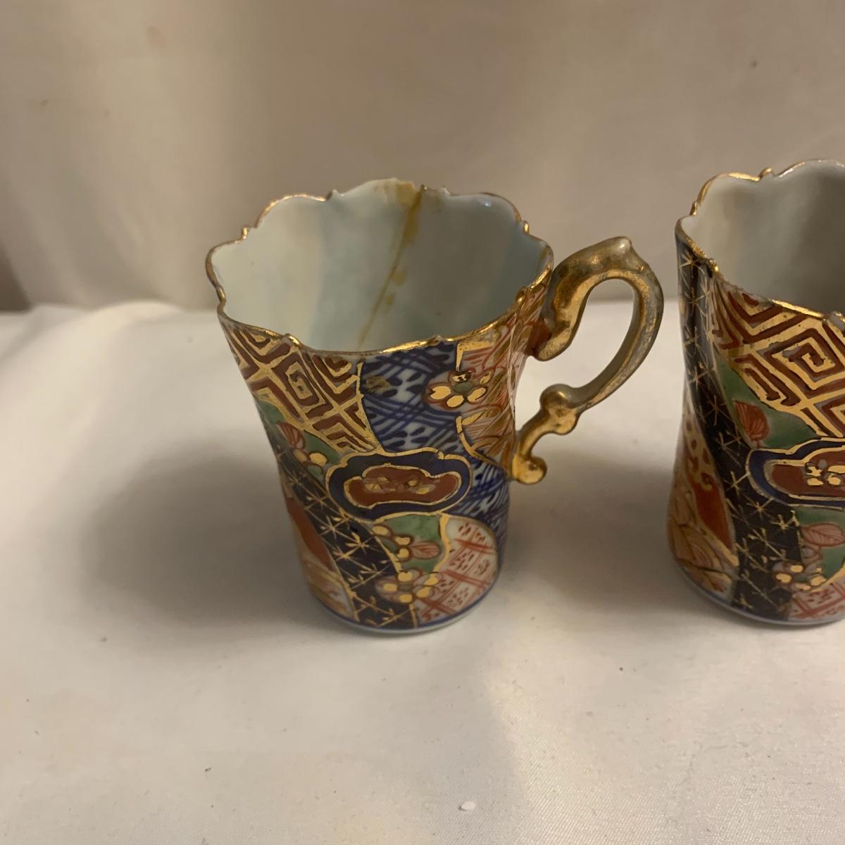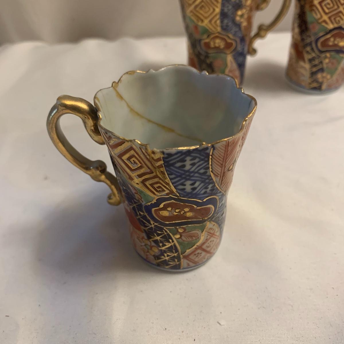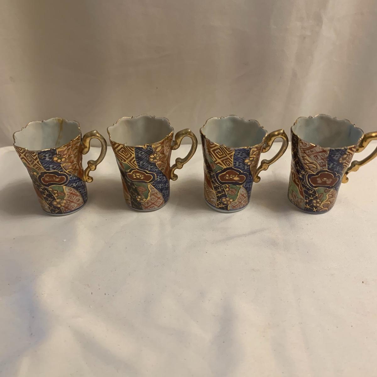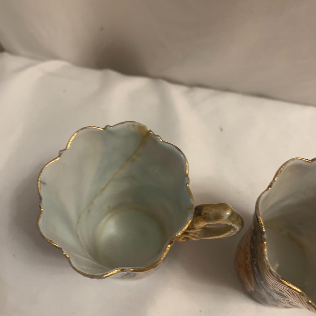 This group includes four 3” tea cups, four 4” saucers and a matching pitcher.. All pieces are in good condition except one cup that has been broken and repaired with glue. Whoever fixed it did a good job.there is a split in the tall tea pot as well, see photos. Shipping available.