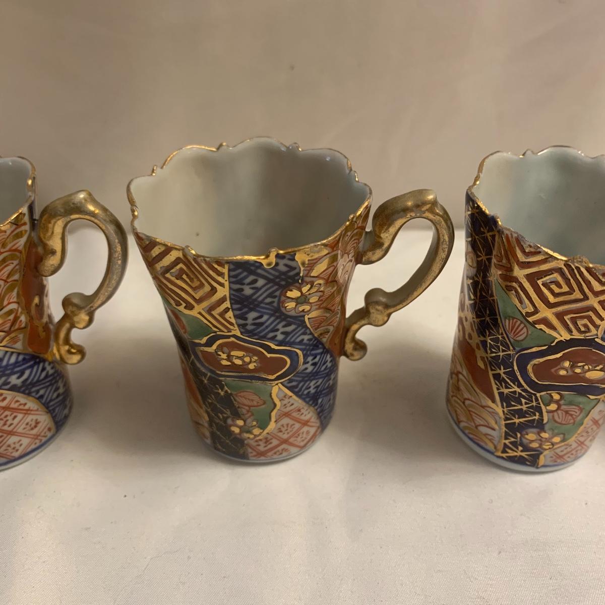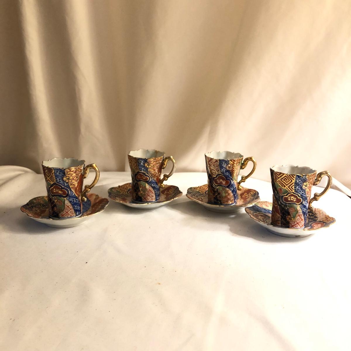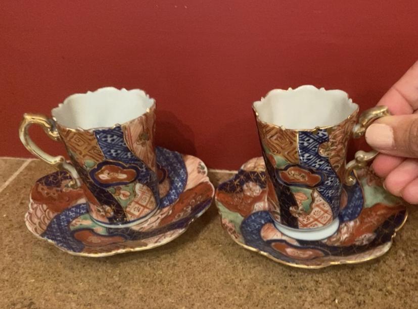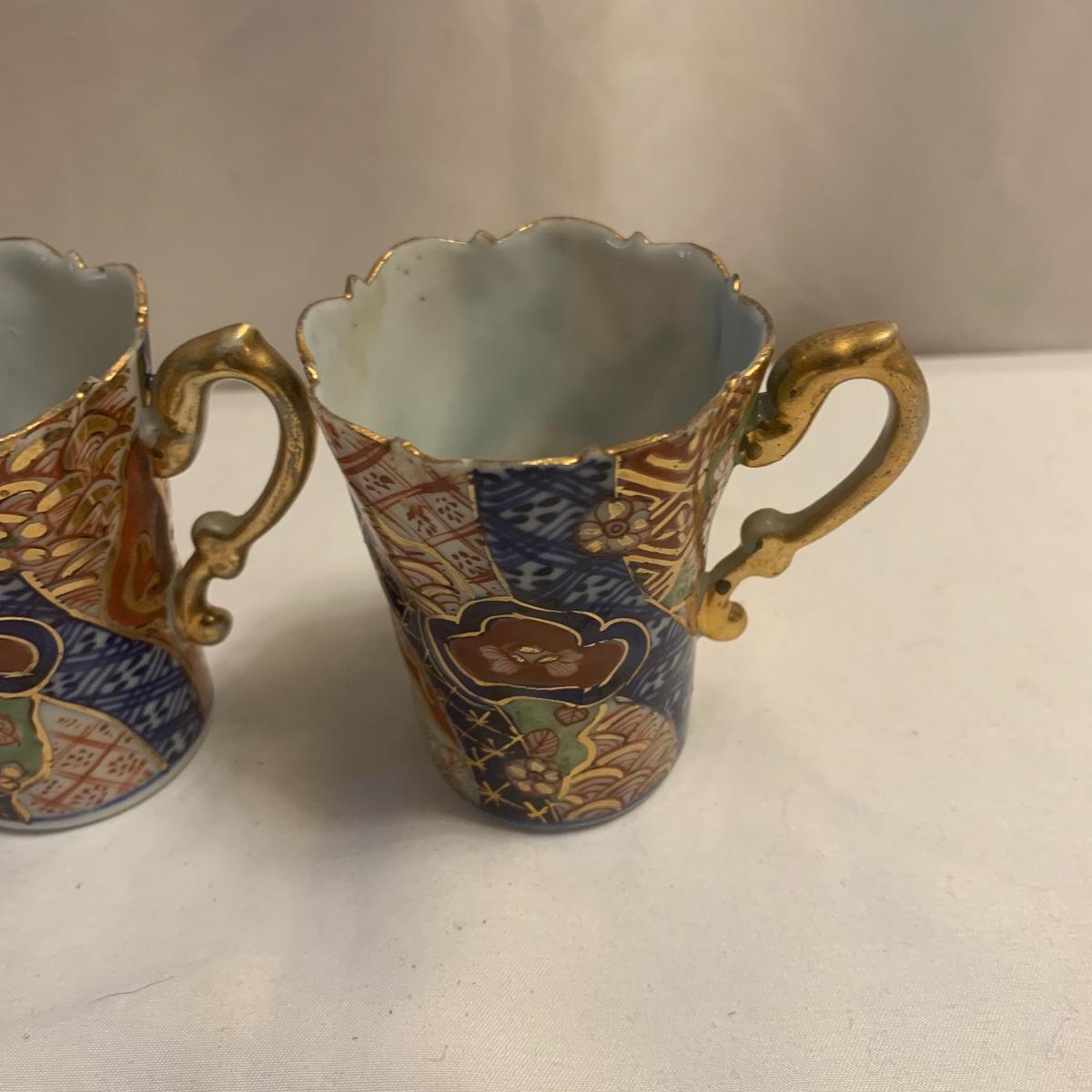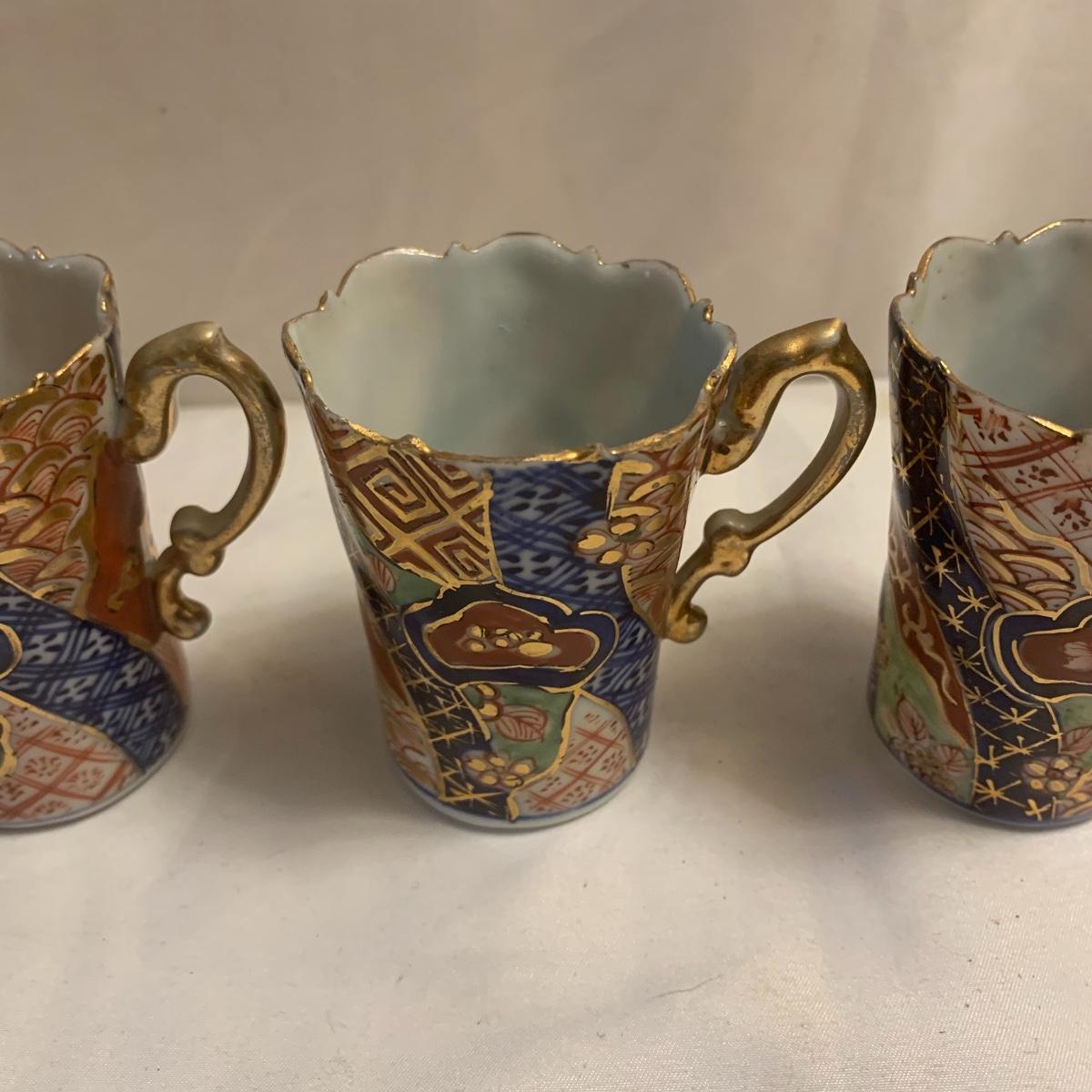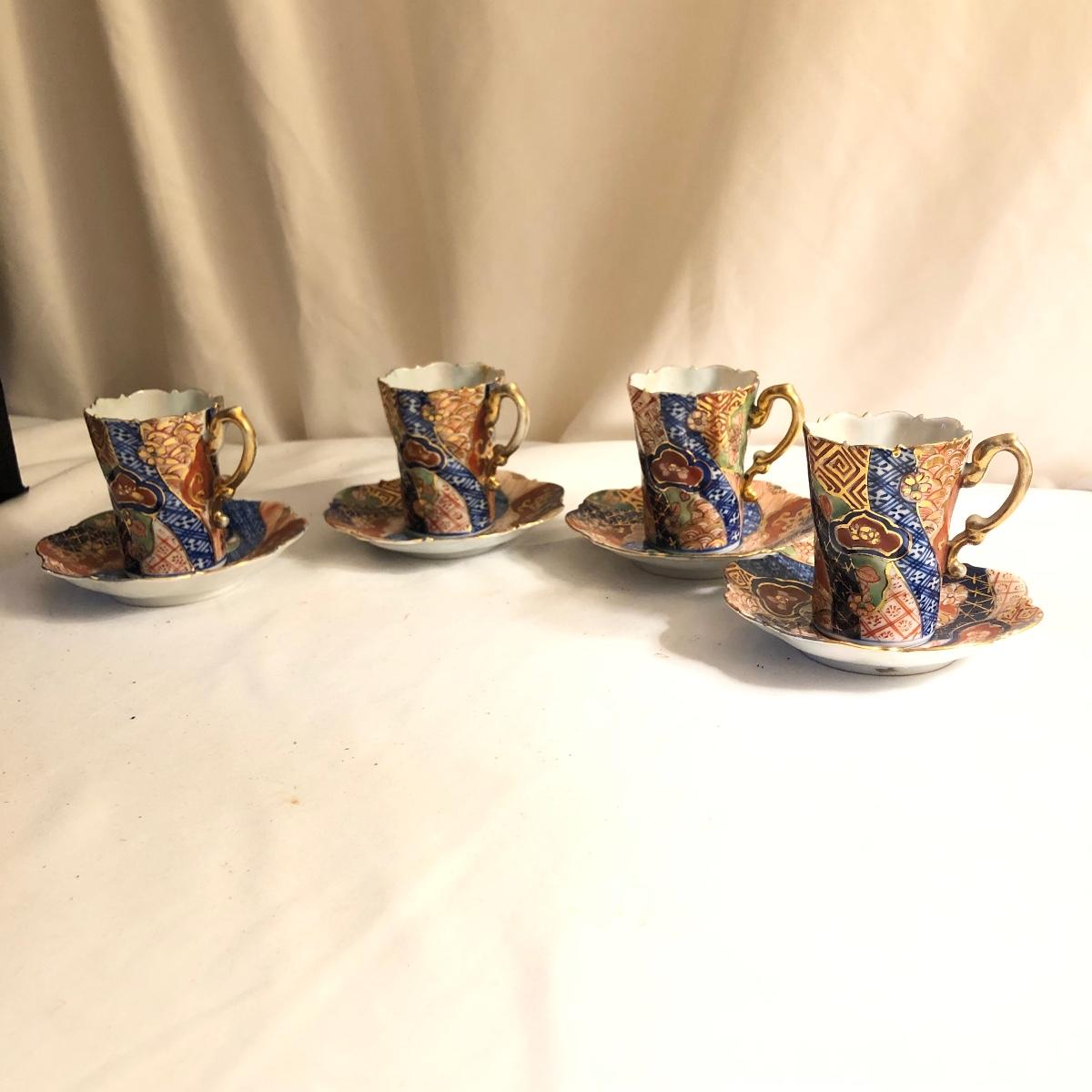 This group includes four 3” tea cups, four 4” saucers and a matching pitcher.. All pieces are in good condition except one cup that has been broken and repaired with glue. Whoever fixed it did a good job.there is a split in the tall tea pot as well, see photos. Shipping available.
