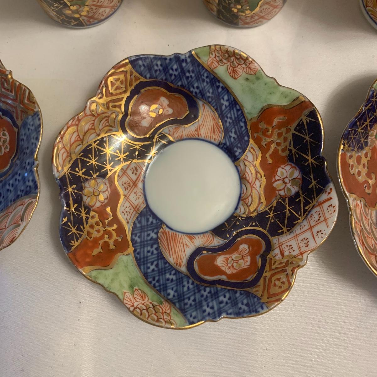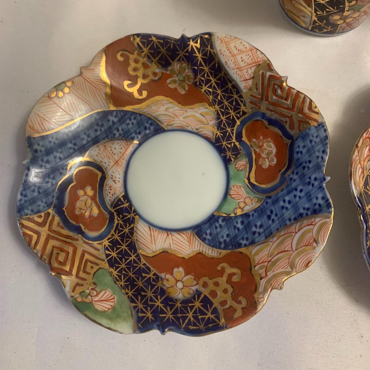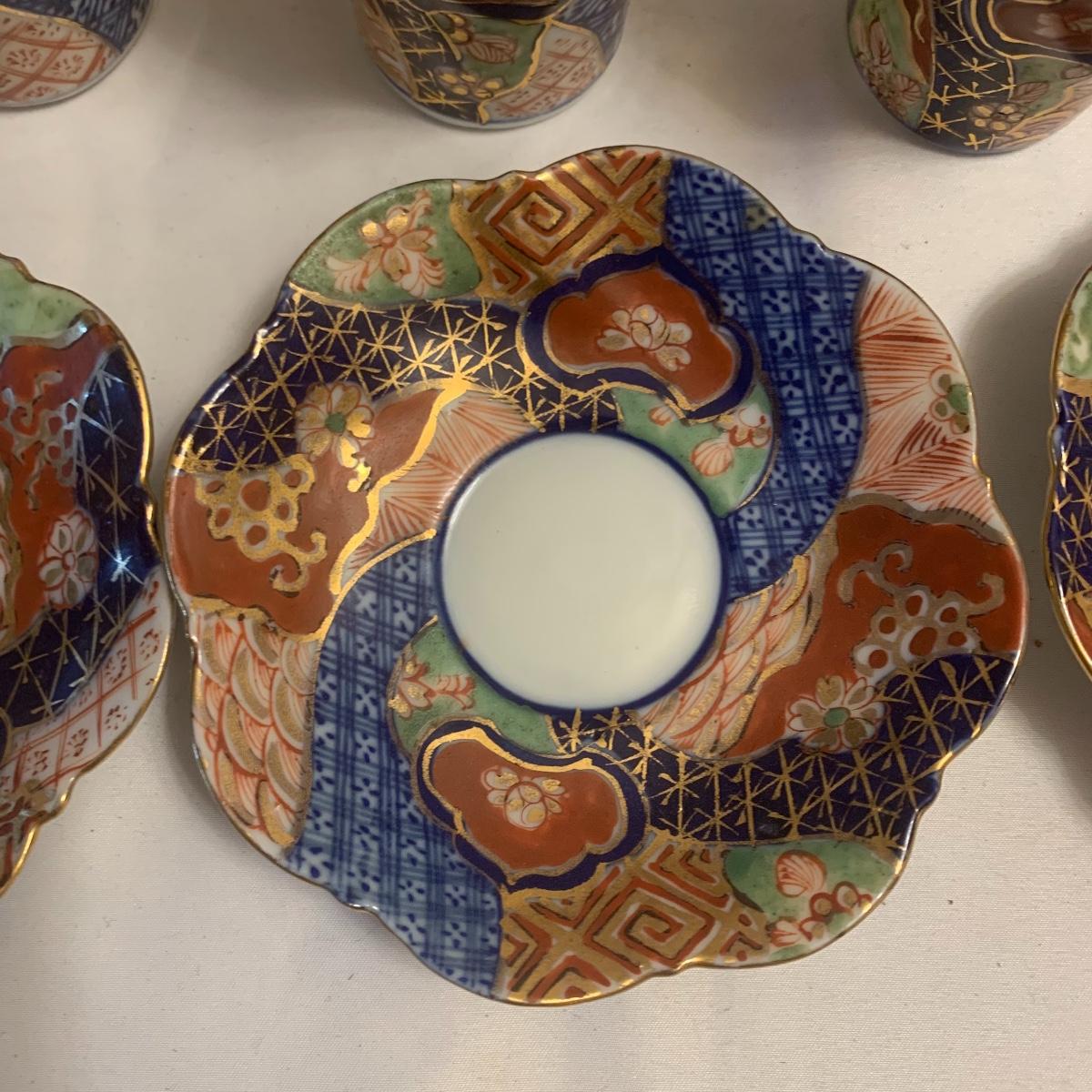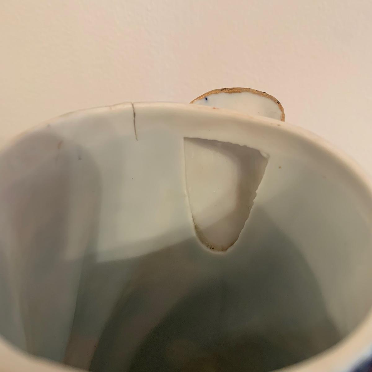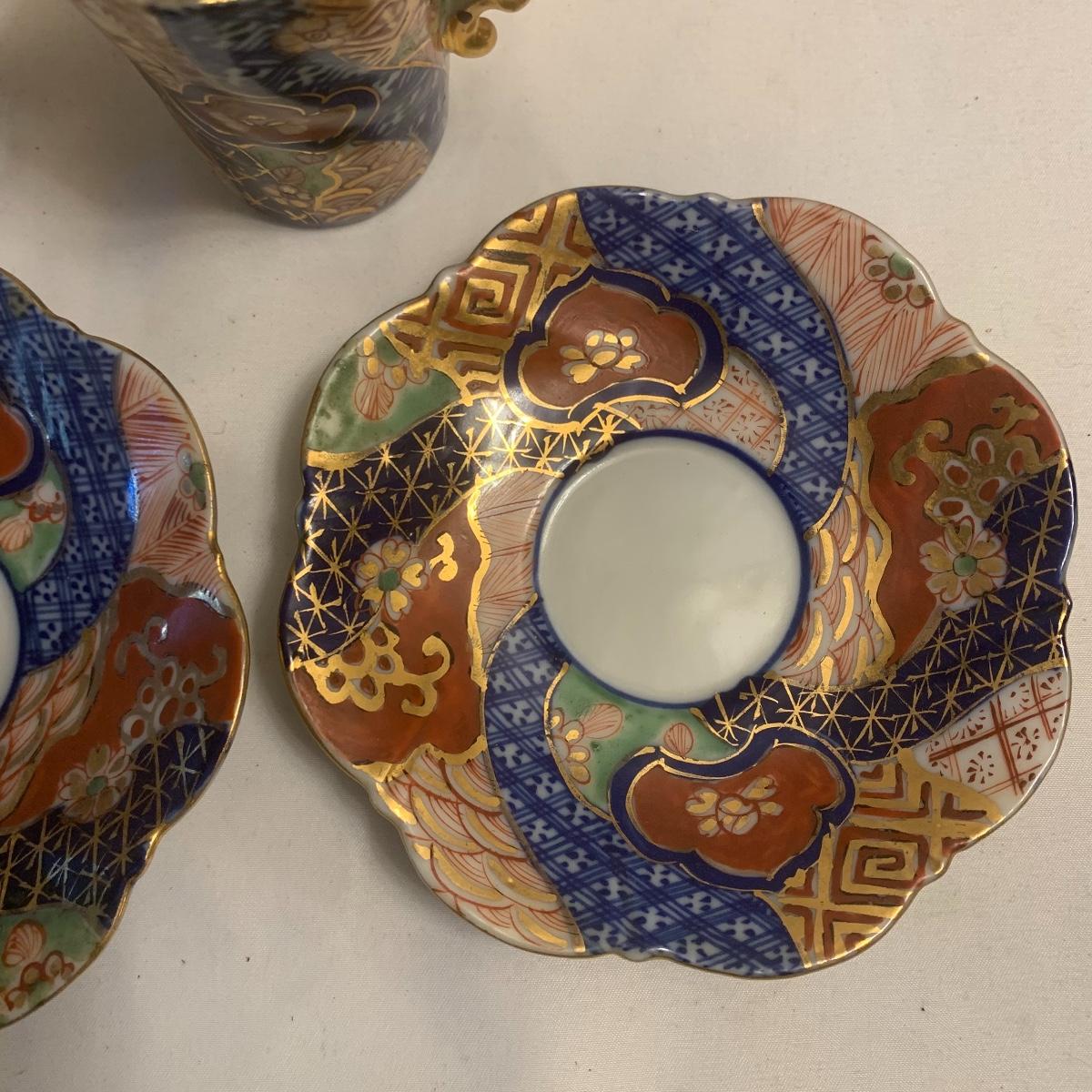 This group includes four 3” tea cups, four 4” saucers and a matching pitcher.. All pieces are in good condition except one cup that has been broken and repaired with glue. Whoever fixed it did a good job.there is a split in the tall tea pot as well, see photos. Shipping available.