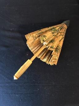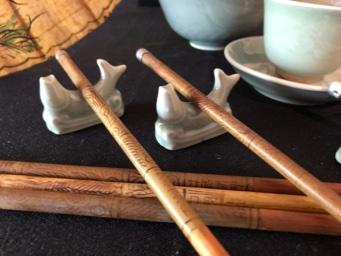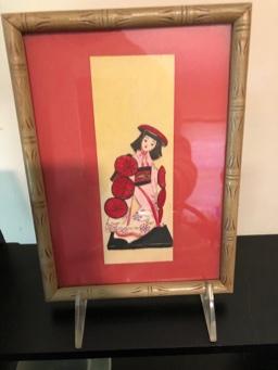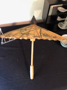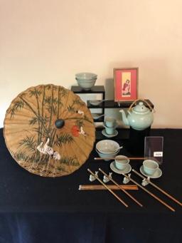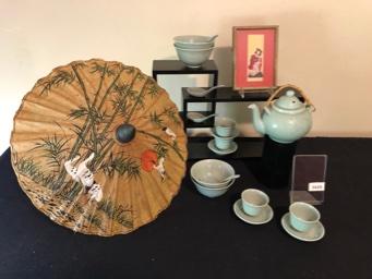 Asian Tea Set & Related Decor Great celadon colored glaze. Vintage geisha print in bamboo frame. Asian umbrella. Black stand not included.