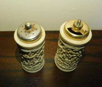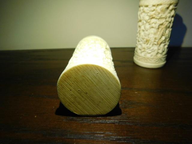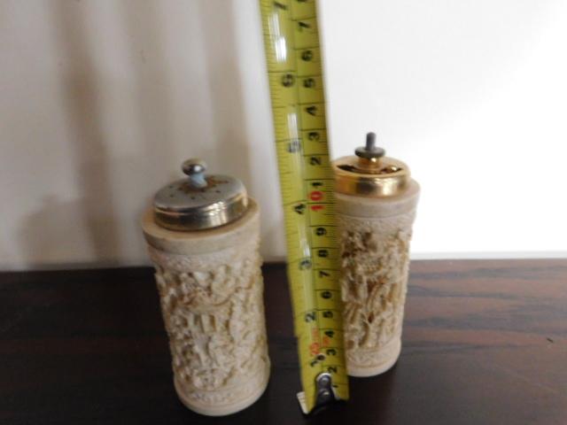 Asian Theme Carved French Ivory or Celluloid and Pepper Shakers 5" see grain pattern at bottom of shaker. May have some shading or discoloration. Nice items
