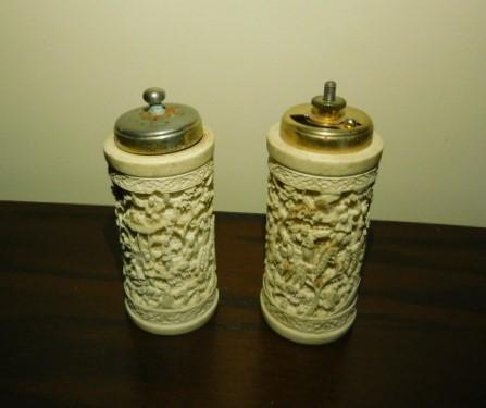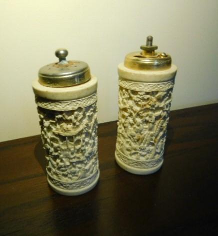 Asian Theme Carved French Ivory or Celluloid and Pepper Shakers 5"