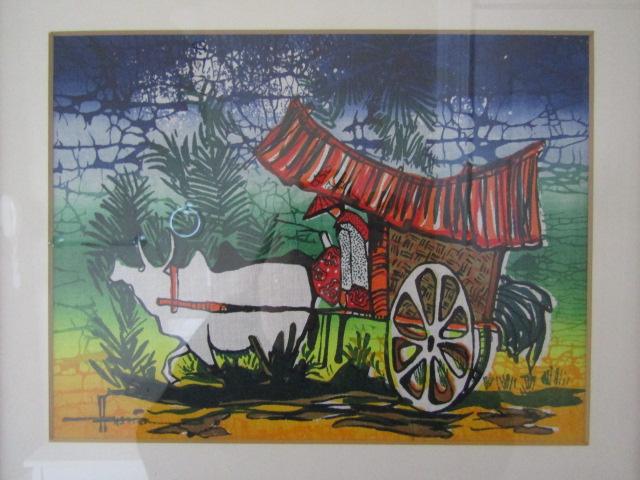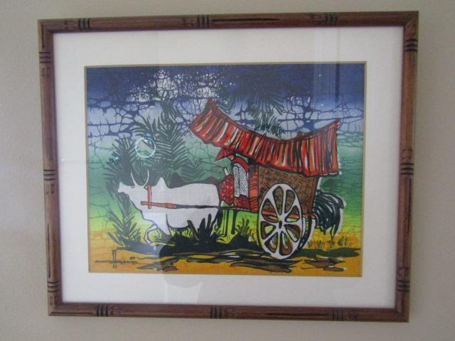 Asian Theme Highly Colorful Print of Farmer with Ox and Cart 14"x11"
