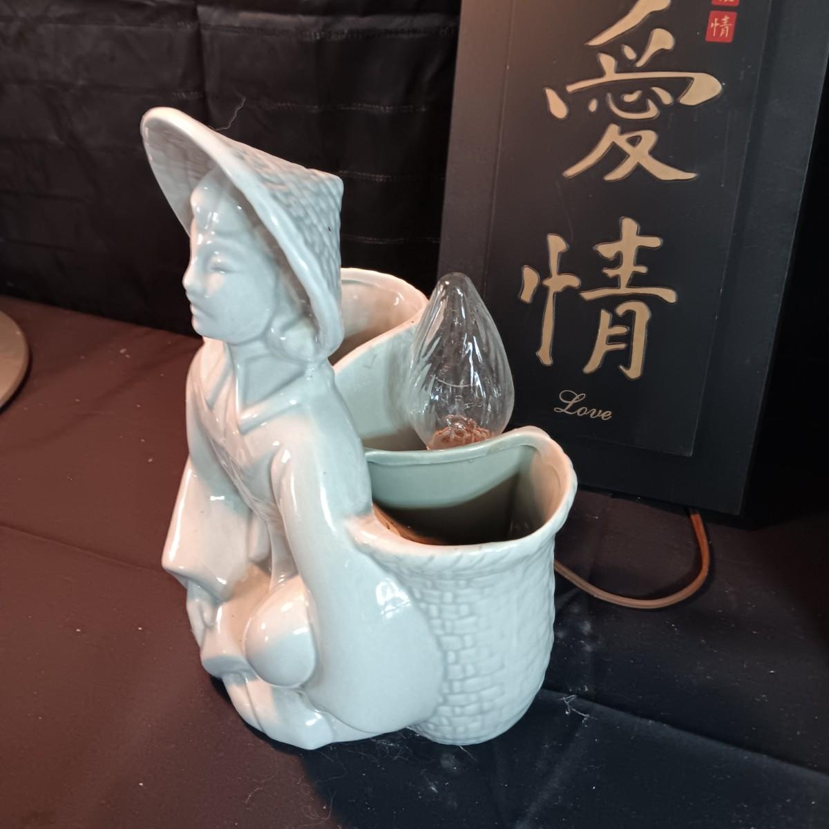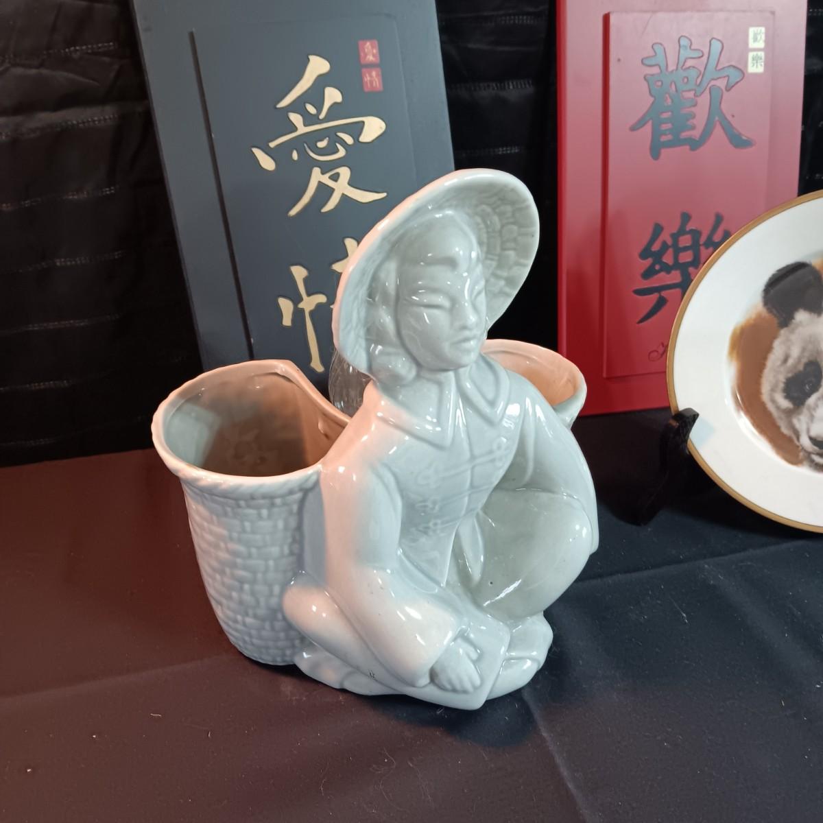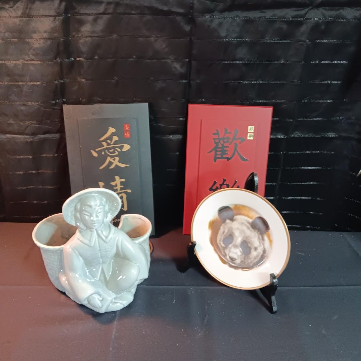 ASIAN THEMED PORCELAIN TV LAMP, PANDA PLATE AND 2 WOODEN WALL HANGINGS