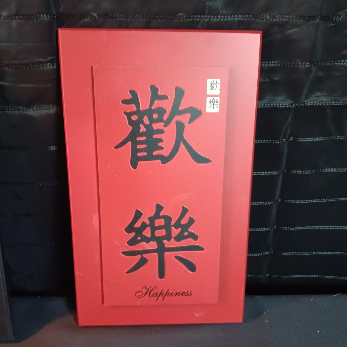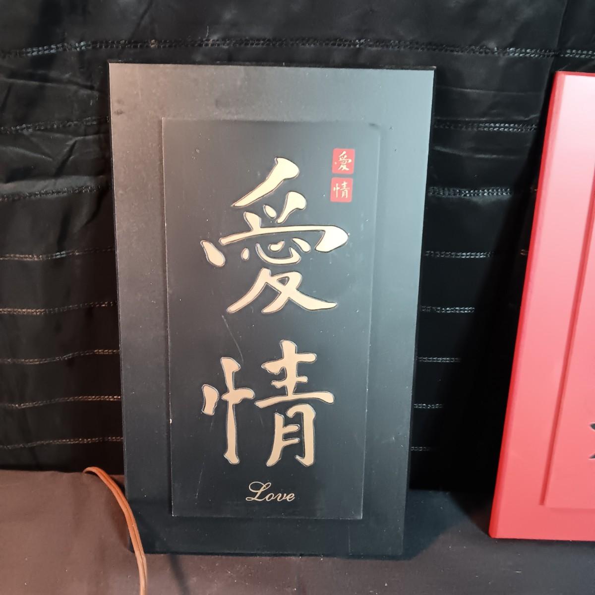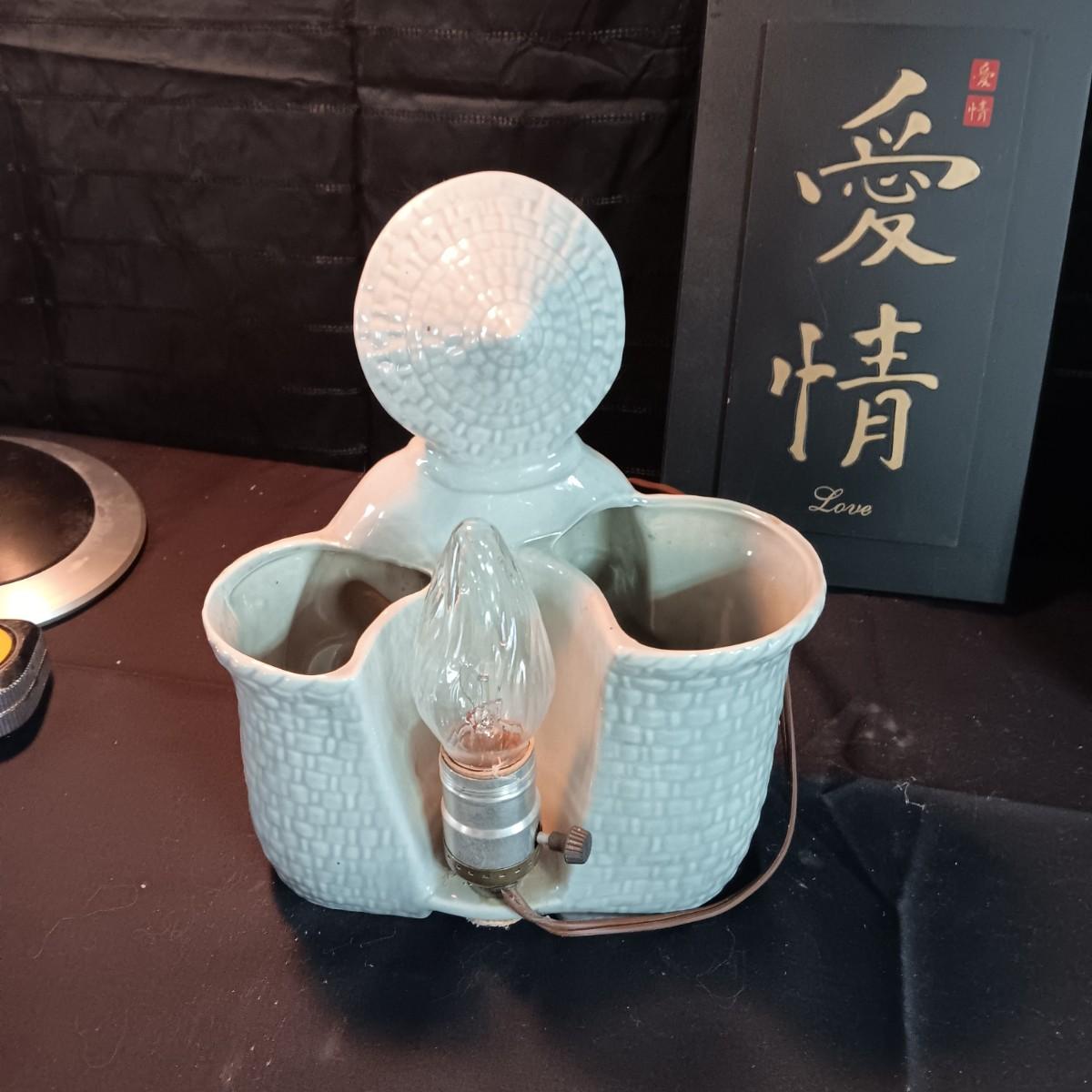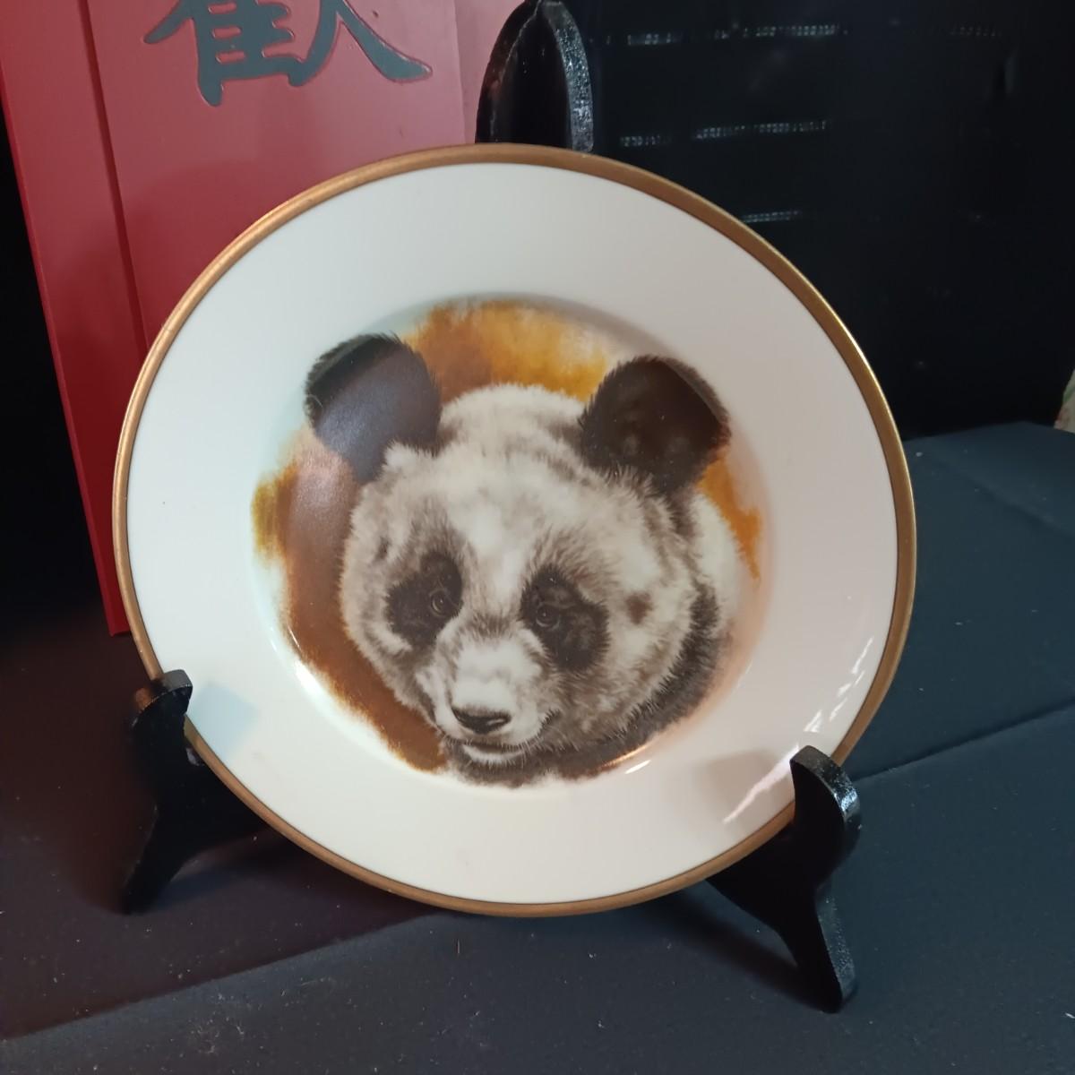ASIAN THEMED PORCELAIN TV LAMP, PANDA PLATE AND 2 WOODEN WALL HANGINGS