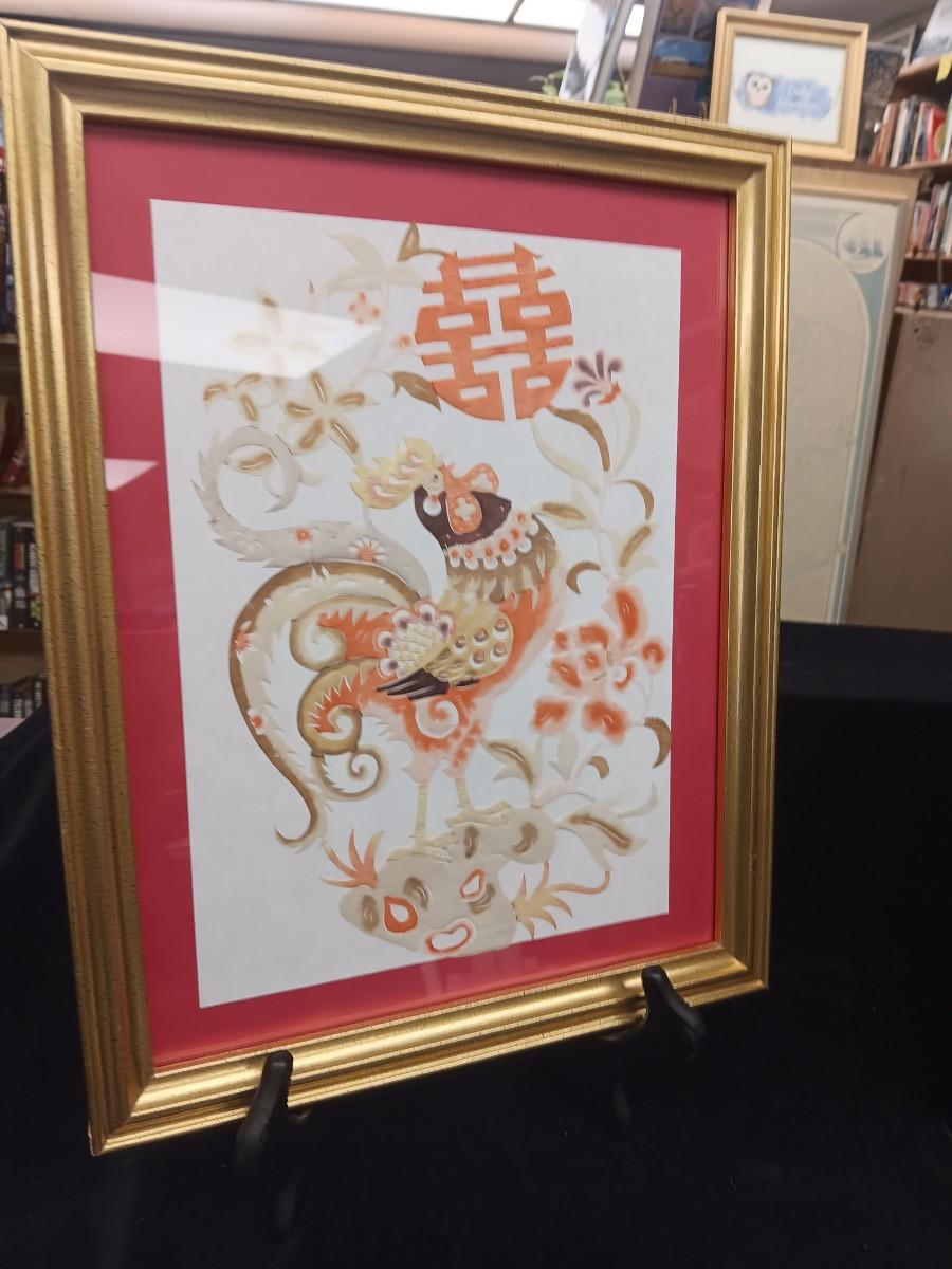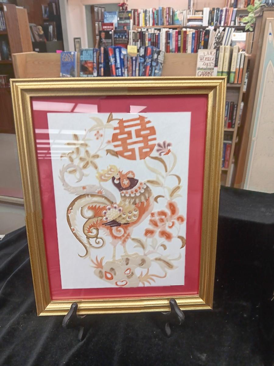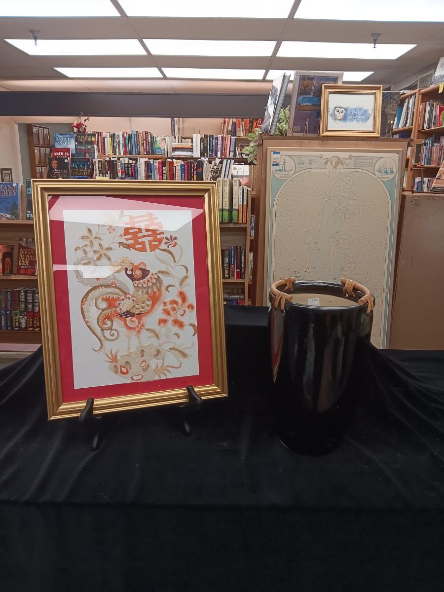 ASIAN THEMED ROOSTER PICTURE AND CLAY VASE