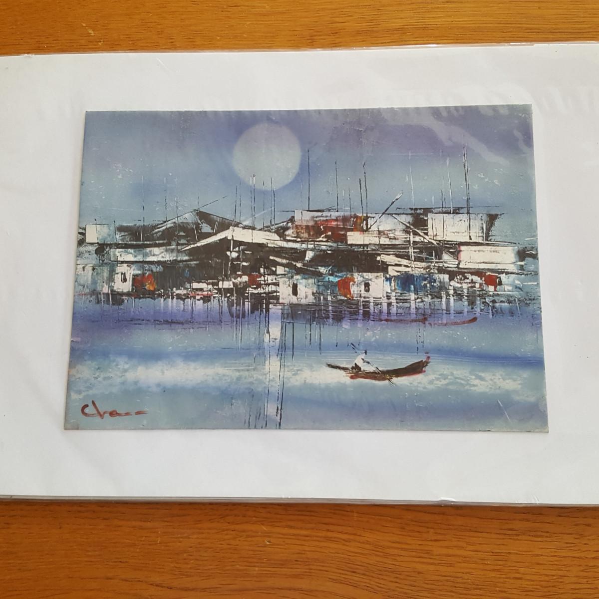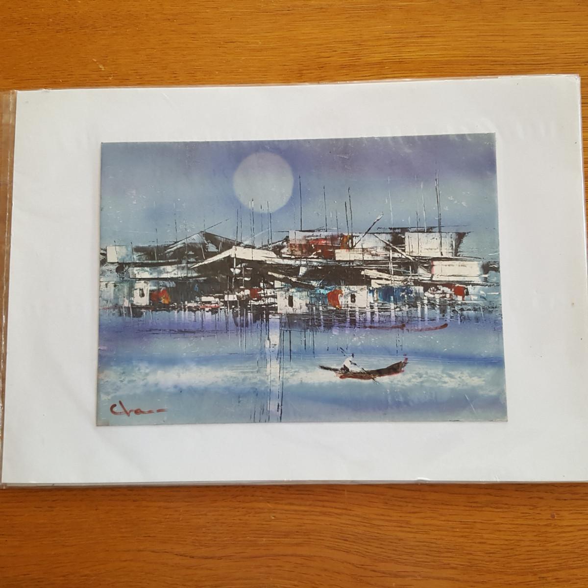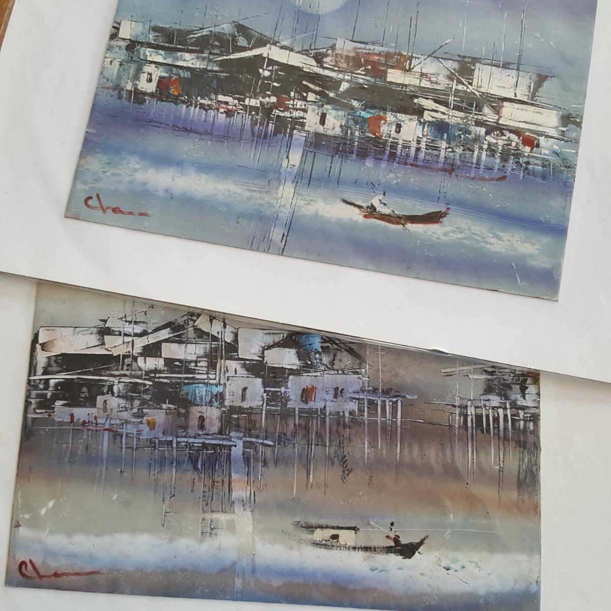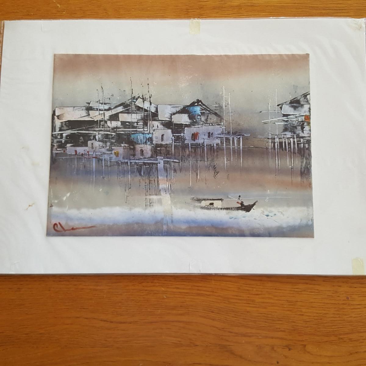 This auction lot is for a pair of Asian Tourist Watercolors. These original works are on thin cardboard temporarily affixed to a mounting board and encased in a plastic sleeve for protection. Both pictures are scenes of what appears to be a Hong Kong Harbor - signed by what appears to be the name "Chase". The actual watercolors measure about 11-inches X 8-inches, the overall measurement is about 16-inches X 11-inches. Quite a nice artful find.