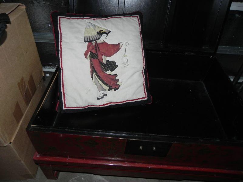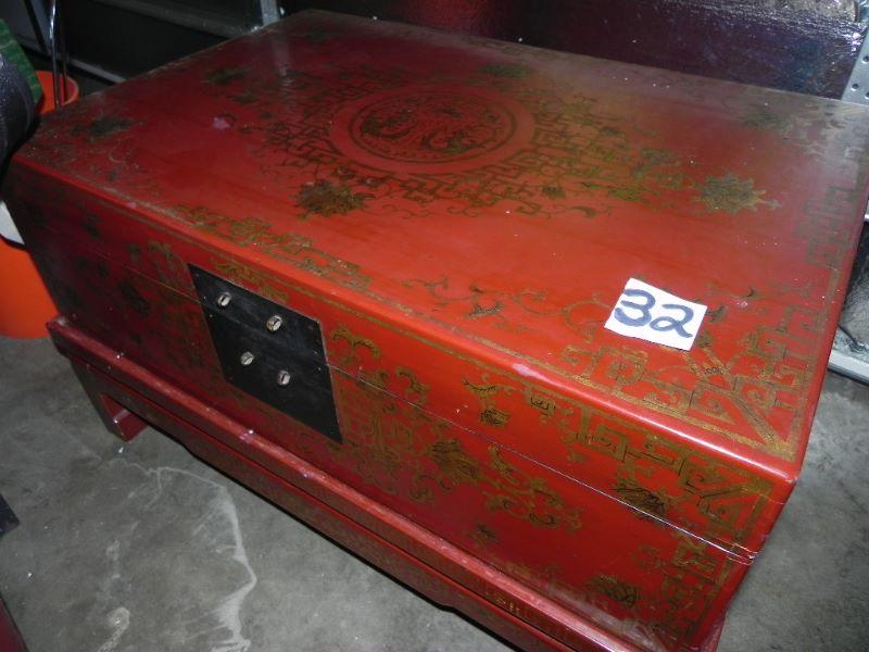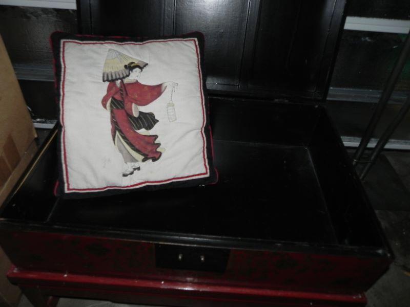 Trunk sits on its own stand, opens and closes ok, there is some small places that paint is wearing 31"Wx22"Dx18"H, Asian decorative pillow