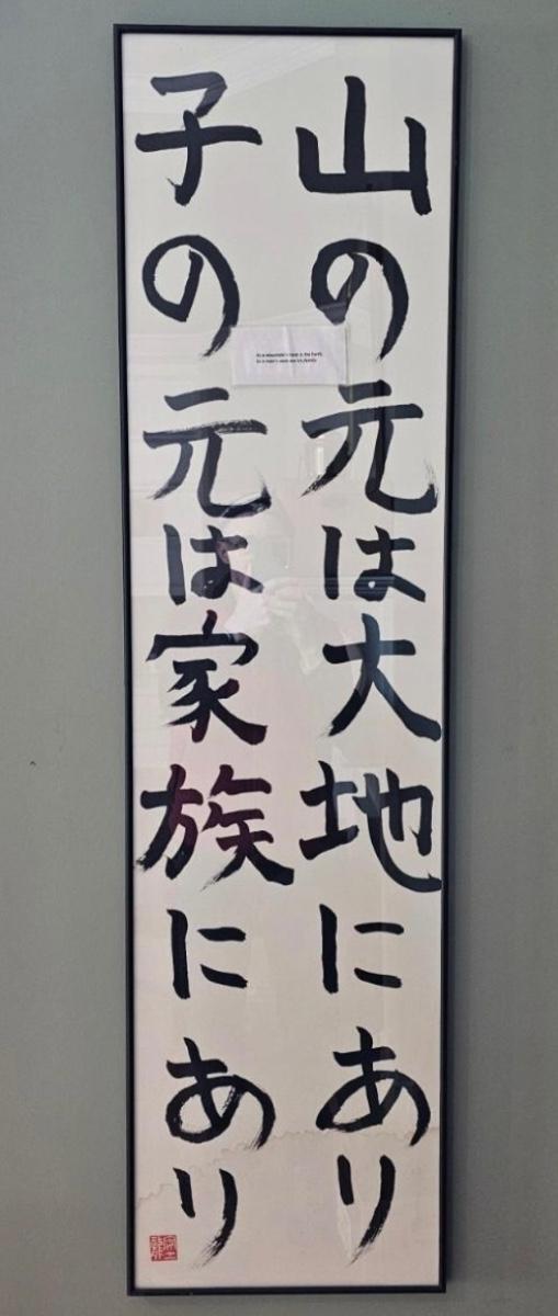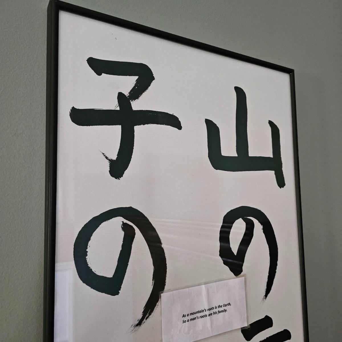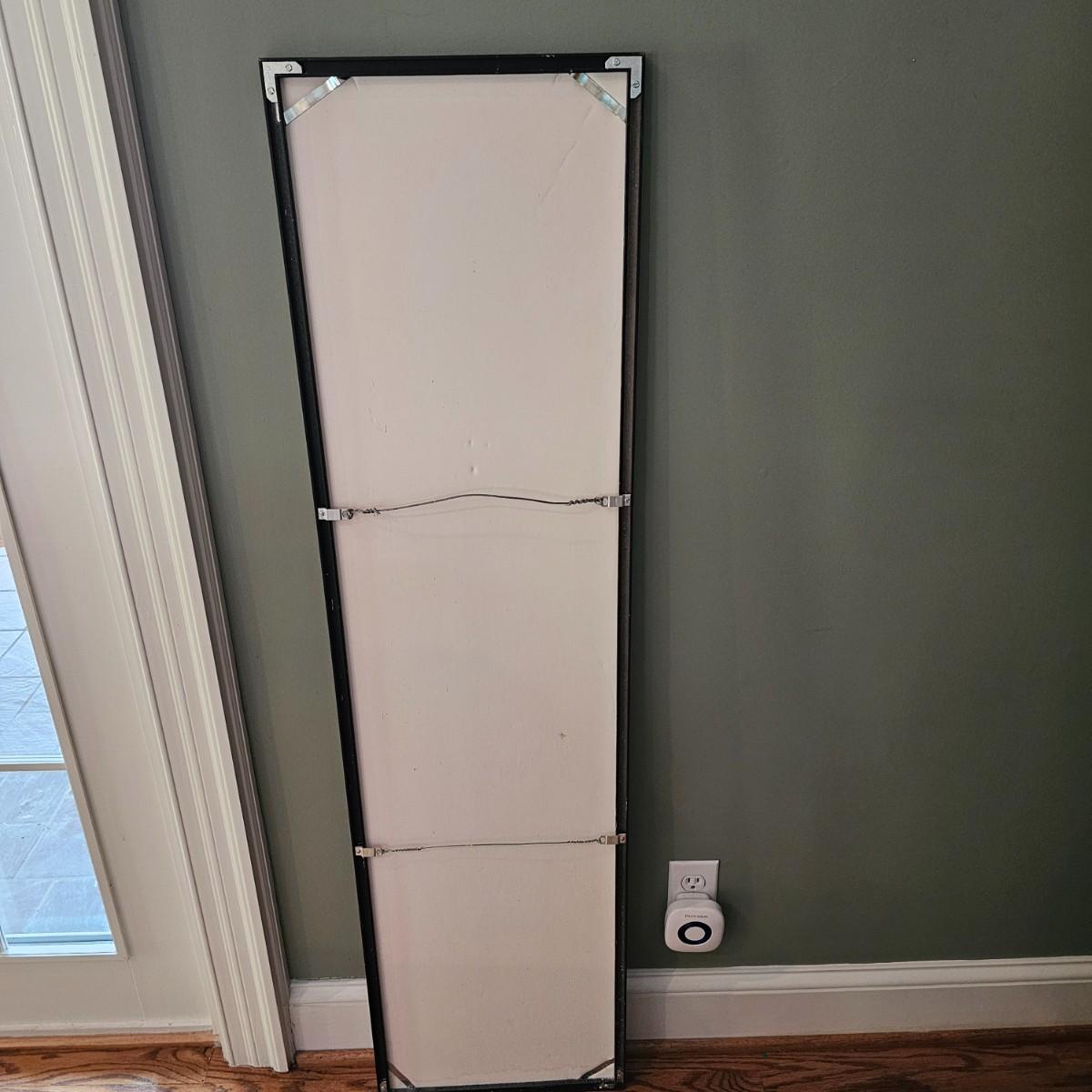Long slender framed Asian art in metal frame. Art appears to be brush painting on rice paper, has translation in English taped to front. Item bears chop mark at bottom, has had some water damage at bottom as well. Measures 14" x 53"H. Has two wire hanging points on back, see photos for details. Shipping available. Shipping can be costly. We suggest contacting our preferred local shipping provider, Postage Express, with dimensions and getting an estimate before bidding: (828) 670-5501 or shipping@postageexpressnc.com