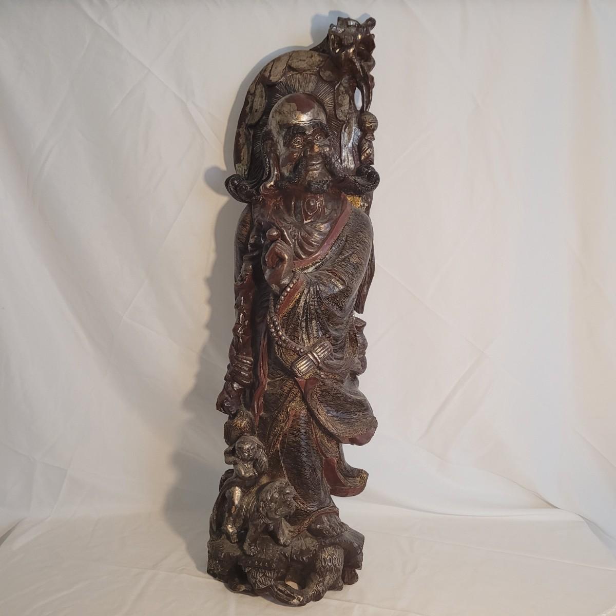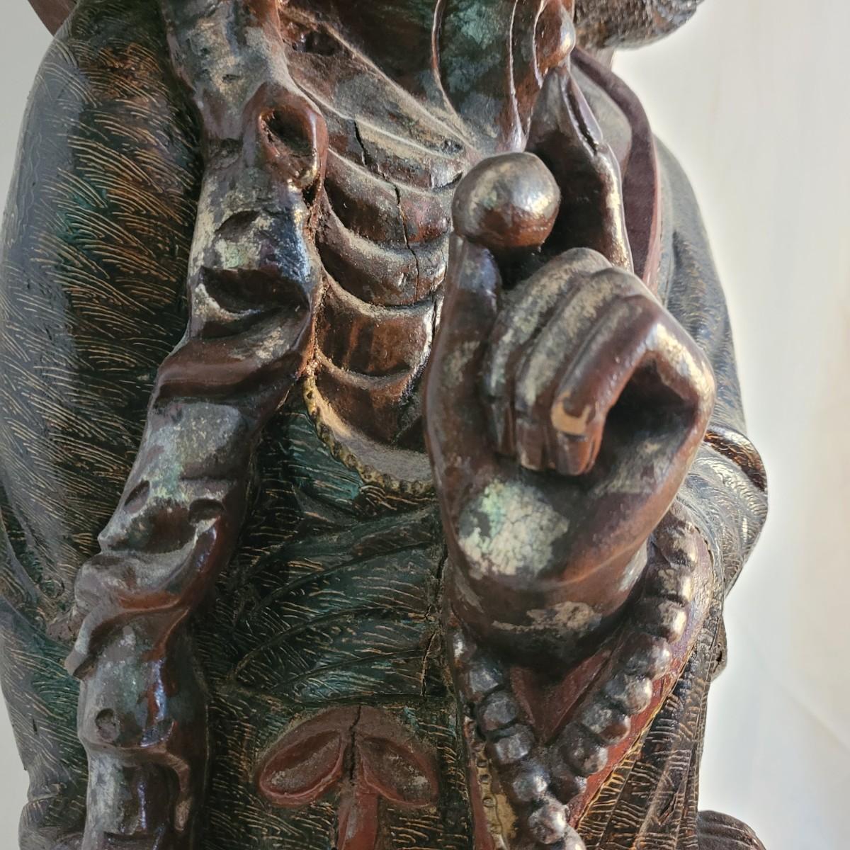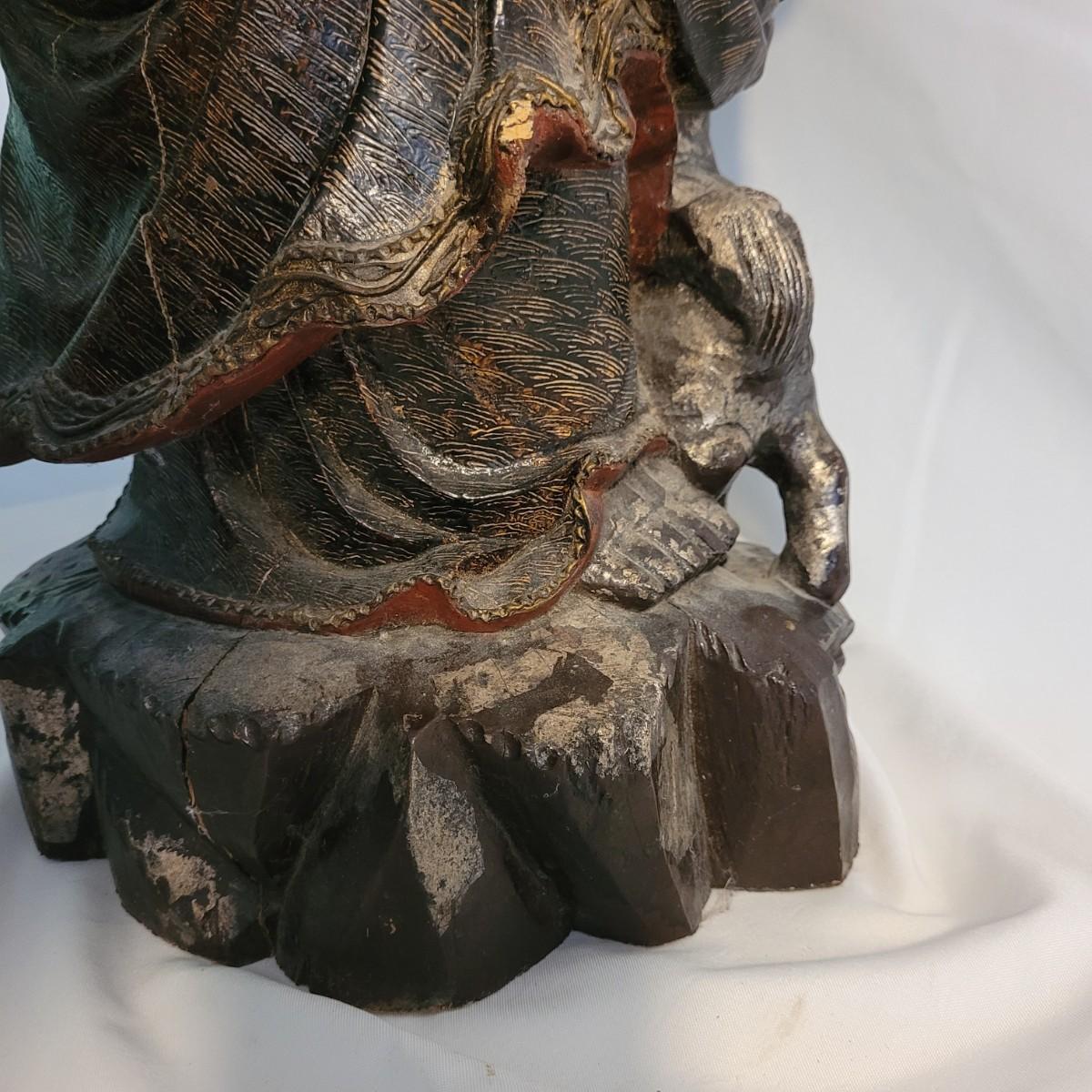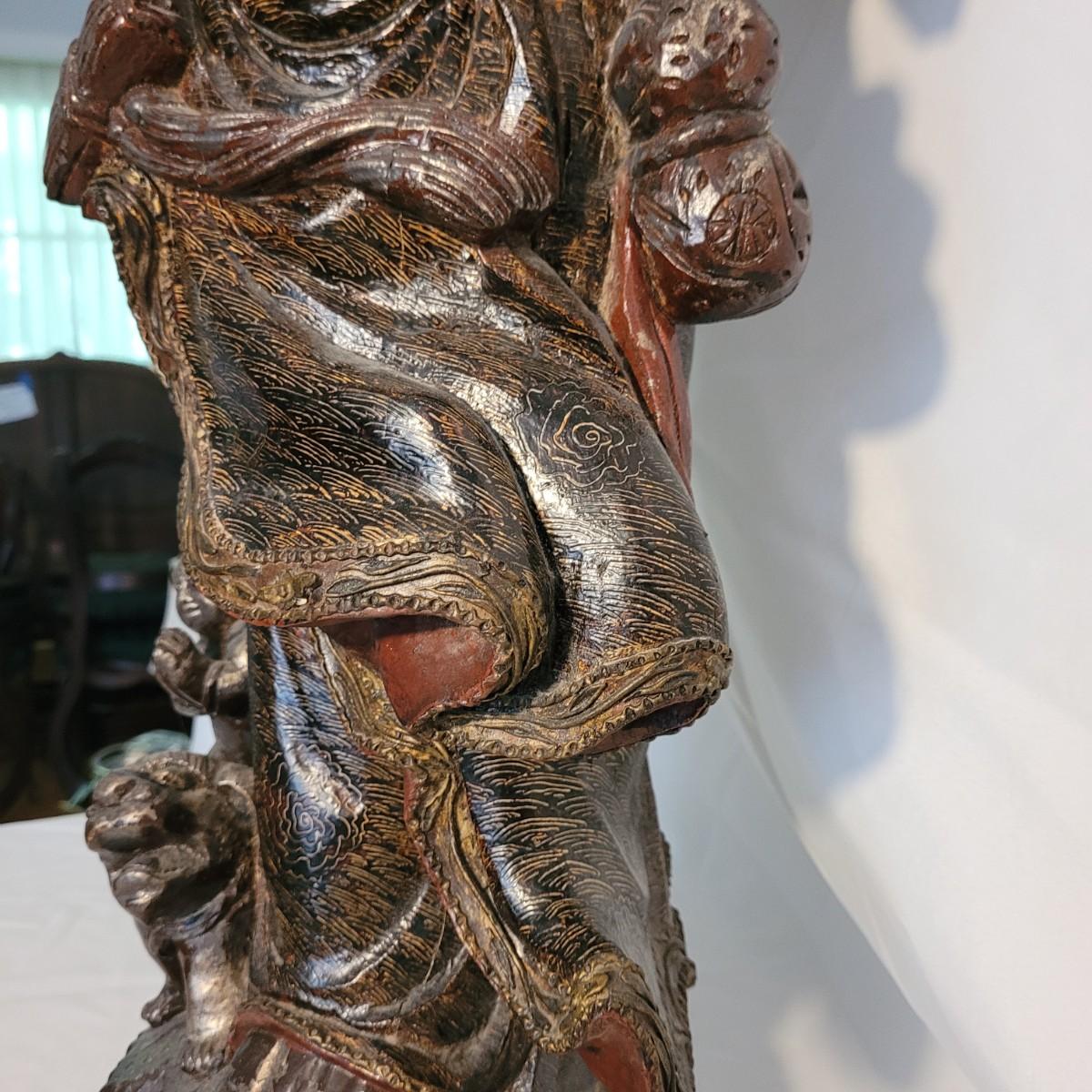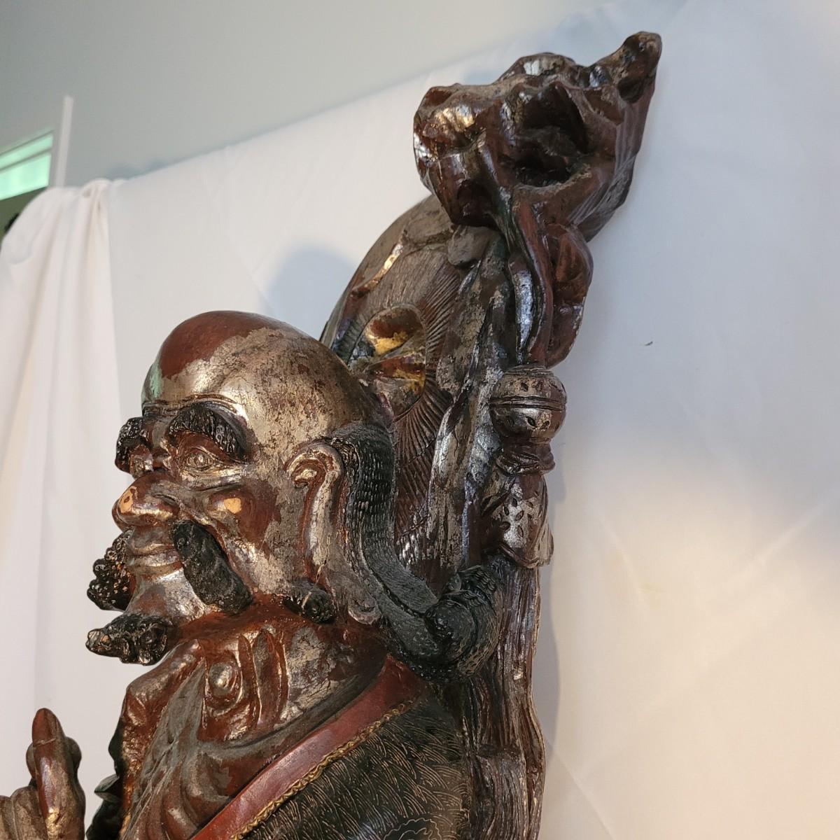 Large Asian solid wood carving statue of elderly man, with Foo dog at base. Some chipped paint throughout. Cracks in wood most prominent on lower back portion, especially at base (see close up photos of chipped areas and cracks). Overall good condition. Sturdy base. Moderately heavy due to solid wood material. Measures approximately 11"L x10"W x40.5"H. Shipping available.