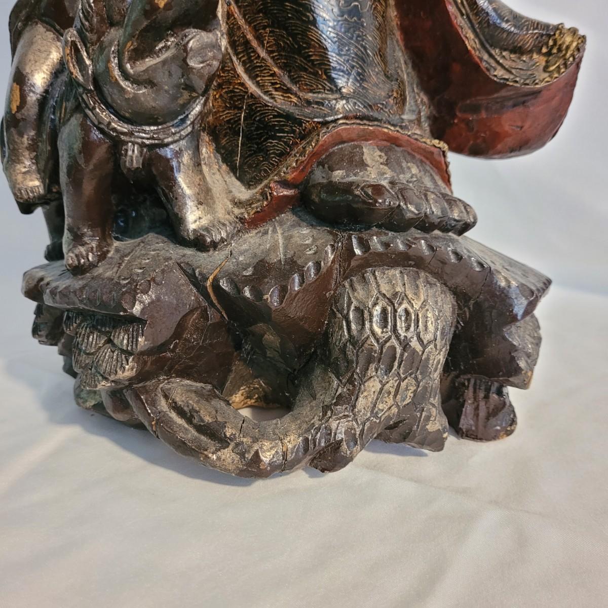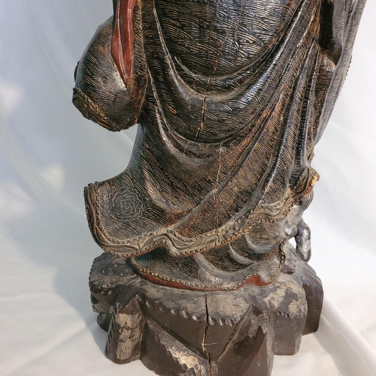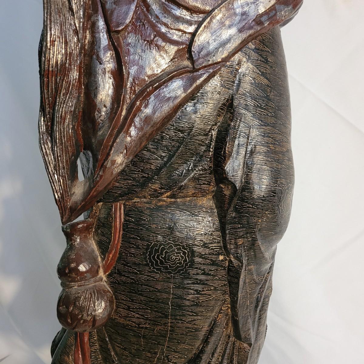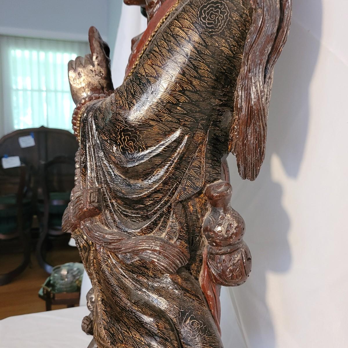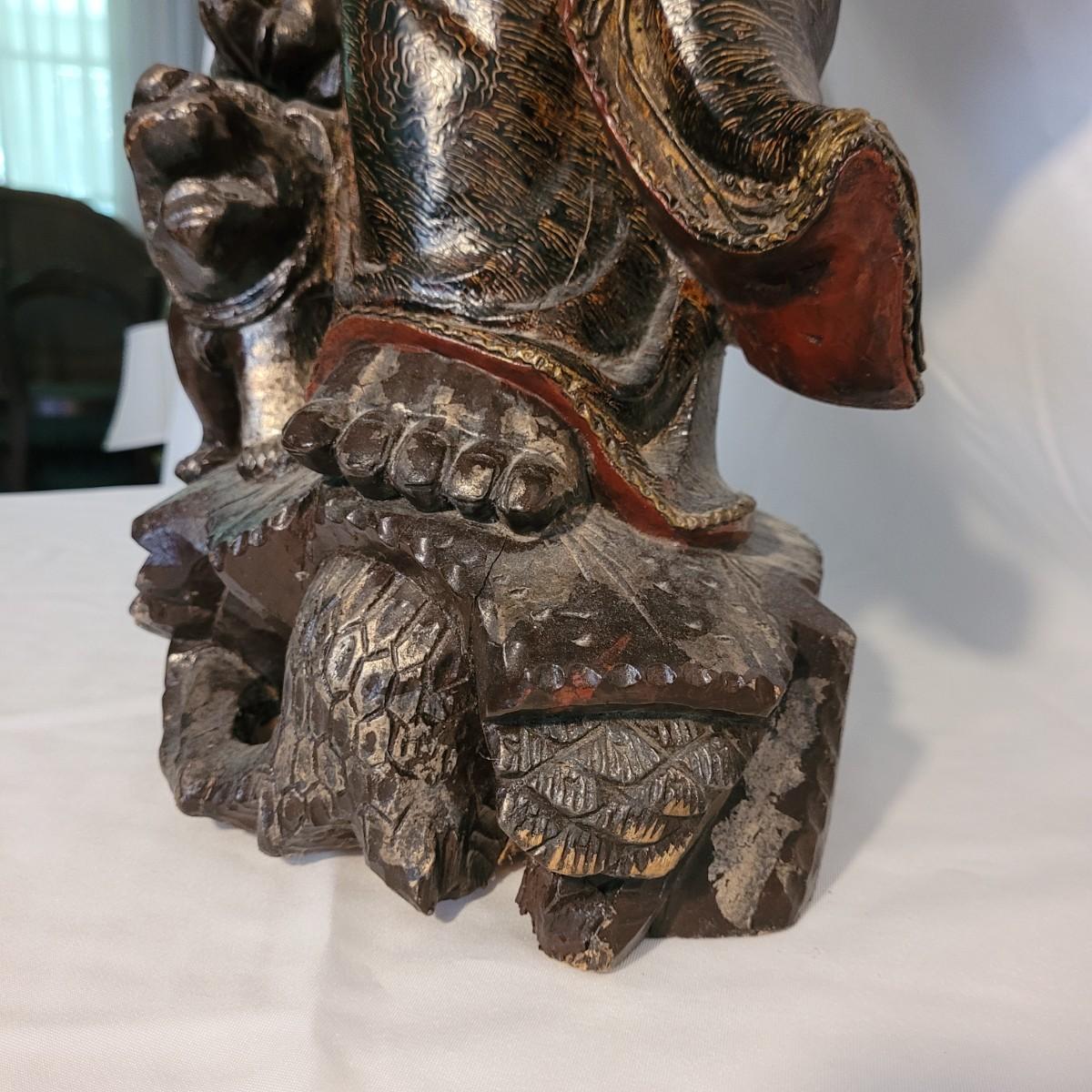 Large Asian solid wood carving statue of elderly man, with Foo dog at base. Some chipped paint throughout. Cracks in wood most prominent on lower back portion, especially at base (see close up photos of chipped areas and cracks). Overall good condition. Sturdy base. Moderately heavy due to solid wood material. Measures approximately 11"L x10"W x40.5"H. Shipping available.