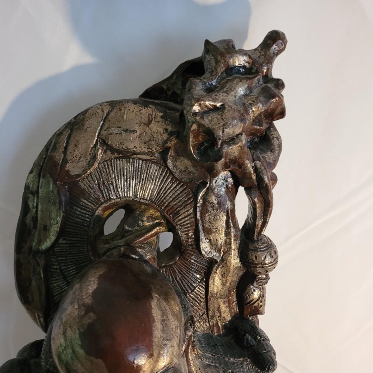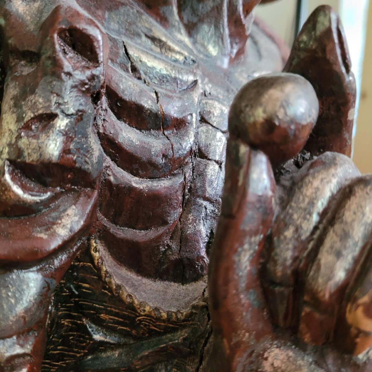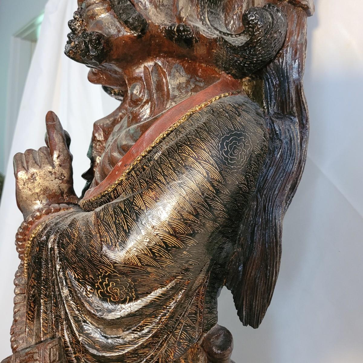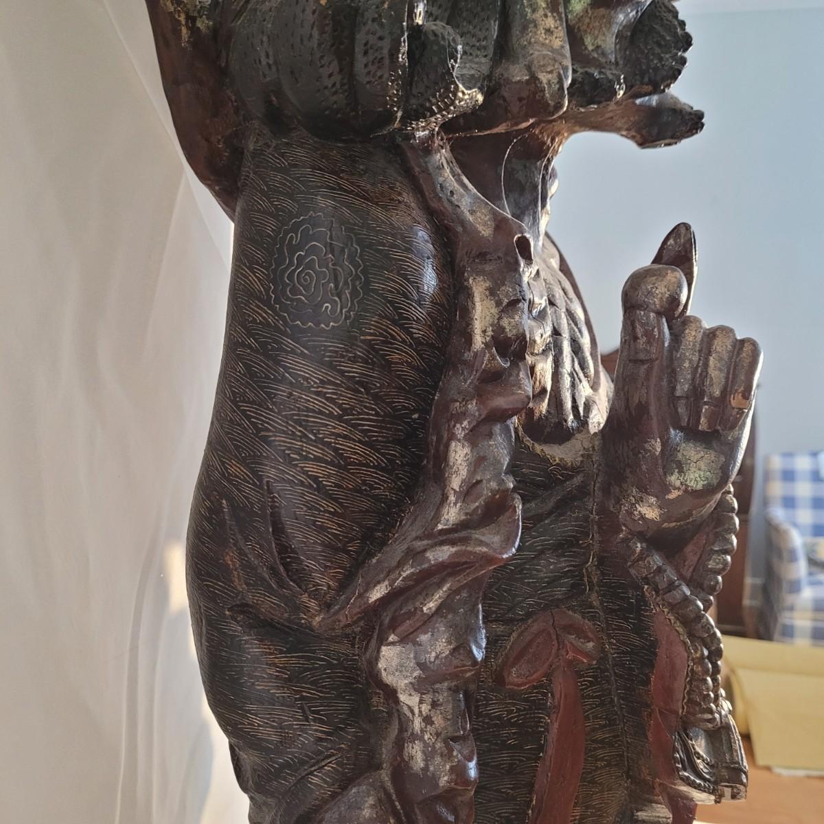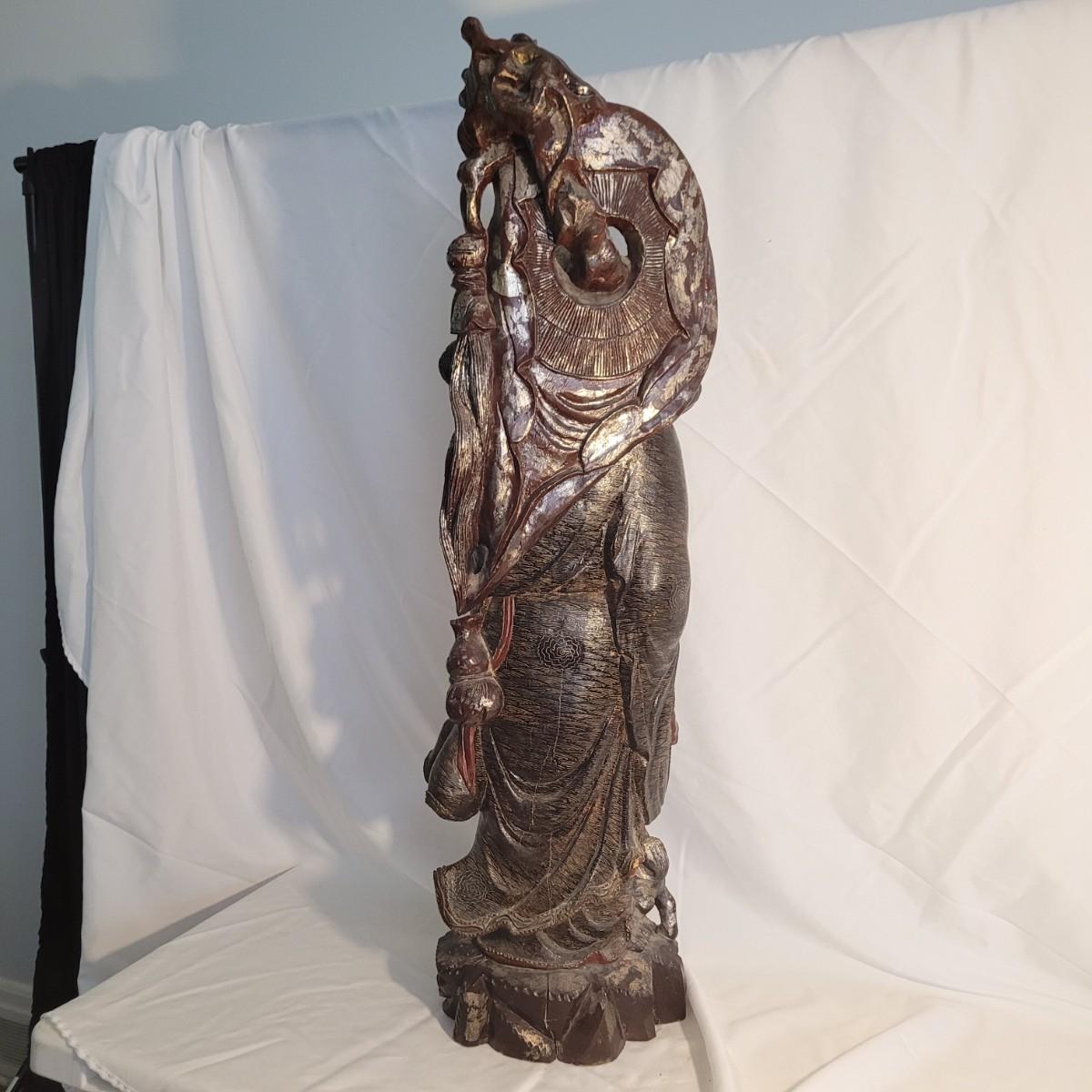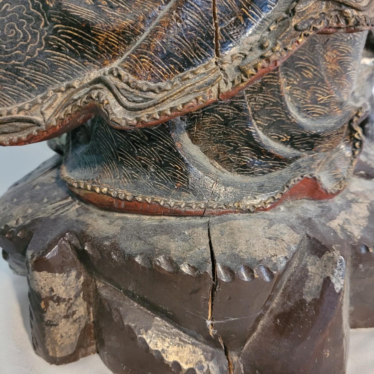 Large Asian solid wood carving statue of elderly man, with Foo dog at base. Some chipped paint throughout. Cracks in wood most prominent on lower back portion, especially at base (see close up photos of chipped areas and cracks). Overall good condition. Sturdy base. Moderately heavy due to solid wood material. Measures approximately 11"L x10"W x40.5"H. Shipping available.