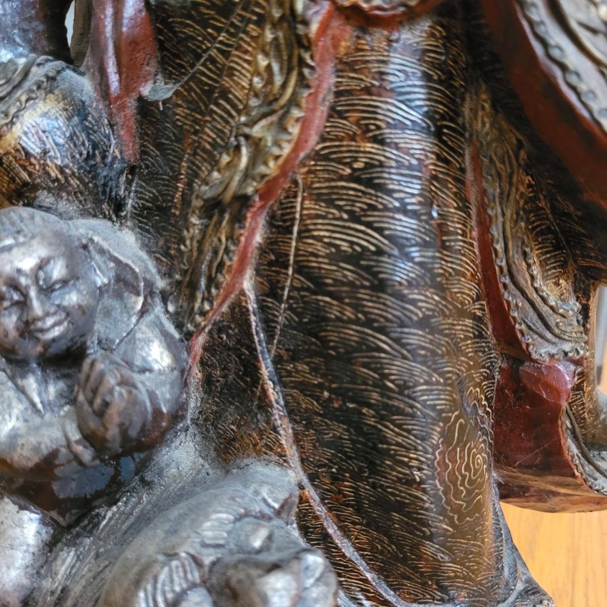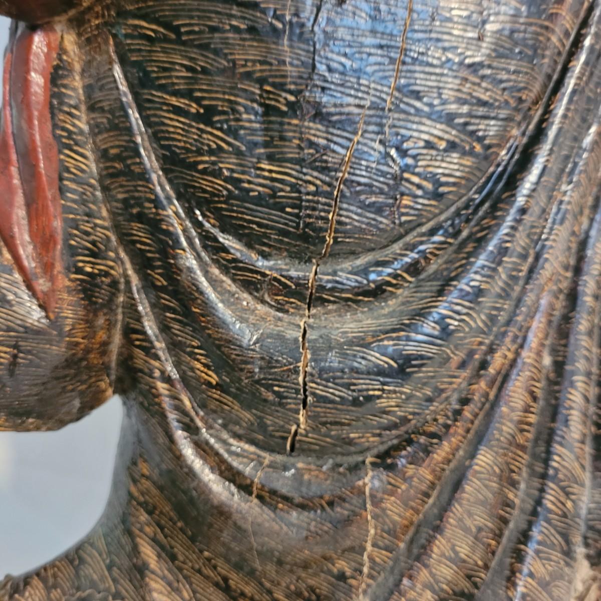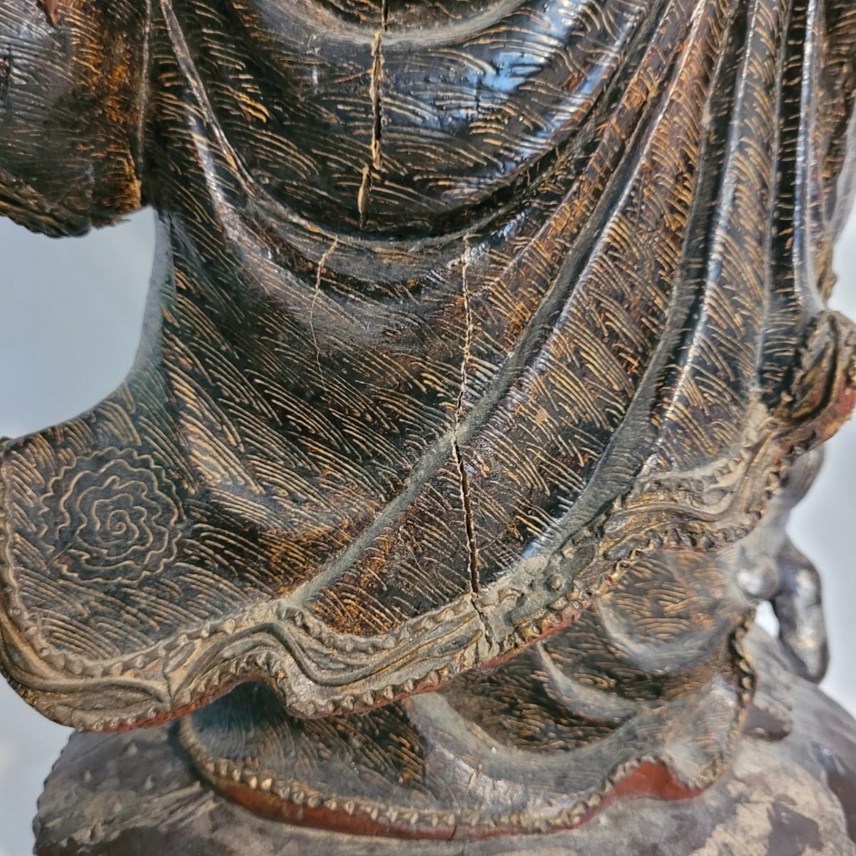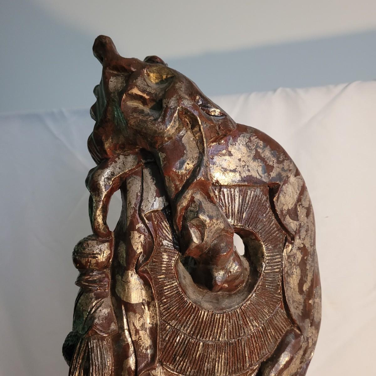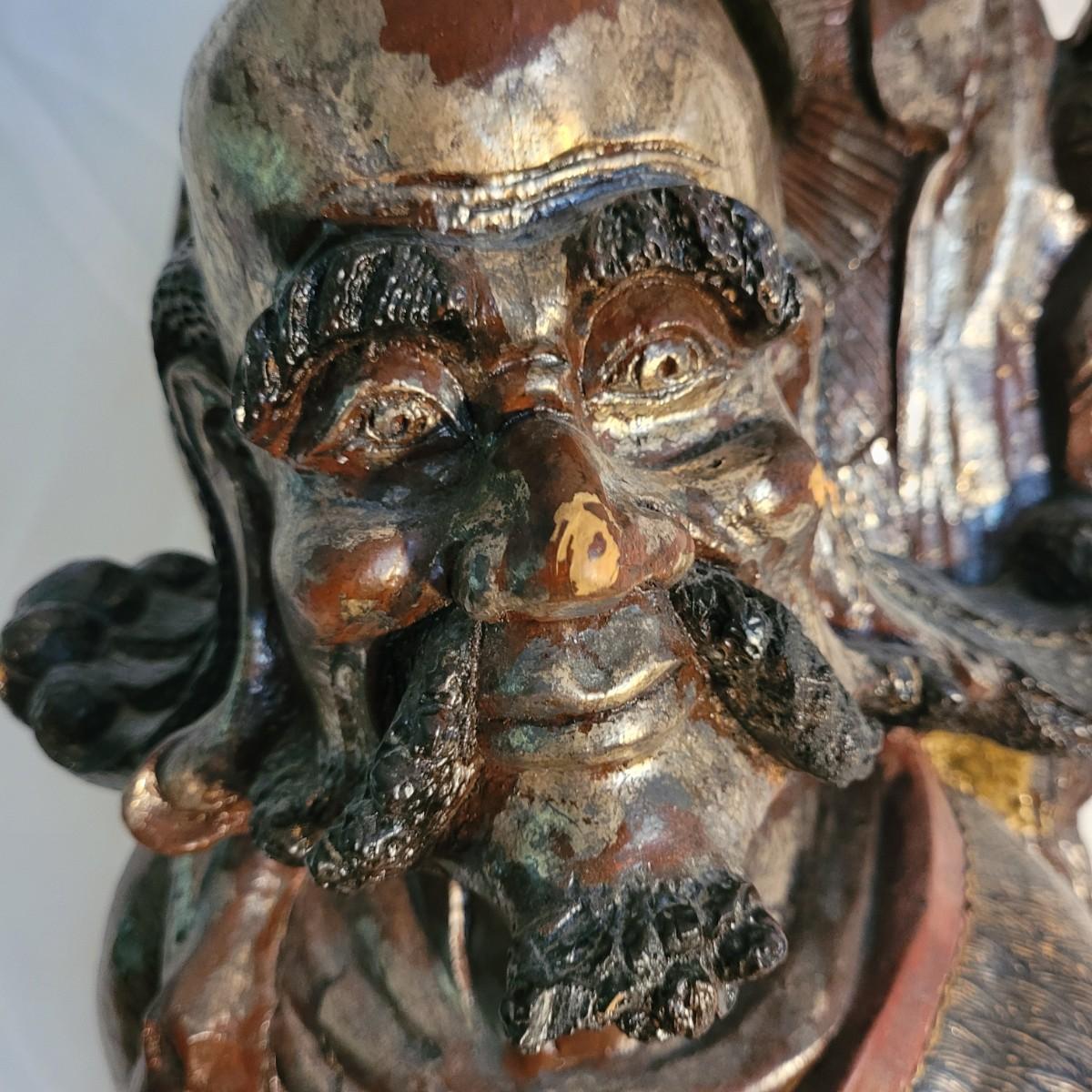 Large Asian solid wood carving statue of elderly man, with Foo dog at base. Some chipped paint throughout. Cracks in wood most prominent on lower back portion, especially at base (see close up photos of chipped areas and cracks). Overall good condition. Sturdy base. Moderately heavy due to solid wood material. Measures approximately 11"L x10"W x40.5"H. Shipping available.