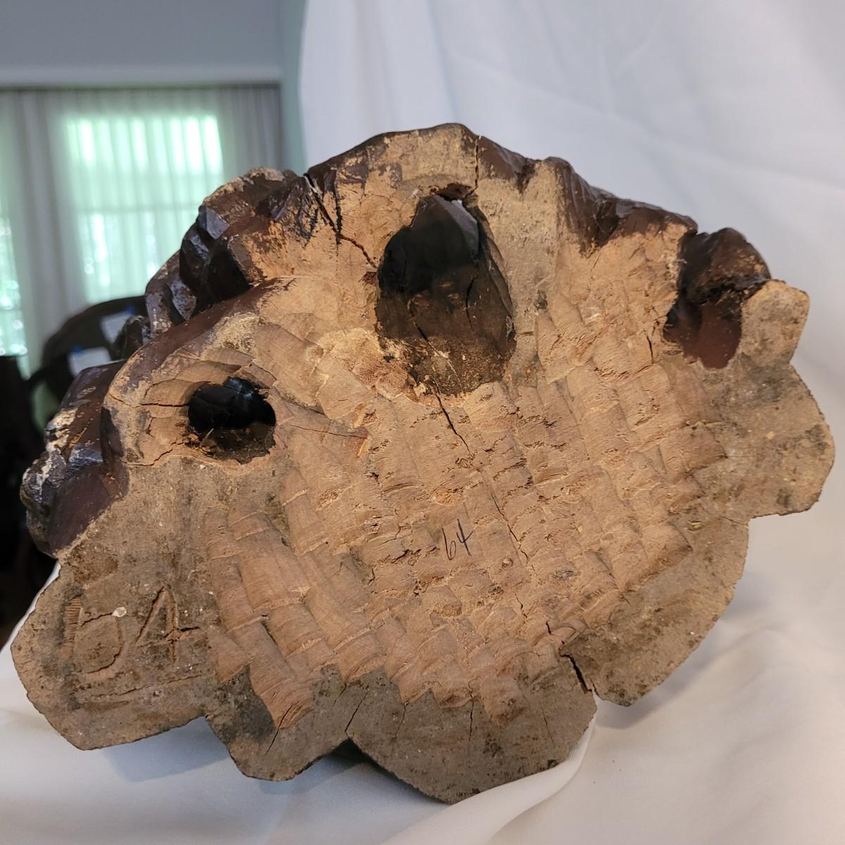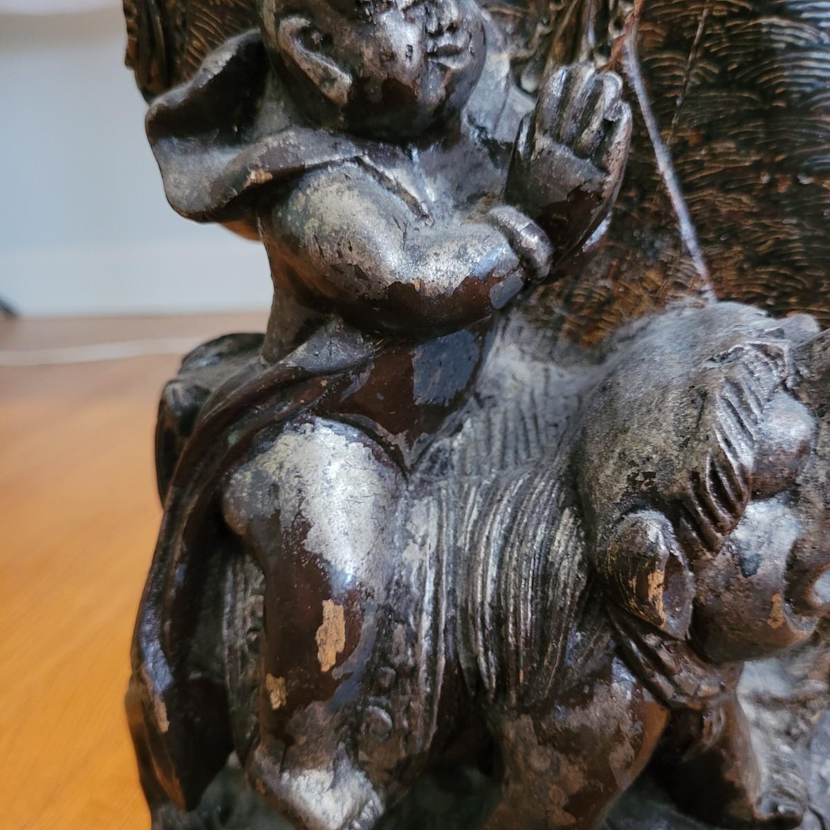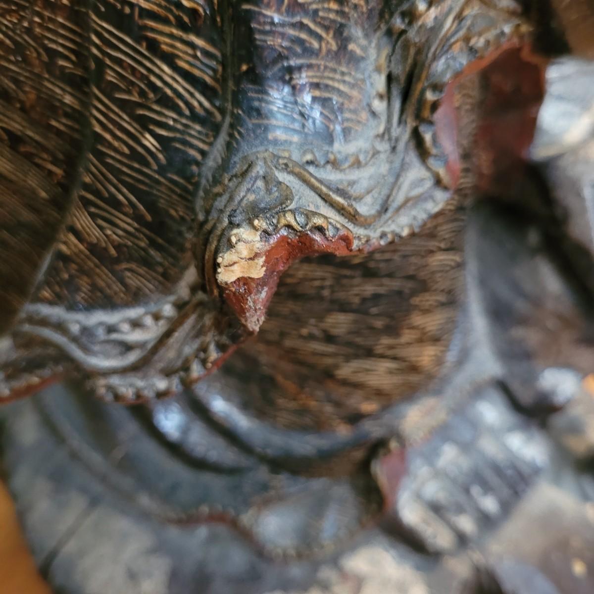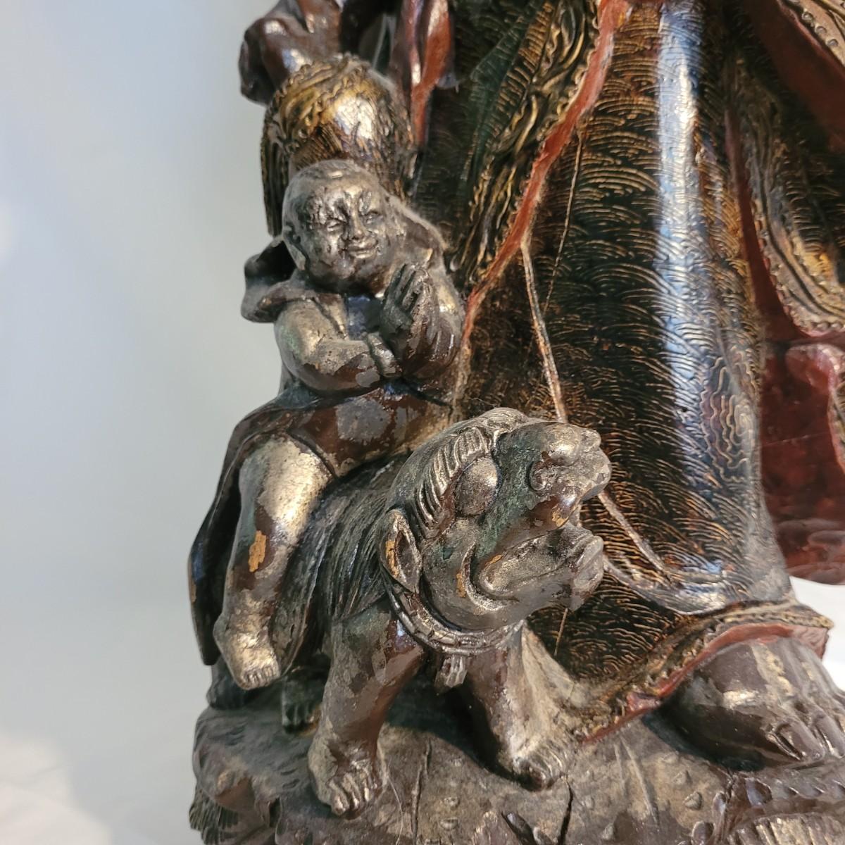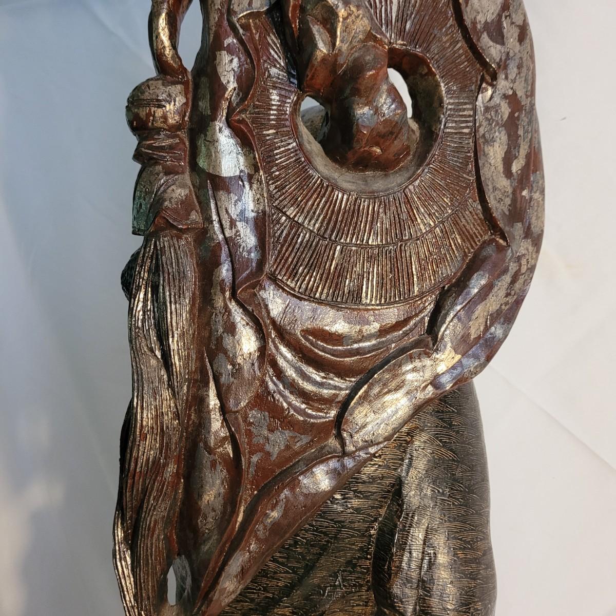 Large Asian solid wood carving statue of elderly man, with Foo dog at base. Some chipped paint throughout. Cracks in wood most prominent on lower back portion, especially at base (see close up photos of chipped areas and cracks). Overall good condition. Sturdy base. Moderately heavy due to solid wood material. Measures approximately 11"L x10"W x40.5"H. Shipping available.