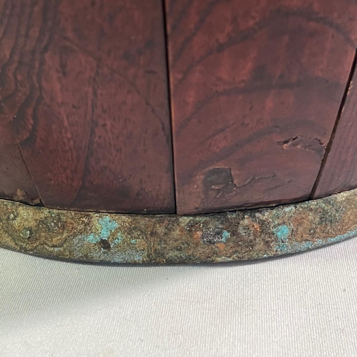 This beautiful small solid wood bucket appears to be an Asian rice bucket. The curved sections of wood have a rich red finish and are held in place with a metal strap and a metal ring around the base; note the top strap has shifted slightly and the sections have some gaps, see images. The lower ring has some rust and there is a small gauge in the wood,