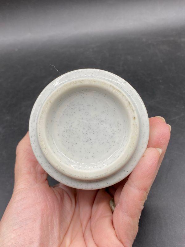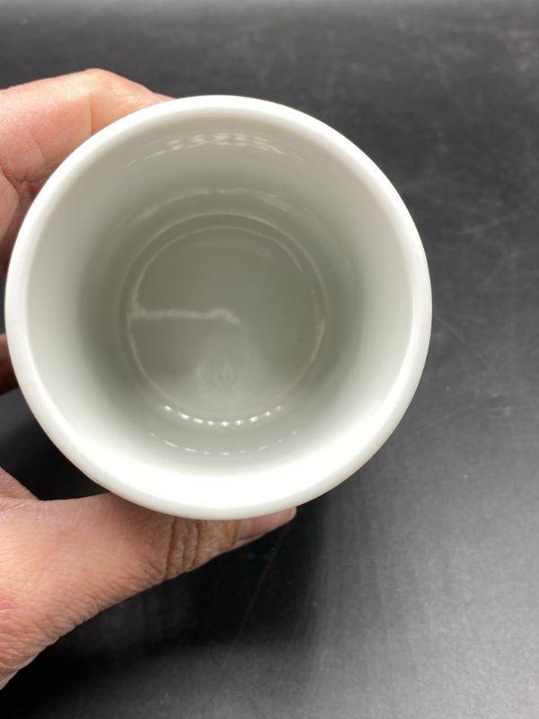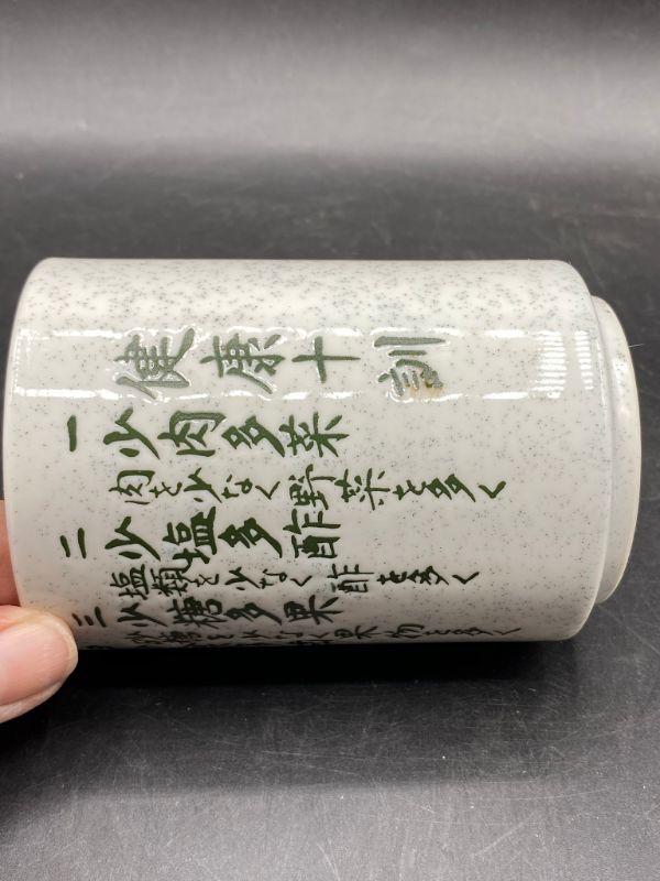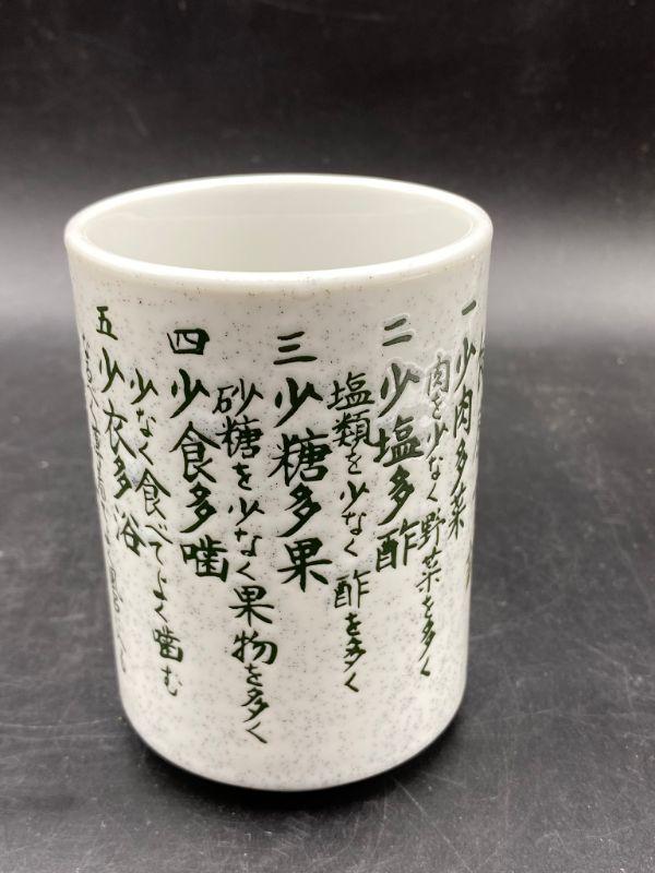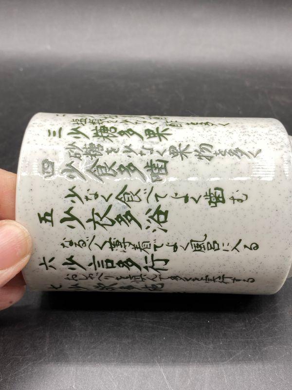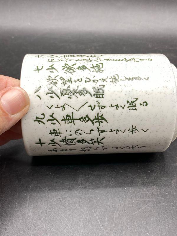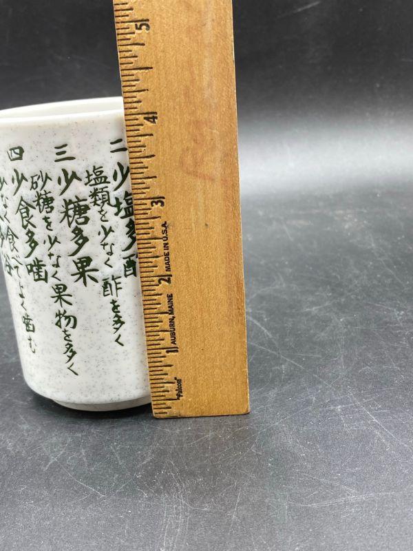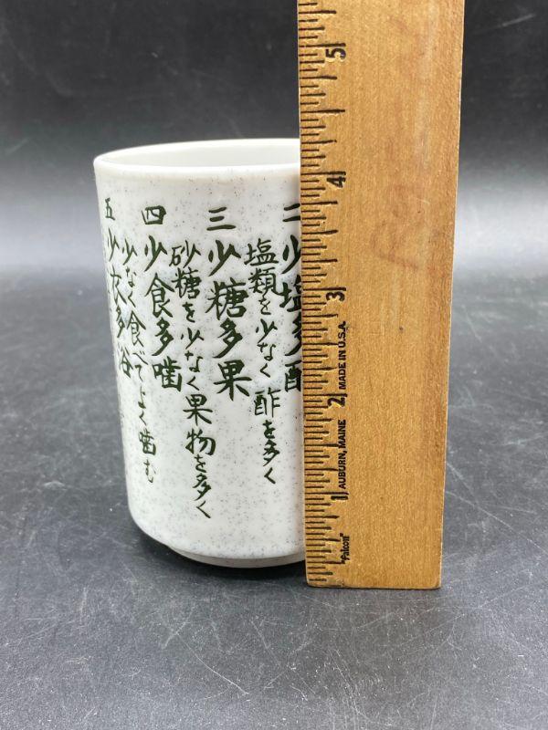 Ceramic cup with Asian style writing on it. Looks like a list of some sort. Displays nicely, no chips.