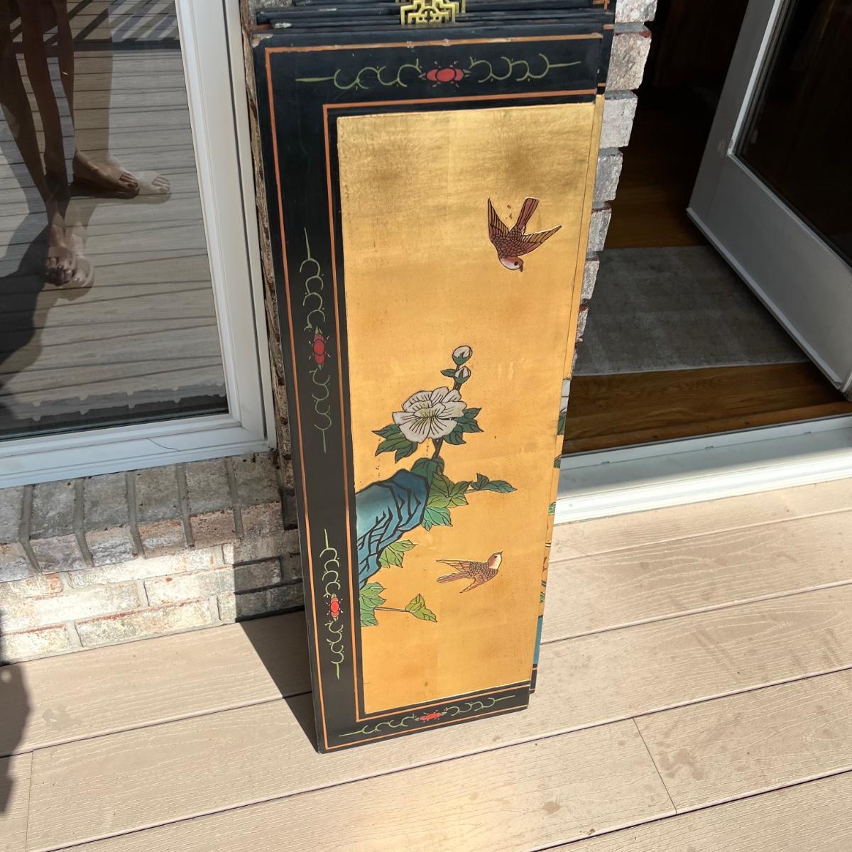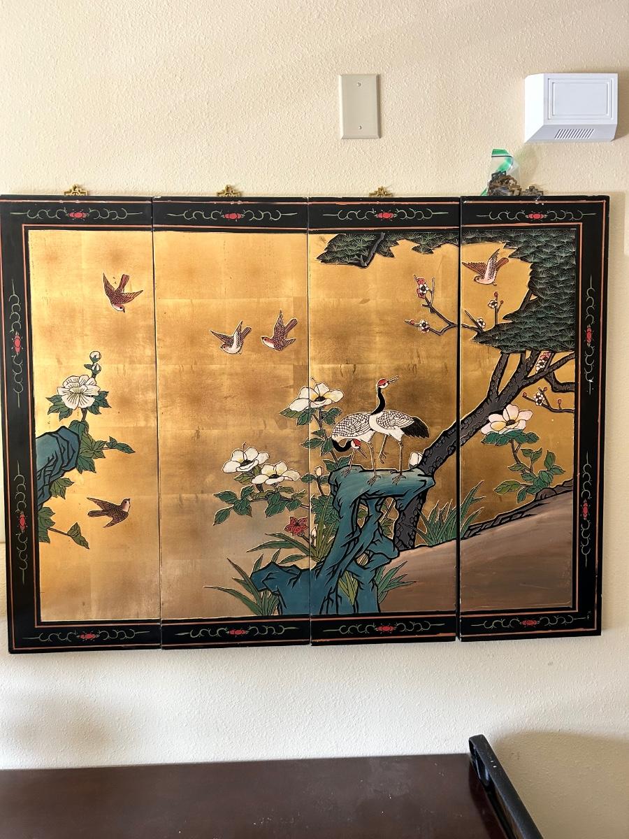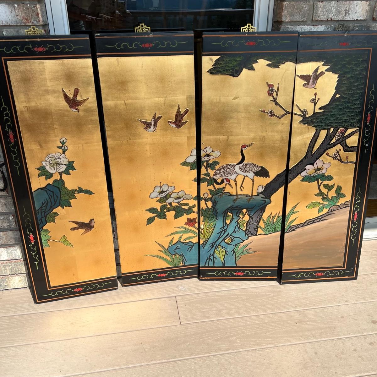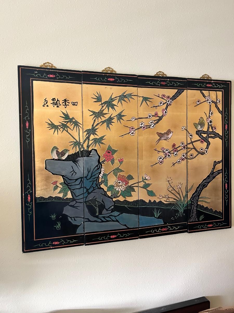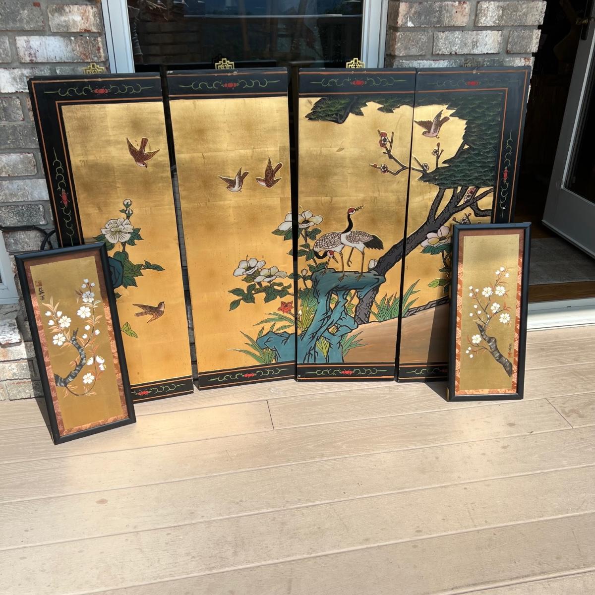 Two large four panel Asian-style painted panel wall hangings on wood. Each panel measures 12”x 36” x 1”H. Two other framed painted screens are 8.75” x 20.75” x .75”H. These both appear to depict cherry blossoms on a branch with a gold background.
