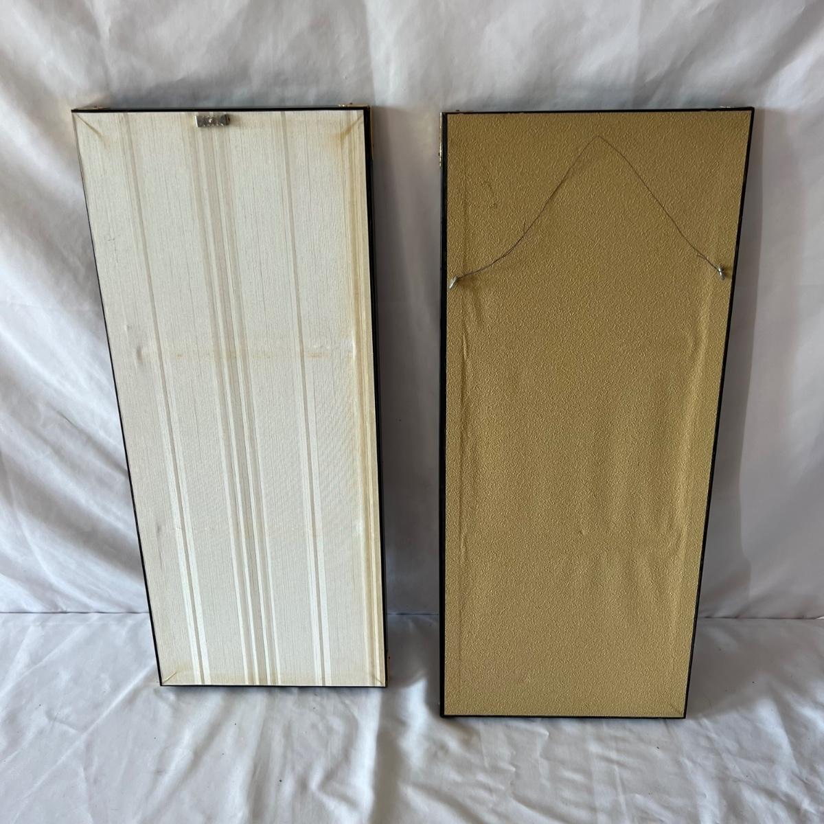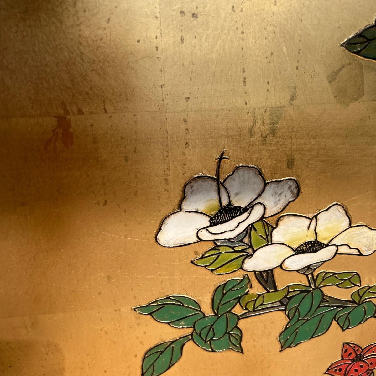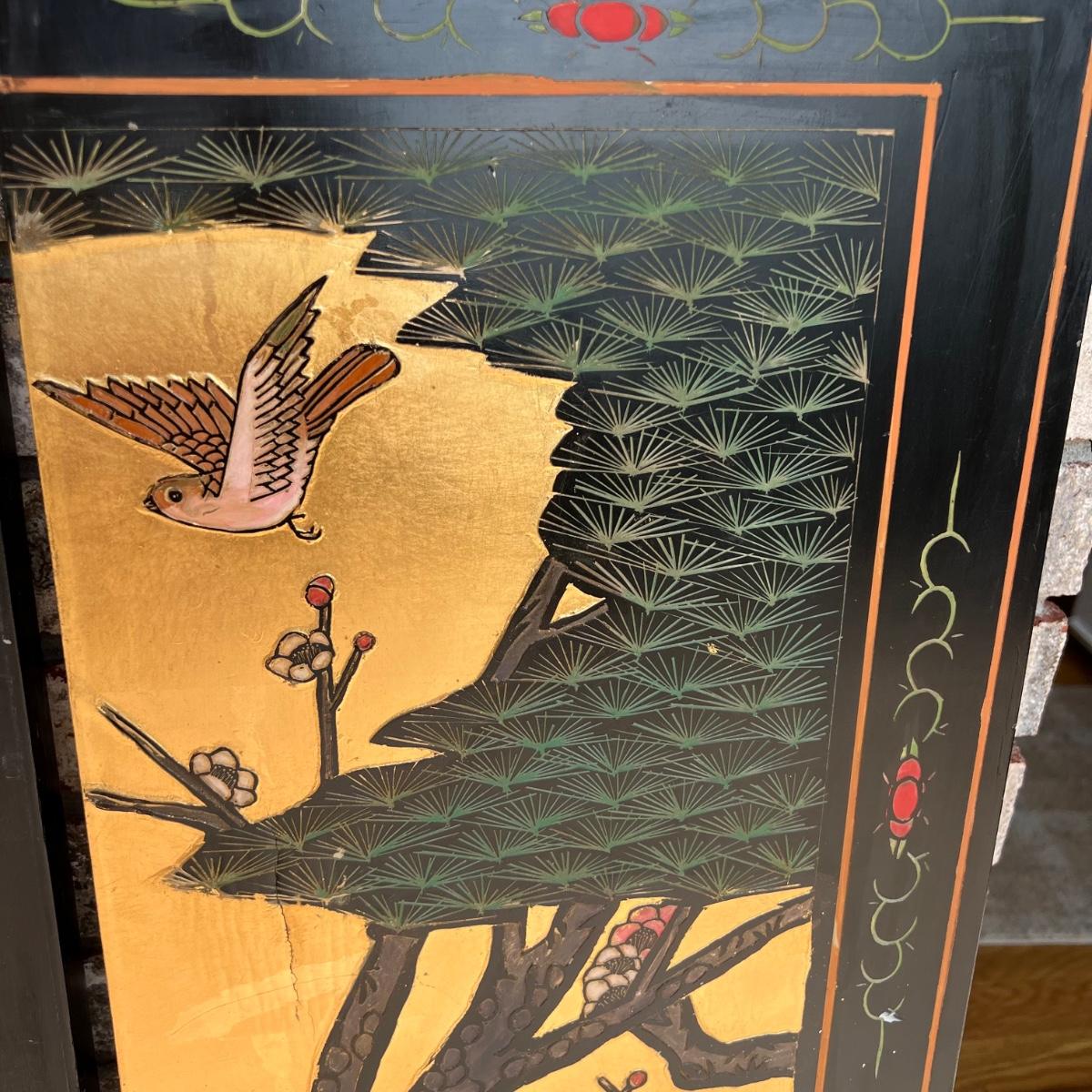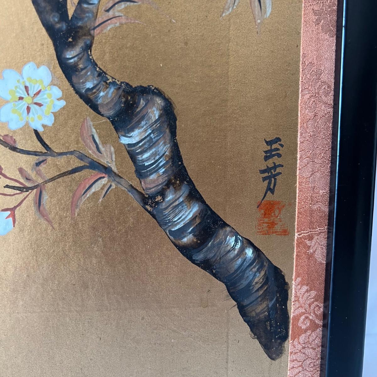 Two large four panel Asian-style painted panel wall hangings on wood. Each panel measures 12”x 36” x 1”H. Two other framed painted screens are 8.75” x 20.75” x .75”H. These both appear to depict cherry blossoms on a branch with a gold background.