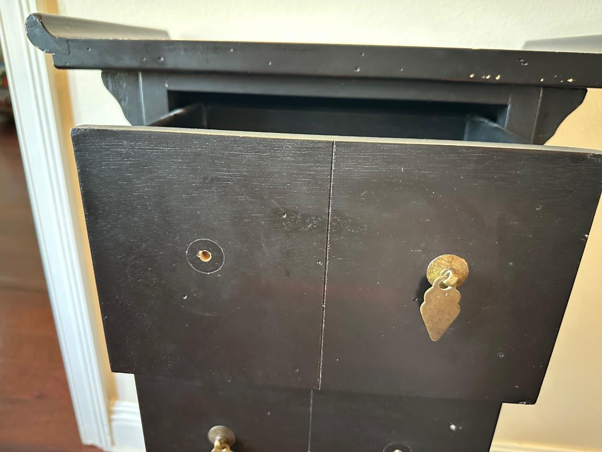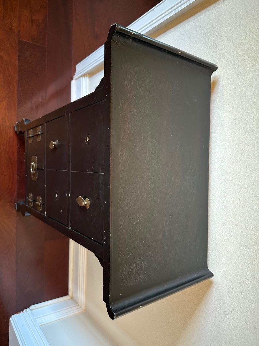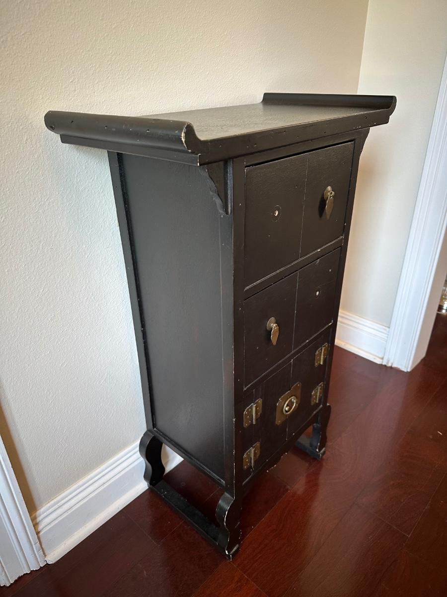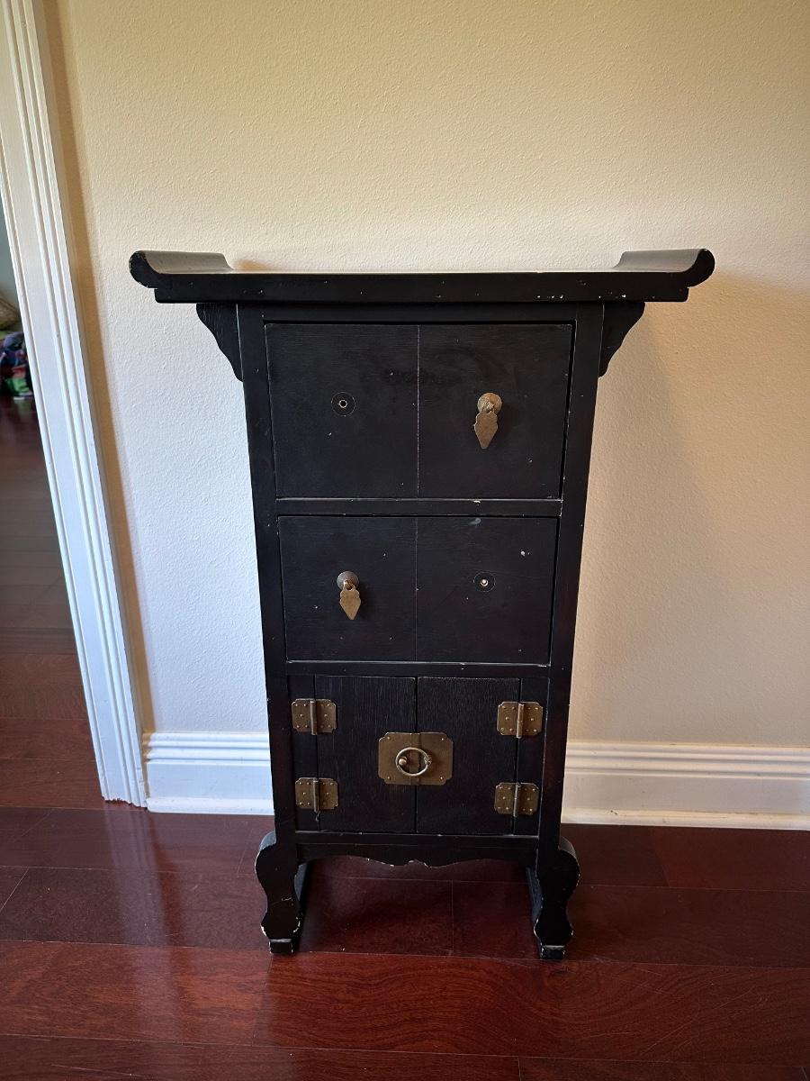 Compact Asian-style accent cabinet featuring two drawers over a lower double-door compartment. * Two drawer pulls are missing.