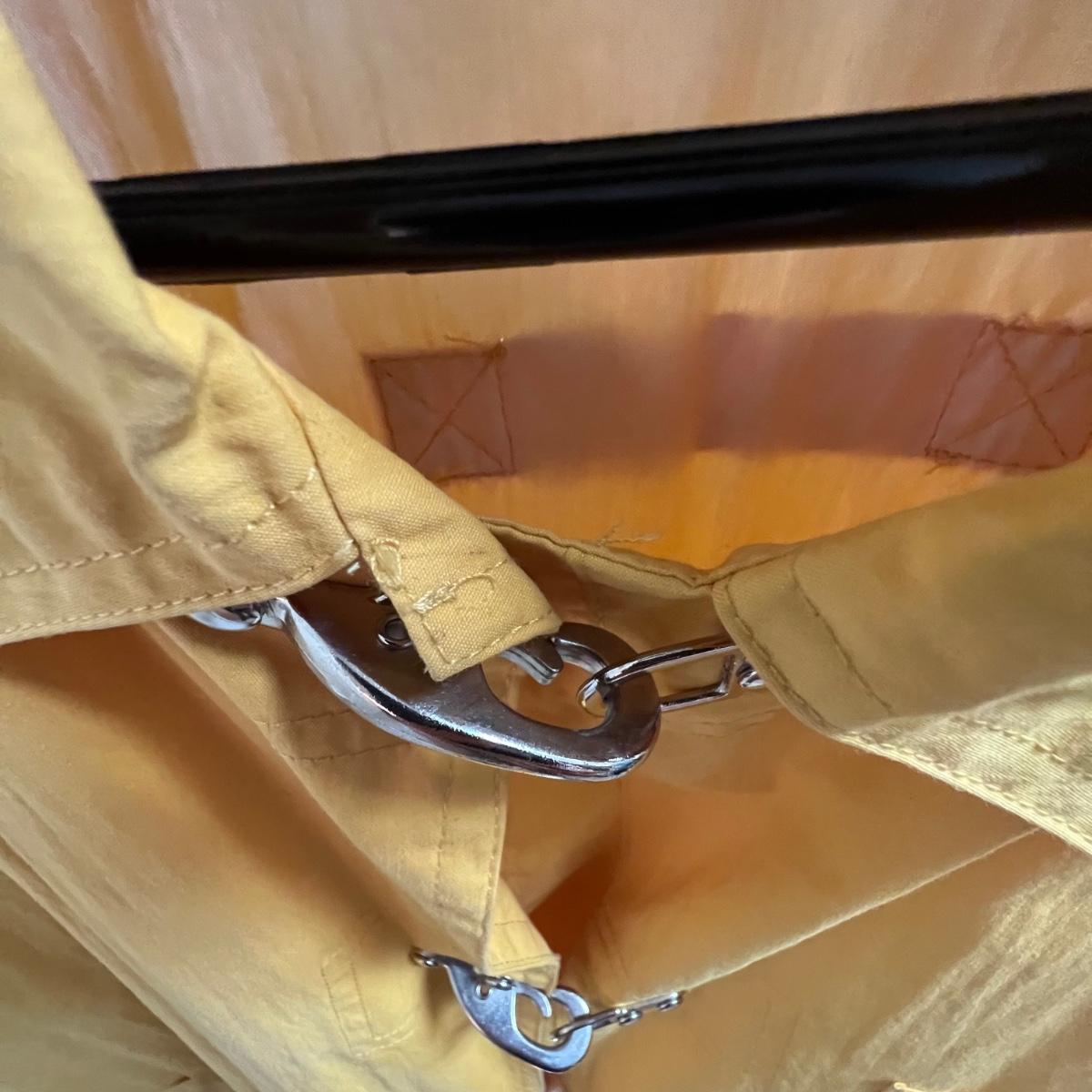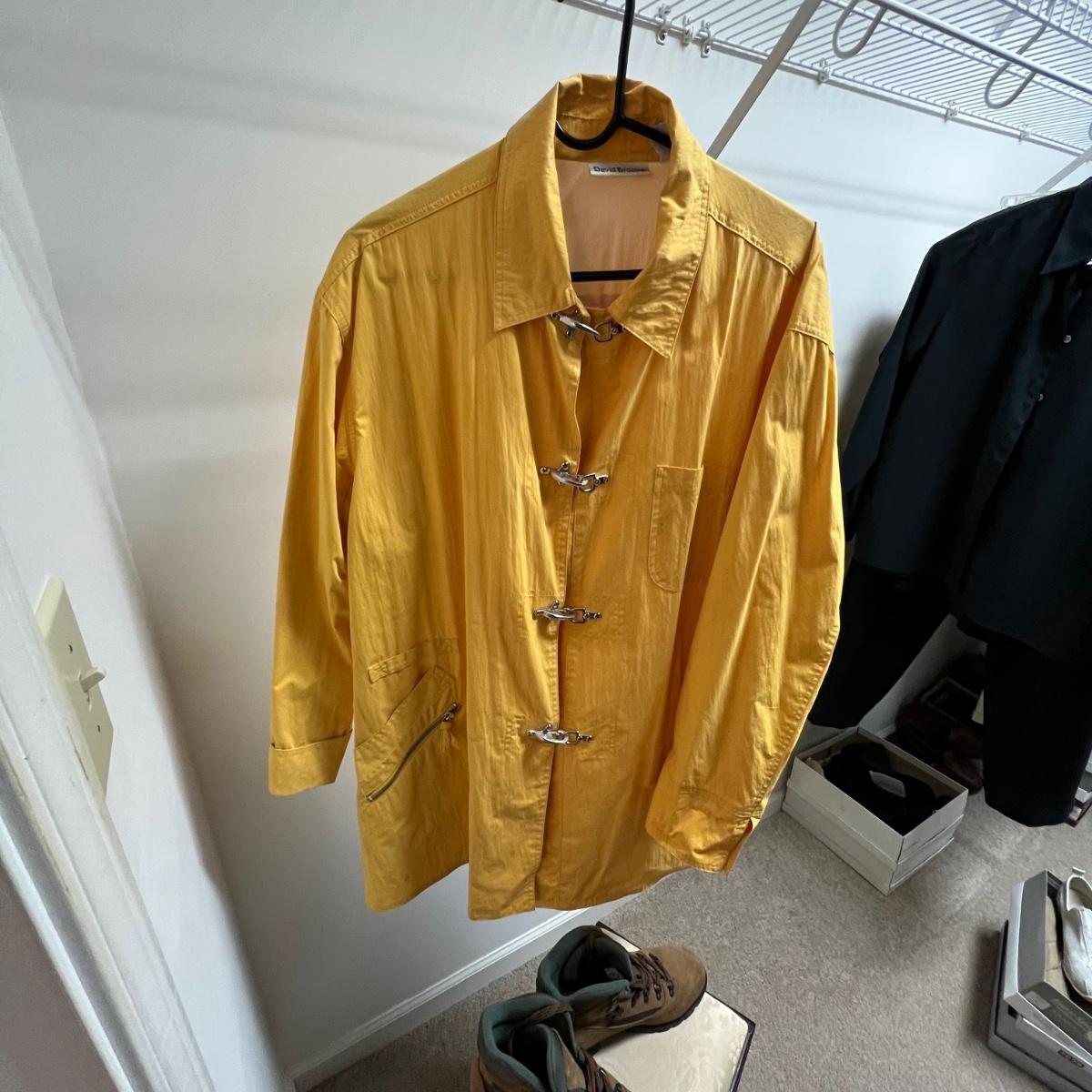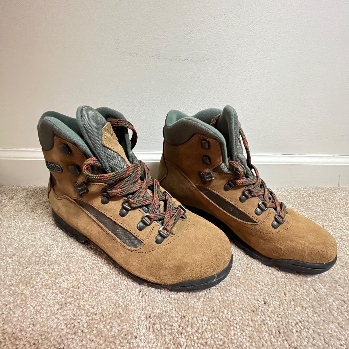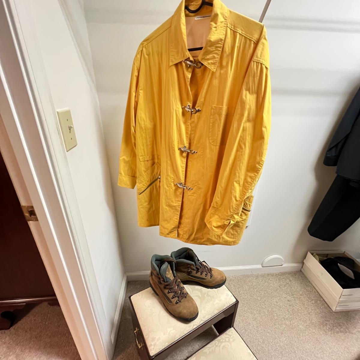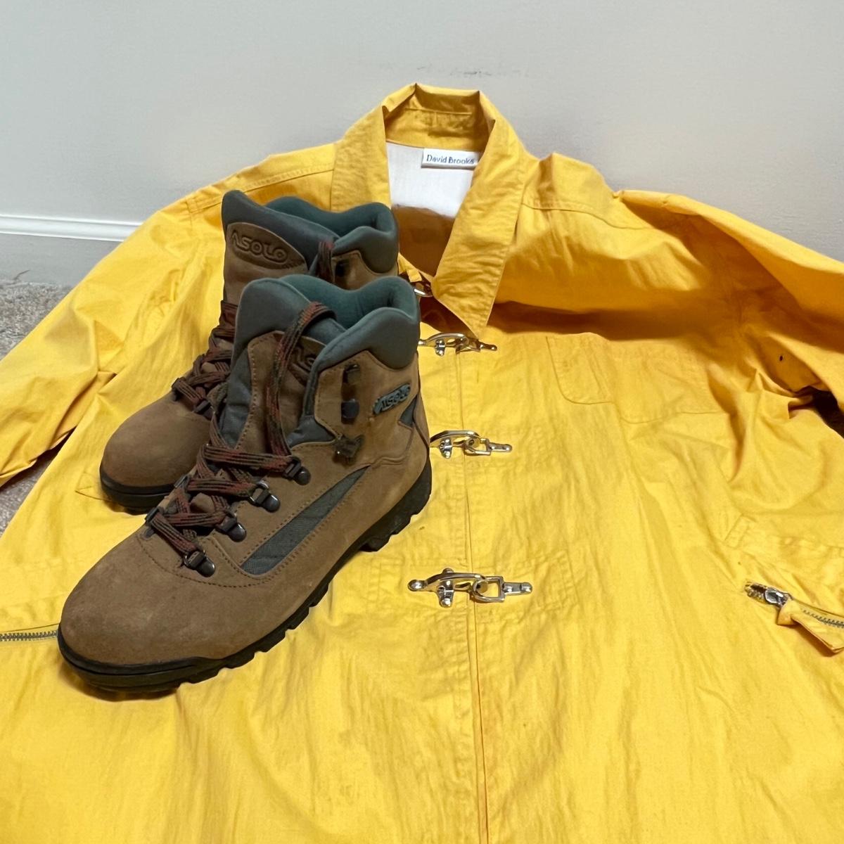 This pair of size 8.5 hiking boots are in very good condition with many, many miles to go! We have paired them with a vintage David Brooks yellow rain jacket with metal clasp hooks in size medium.