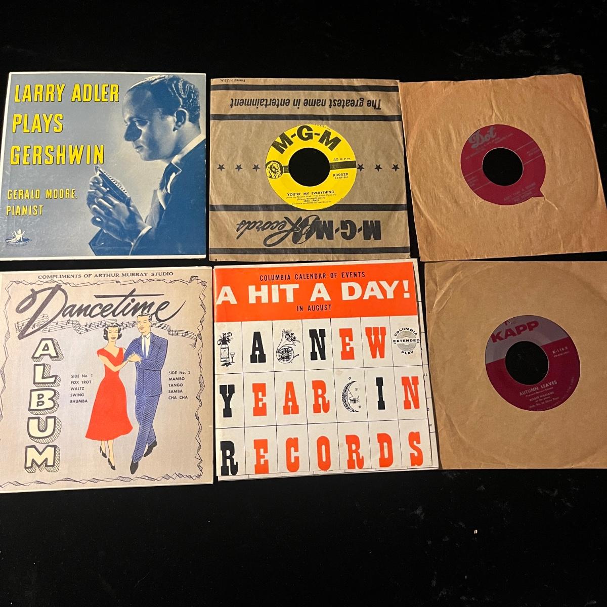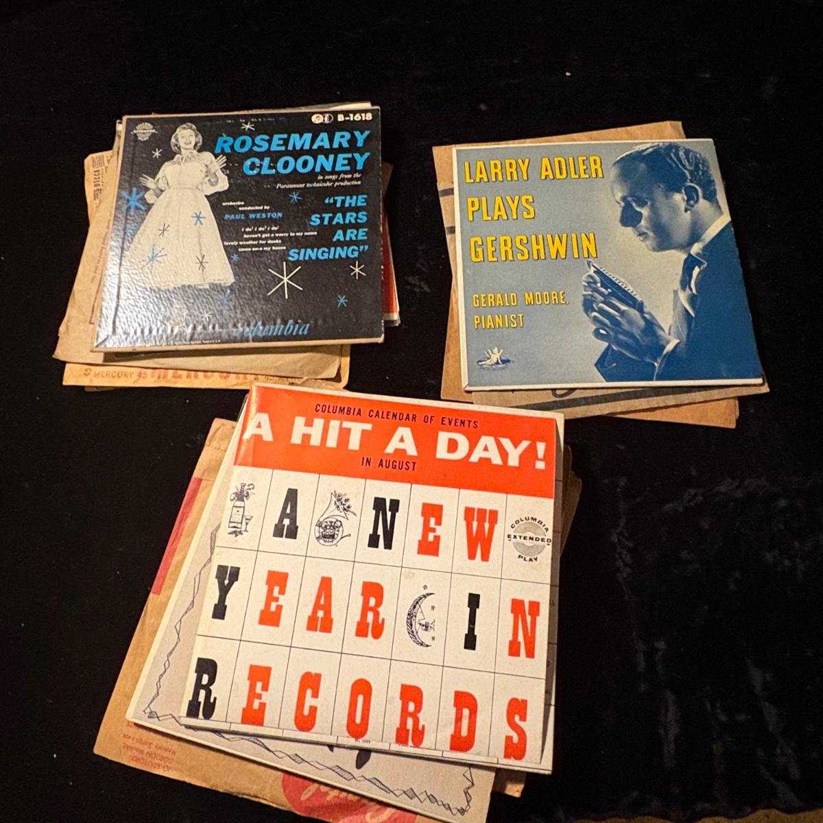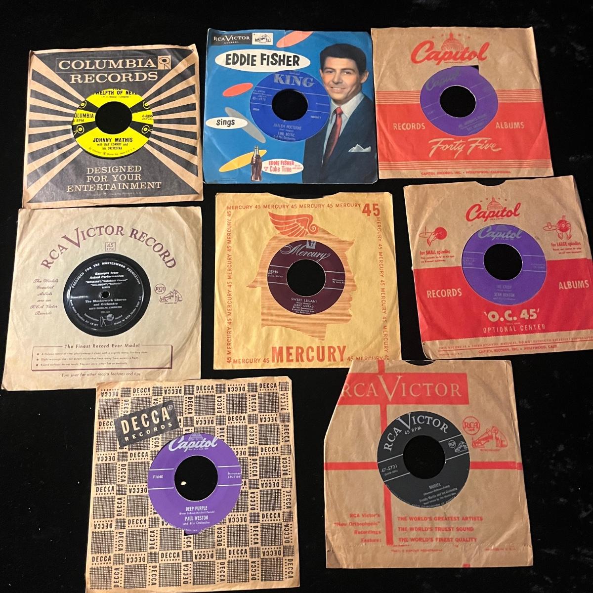 23 large and small spindle 45 RPM records. Appear to be mainly popular orchestral and/or singers from the 1960s, i.e. Pat Boone, Rosemary Clooney, Johnny Mathis and more.