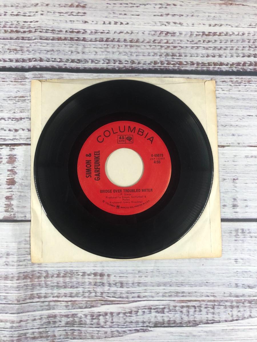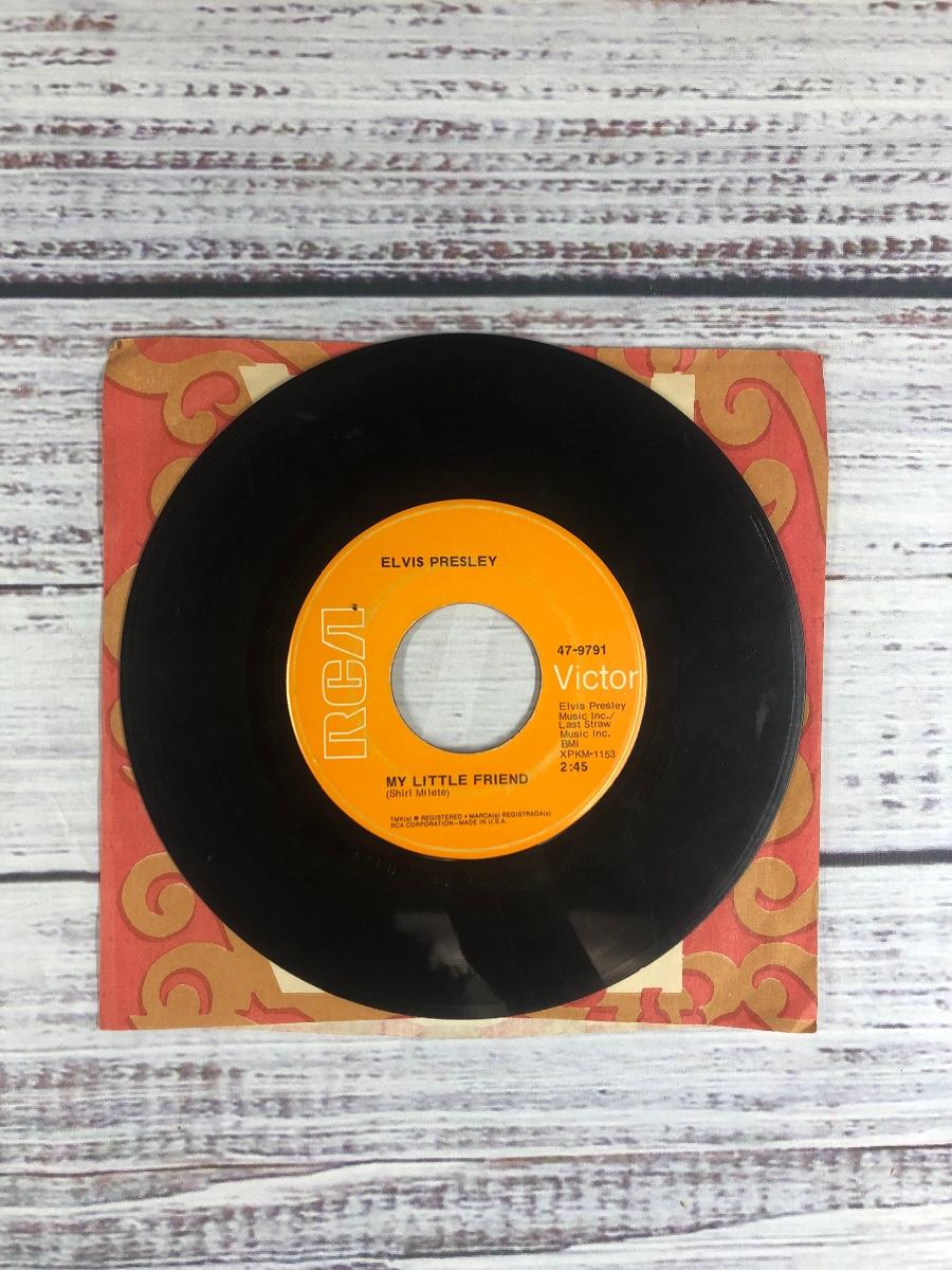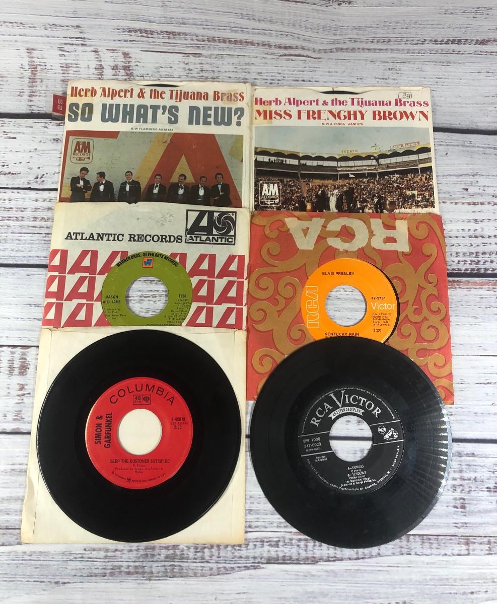 Assorted 7” vinyl including Elvis Presley and Simon and Garfunkel.