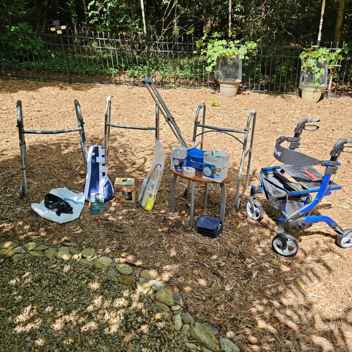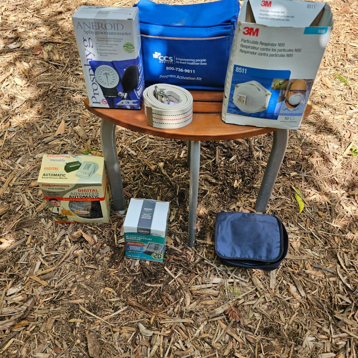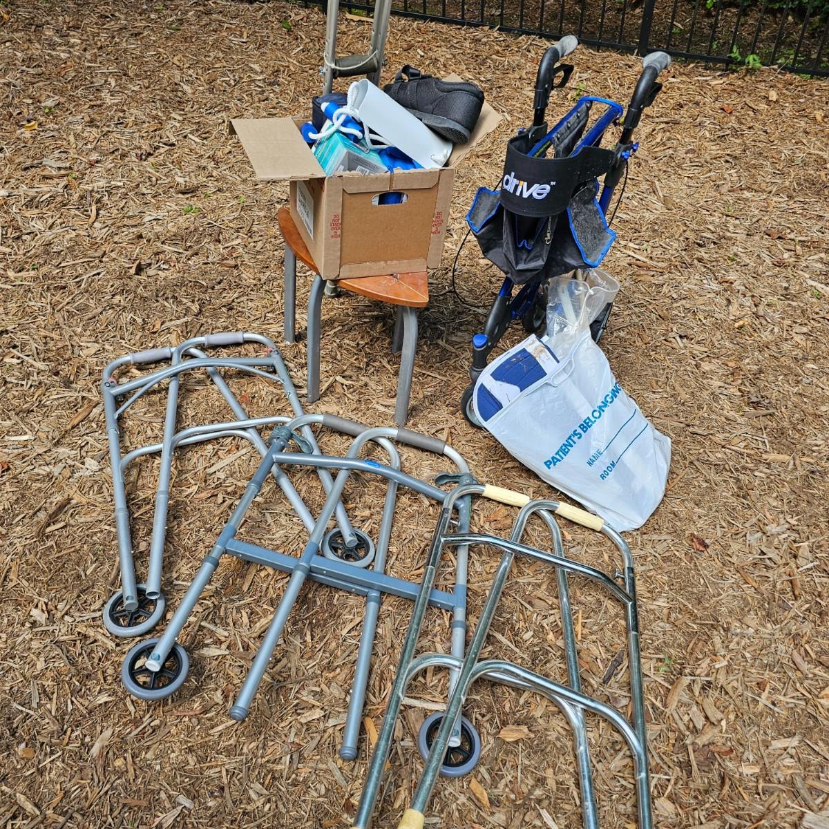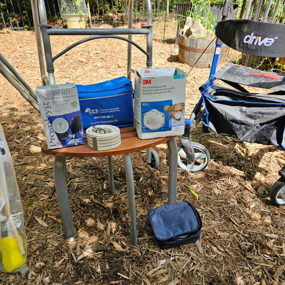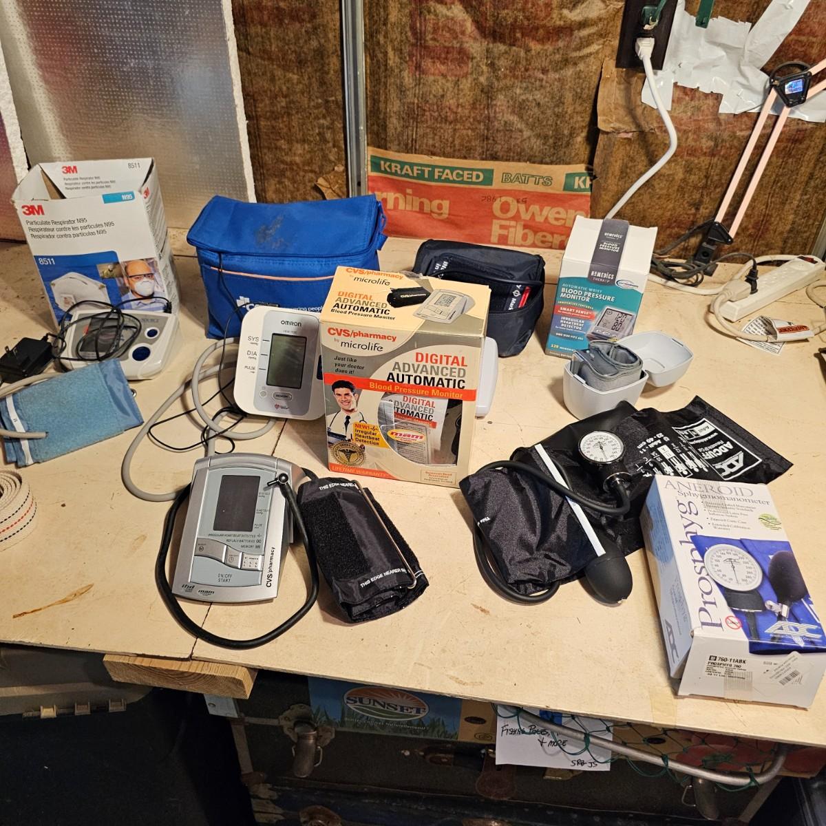Numerous items of healthcare equipment. Three folding walkers, Invacare, Drive and one older. Items measure approximately 20" x 16" x 33"H, two have rolling wheels. The Blue Drive unit is a walker/seat combo, has four rolling wheels, brakes, a carry bag and a back support strap. Measures 25" x 27" x 35"H, folds for storage. Five different styles of blood pressure cuffs, including a manual model. Other items have auto functions, some are battery and others are electric. Plug in units powered on when plugged in, battery units not tested. Also includes a pair of aluminum crutches, a foot brace, a leg brace and other items. One corner shower chair, 22" x 16" x 17"H. All items have some wear and use. See photos for details. Local pickup only.