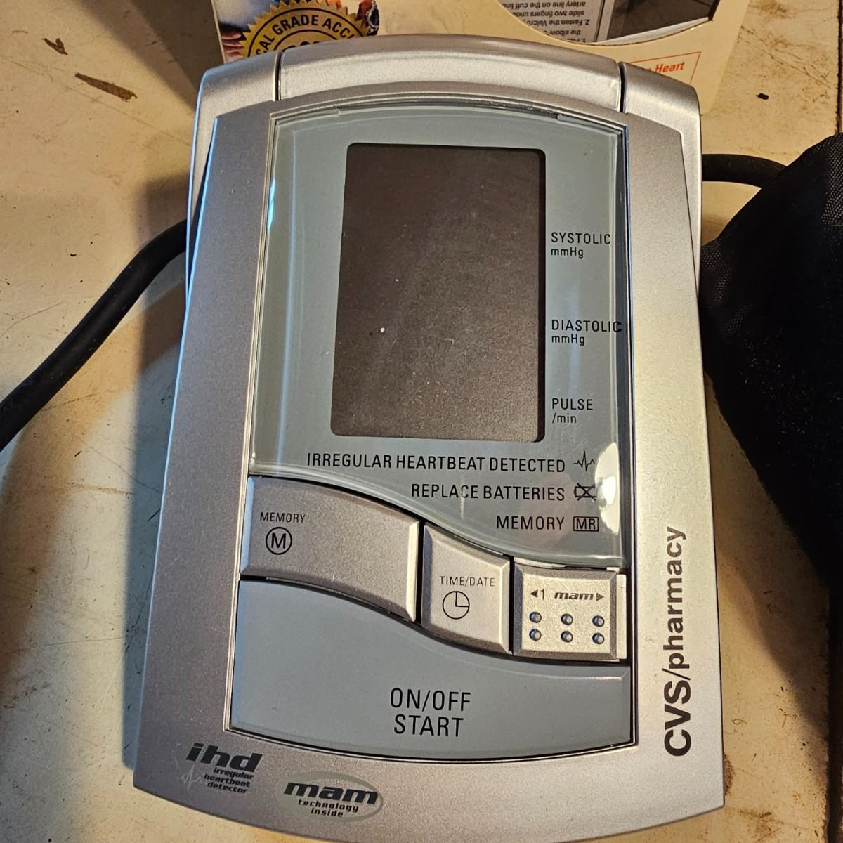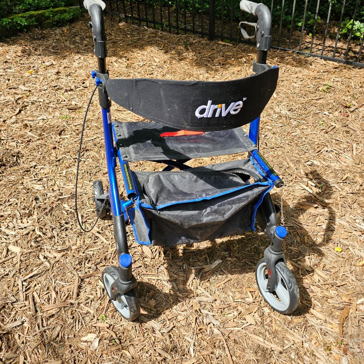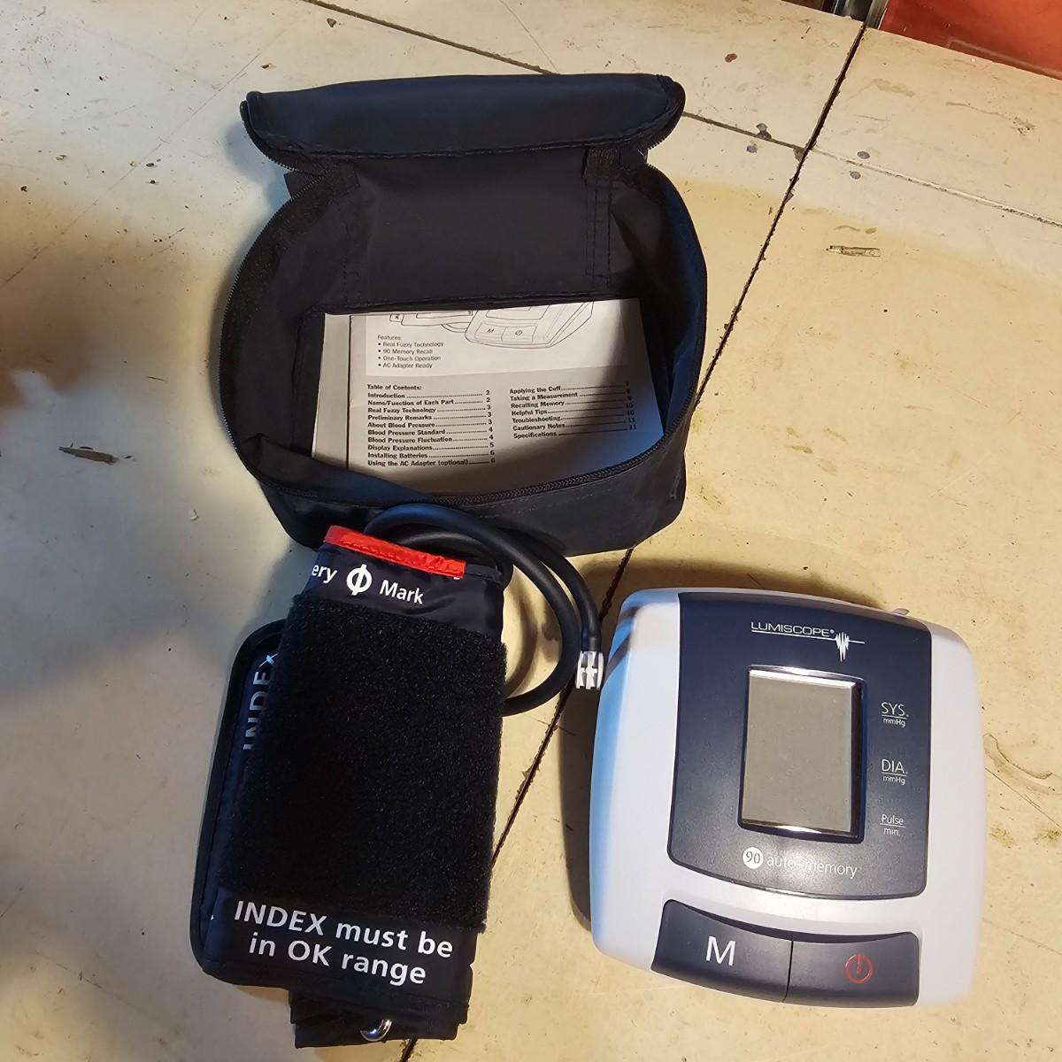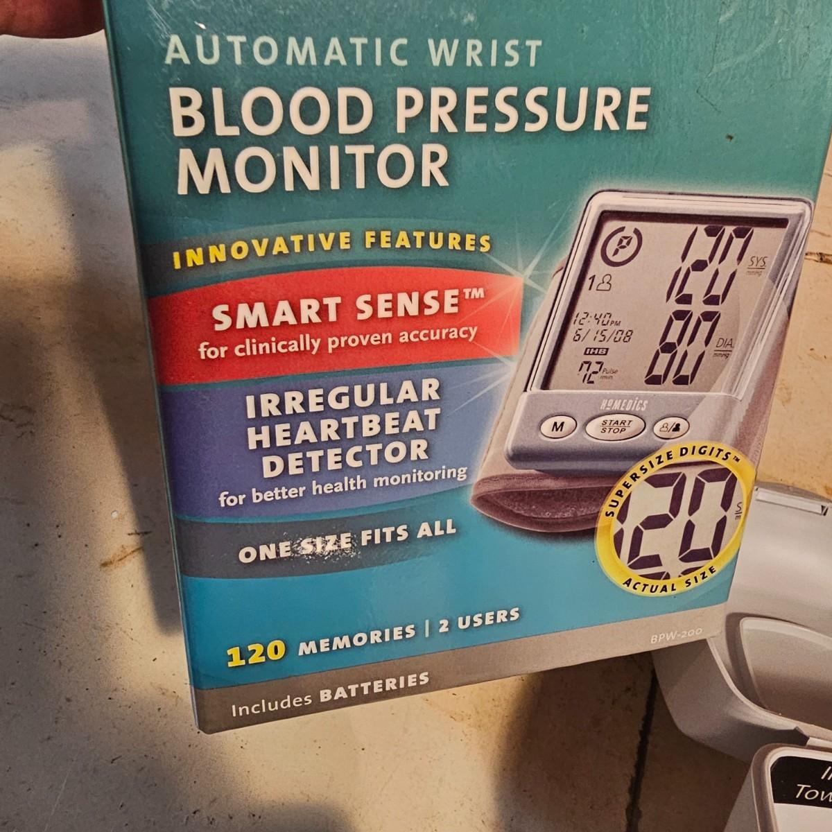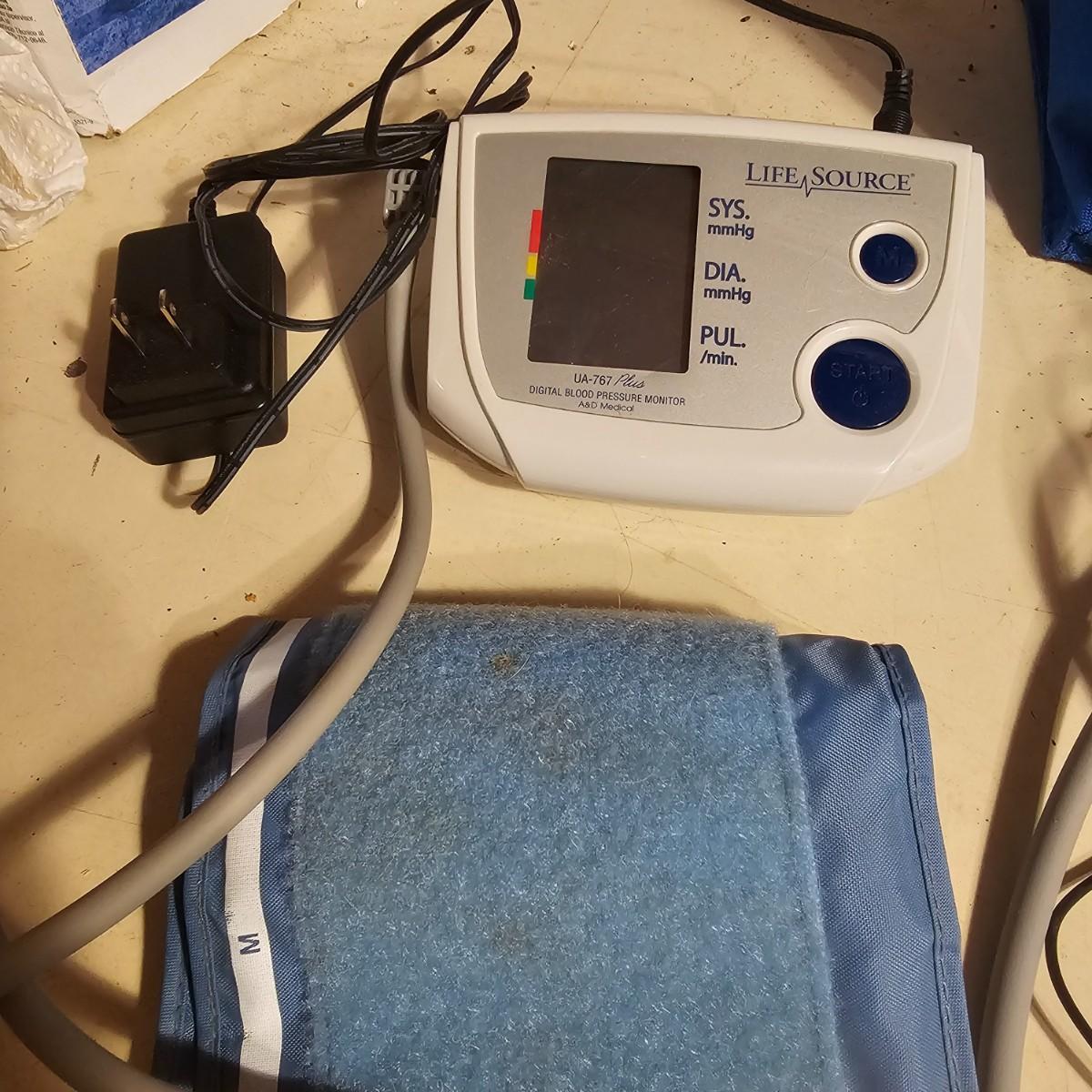 Numerous items of healthcare equipment. Three folding walkers, Invacare, Drive and one older. Items measure approximately 20" x 16" x 33"H, two have rolling wheels. The Blue Drive unit is a walker/seat combo, has four rolling wheels, brakes, a carry bag and a back support strap. Measures 25" x 27" x 35"H, folds for storage. Five different styles of blood pressure cuffs, including a manual model. Other items have auto functions, some are battery and others are electric. Plug in units powered on when plugged in, battery units not tested. Also includes a pair of aluminum crutches, a foot brace, a leg brace and other items. One corner shower chair, 22" x 16" x 17"H. All items have some wear and use. See photos for details. Local pickup only.