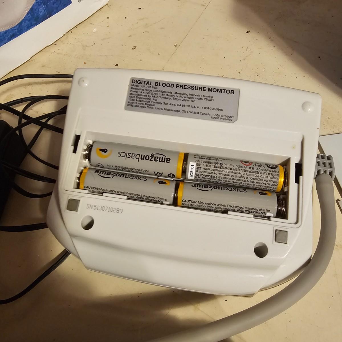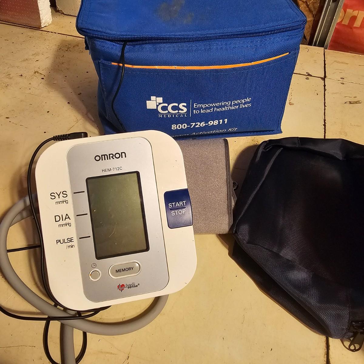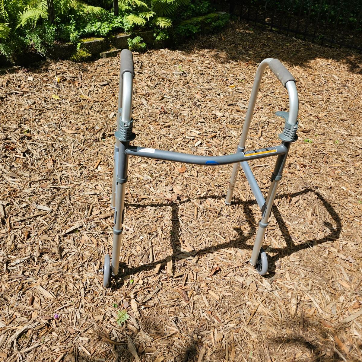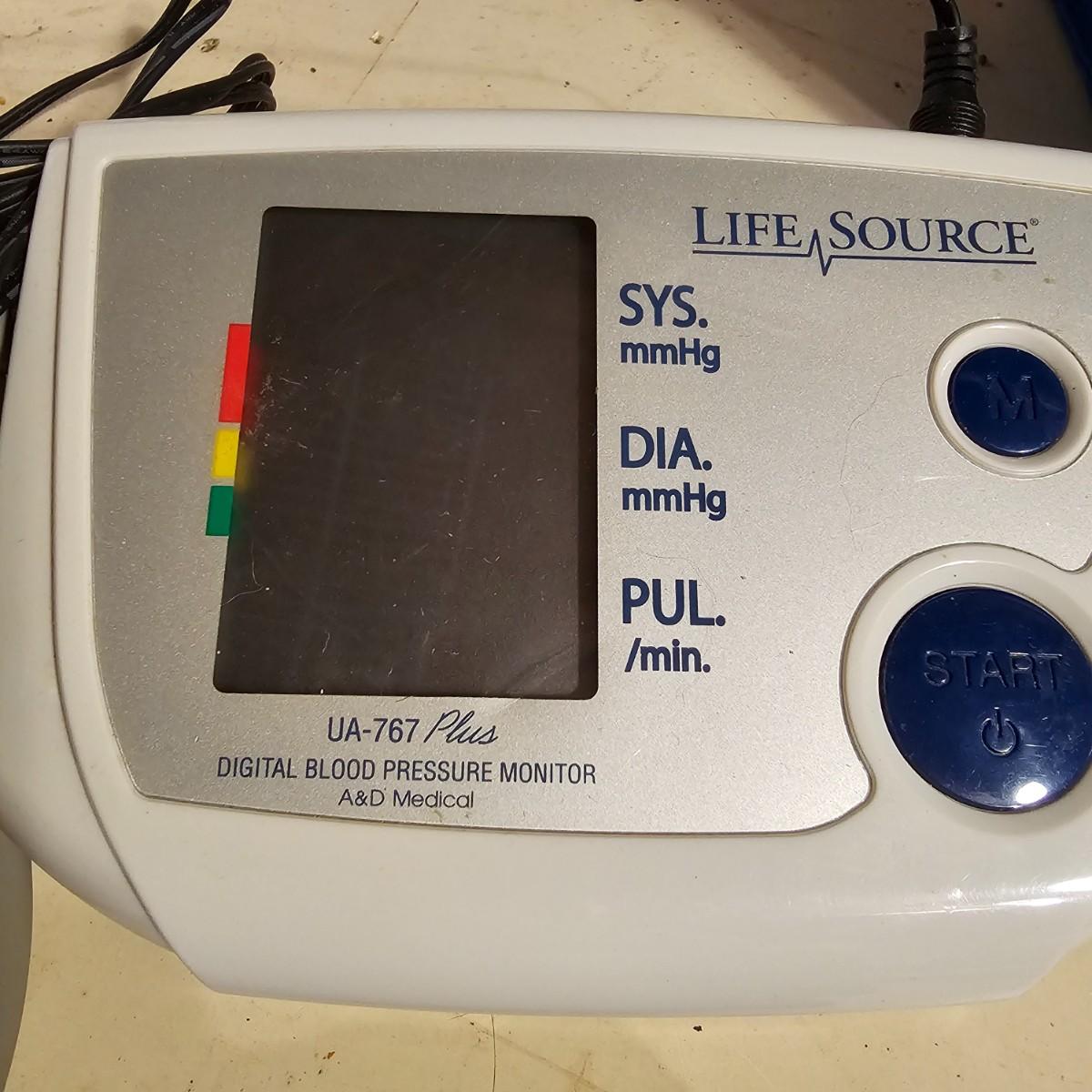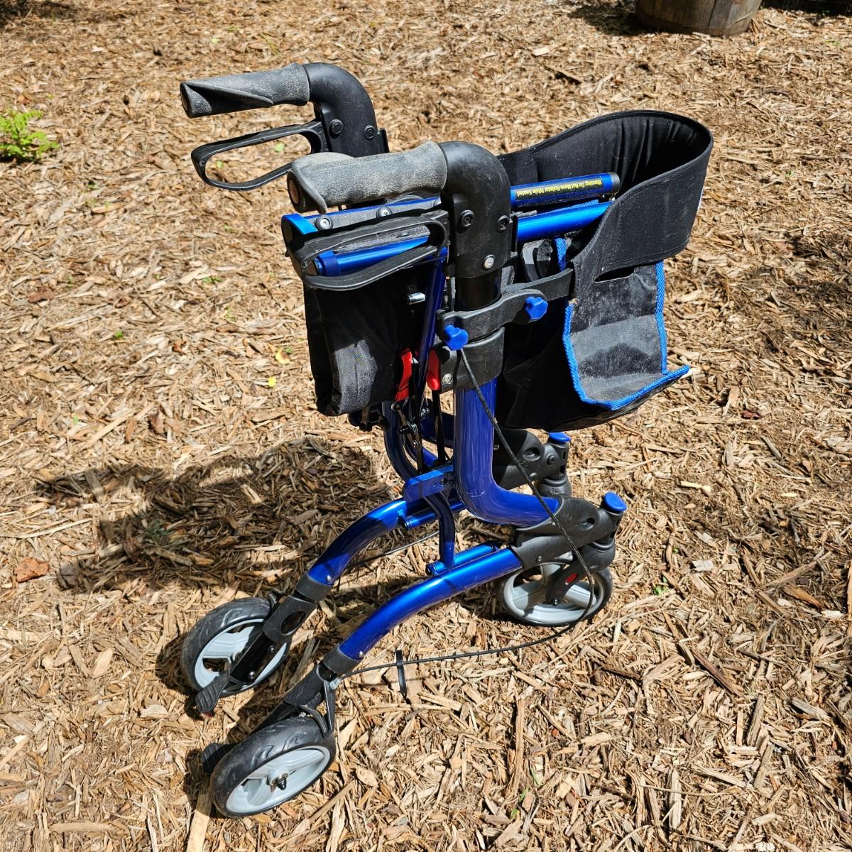 Numerous items of healthcare equipment. Three folding walkers, Invacare, Drive and one older. Items measure approximately 20" x 16" x 33"H, two have rolling wheels. The Blue Drive unit is a walker/seat combo, has four rolling wheels, brakes, a carry bag and a back support strap. Measures 25" x 27" x 35"H, folds for storage. Five different styles of blood pressure cuffs, including a manual model. Other items have auto functions, some are battery and others are electric. Plug in units powered on when plugged in, battery units not tested. Also includes a pair of aluminum crutches, a foot brace, a leg brace and other items. One corner shower chair, 22" x 16" x 17"H. All items have some wear and use. See photos for details. Local pickup only.