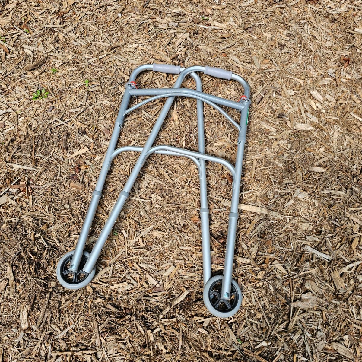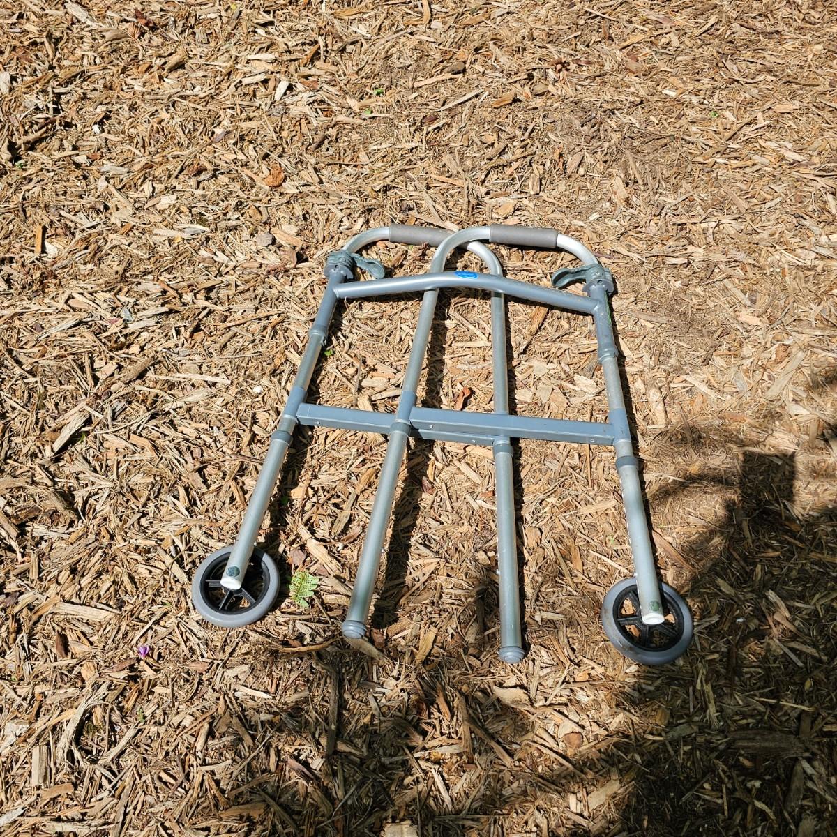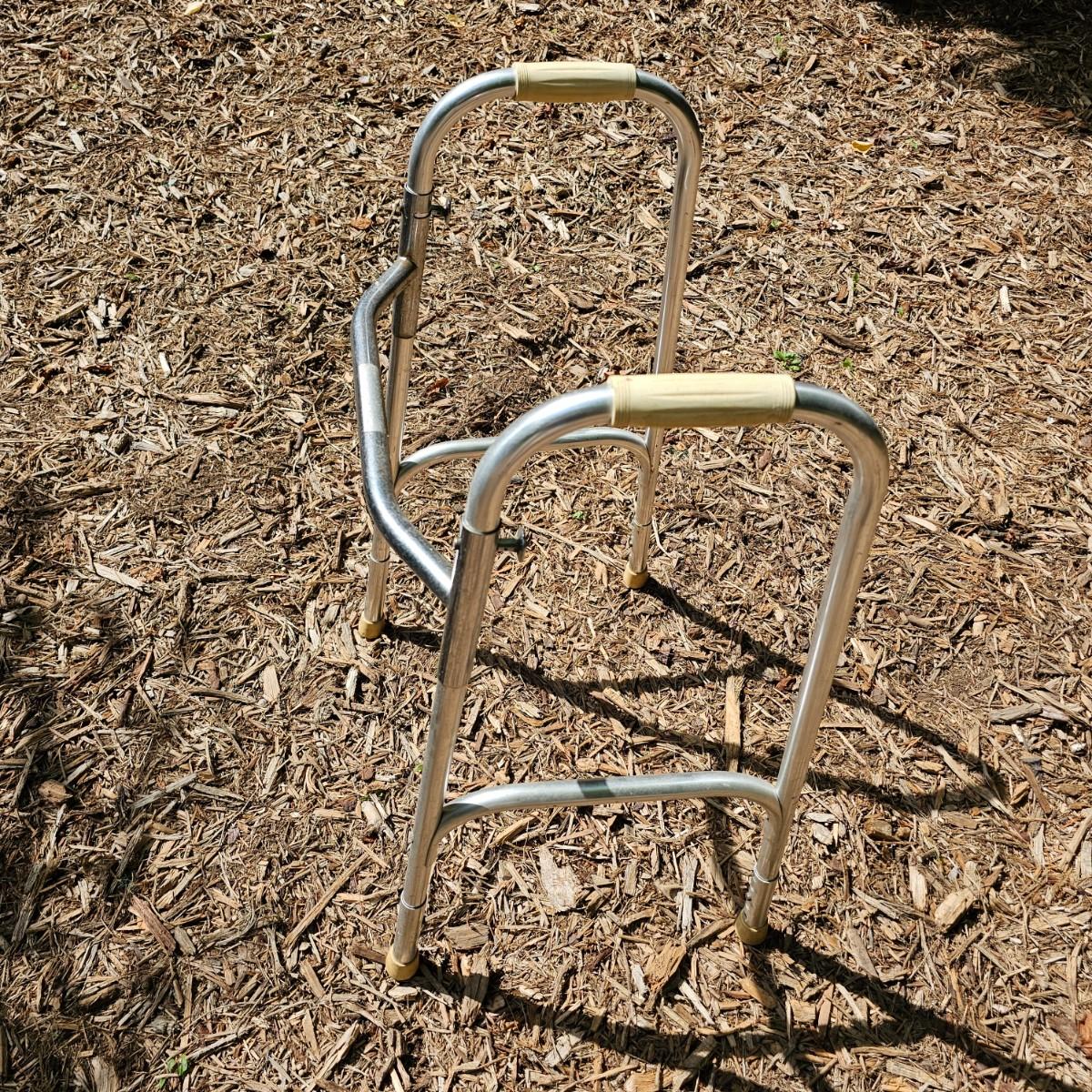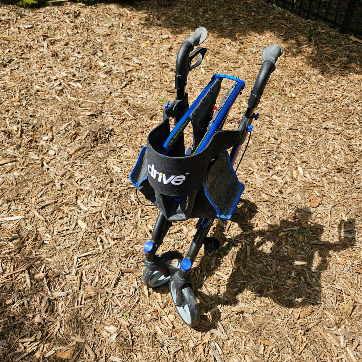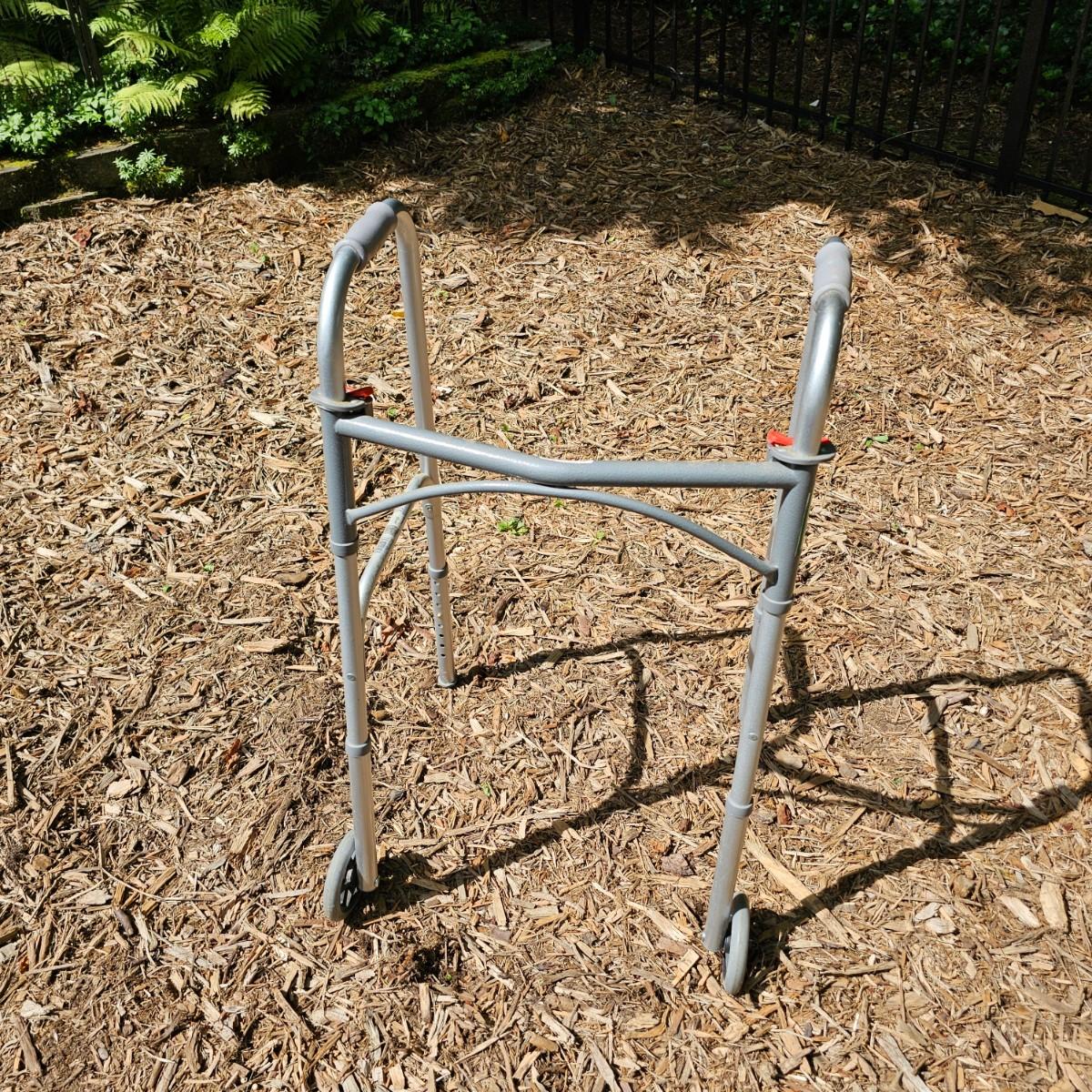 Numerous items of healthcare equipment. Three folding walkers, Invacare, Drive and one older. Items measure approximately 20" x 16" x 33"H, two have rolling wheels. The Blue Drive unit is a walker/seat combo, has four rolling wheels, brakes, a carry bag and a back support strap. Measures 25" x 27" x 35"H, folds for storage. Five different styles of blood pressure cuffs, including a manual model. Other items have auto functions, some are battery and others are electric. Plug in units powered on when plugged in, battery units not tested. Also includes a pair of aluminum crutches, a foot brace, a leg brace and other items. One corner shower chair, 22" x 16" x 17"H. All items have some wear and use. See photos for details. Local pickup only.