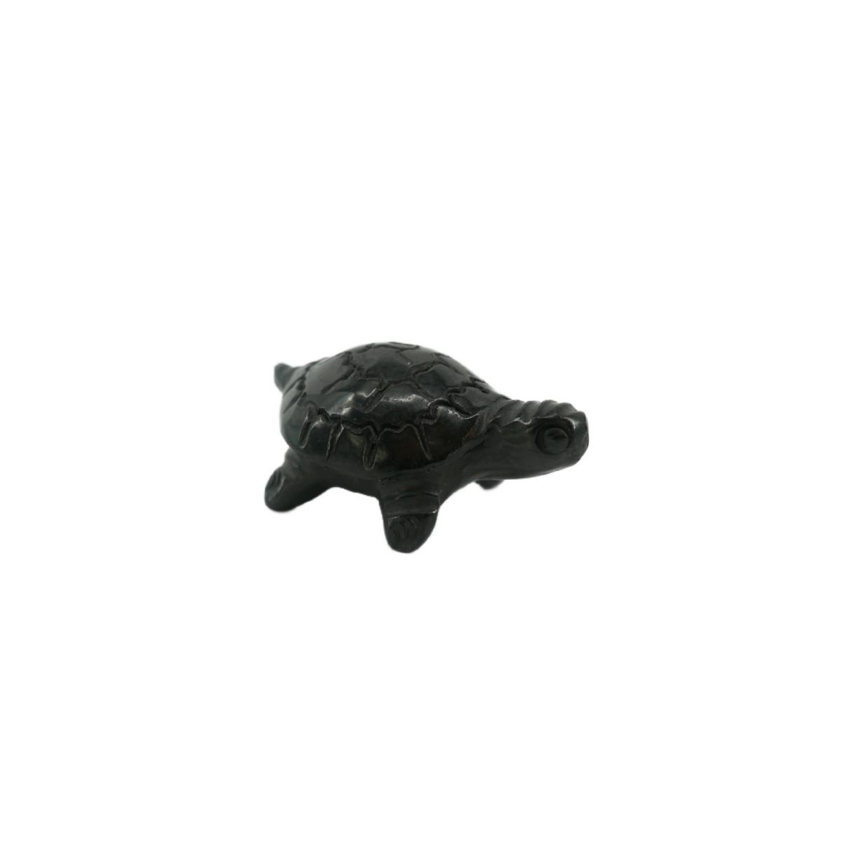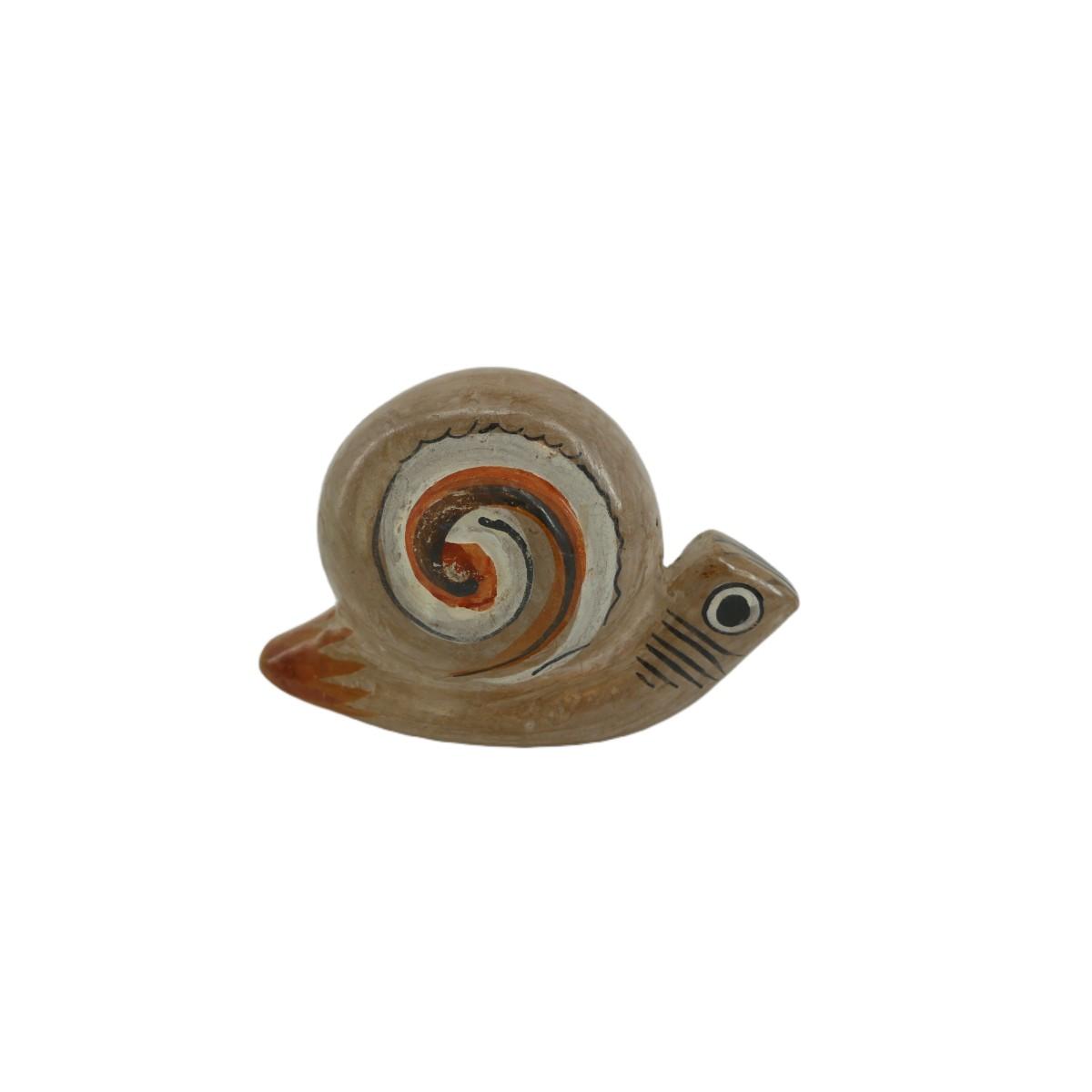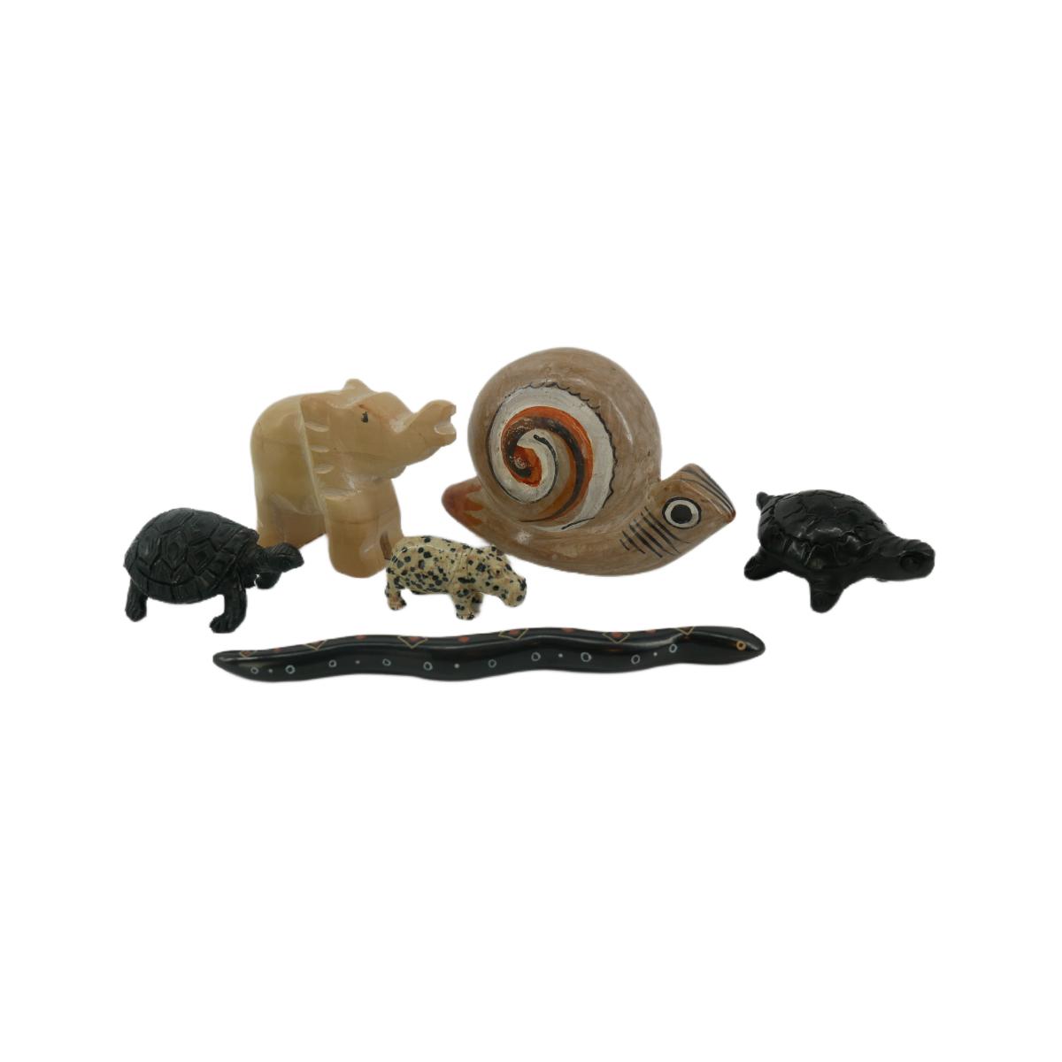 Six assorted animal figurines. Two hand carved black turtle figurines. One made of stone and signed "Elvis", other made of clay and unsigned. Hand carved stone elephant, unsigned. Handmade and hand painted wooden snake, signed "Ty Moquino 3 yrs". Handmade and hand painted snail with bird and floral design, and spotted jasper hippo. All in excellent condition. Largest piece measures L 4" x H 2.5" x W 1.5". Lot weighs 10 oz. (R30)
