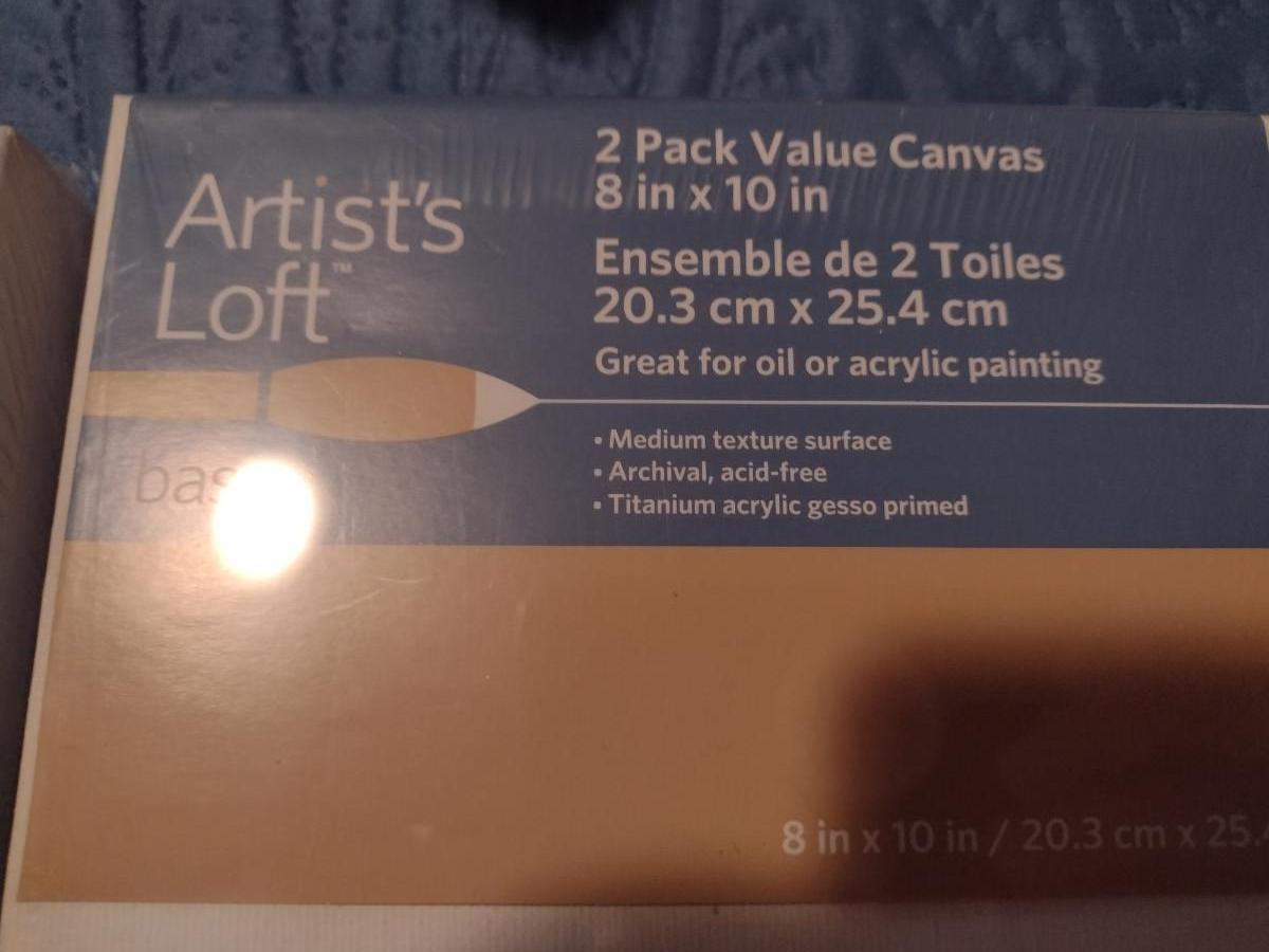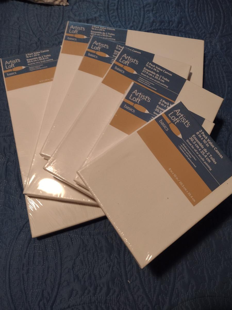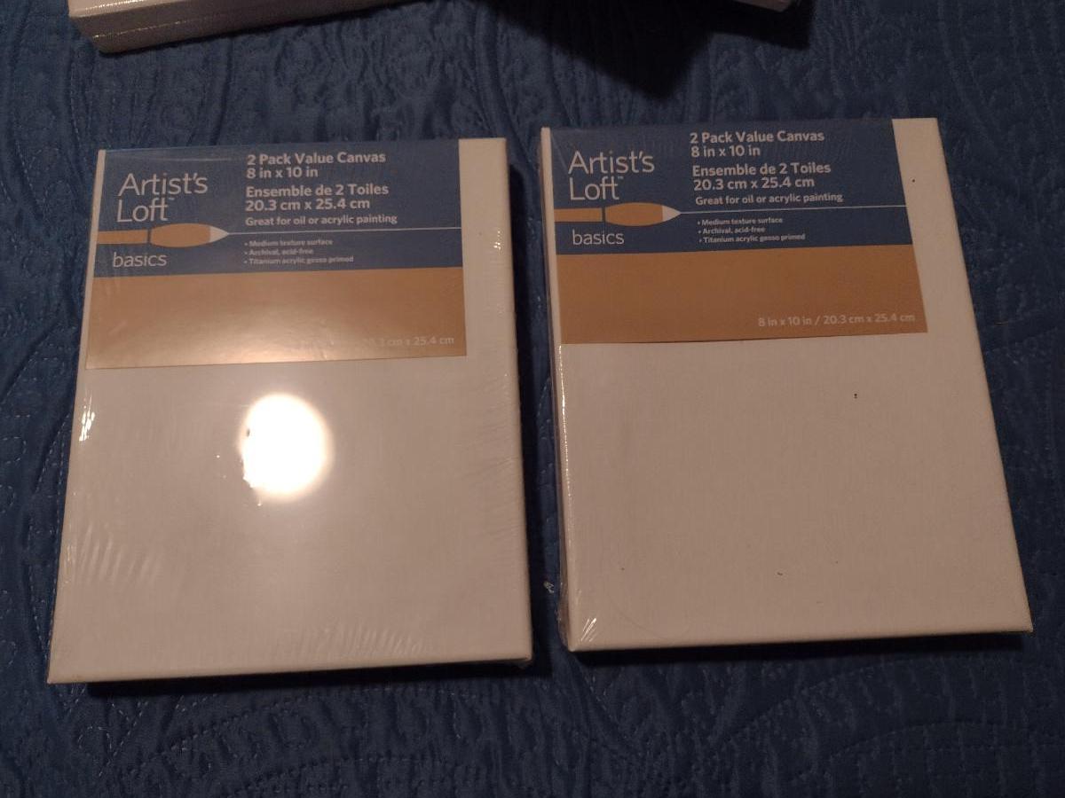 Assorted Artist's Canvas (E). 5 Packs total. 2 pieces in each. 2 packs 11" x 14", 2 packs 8" x 10", 1 pack 16" x 20".