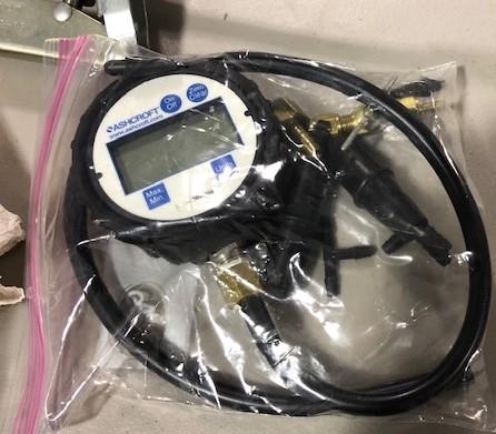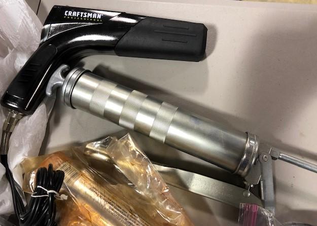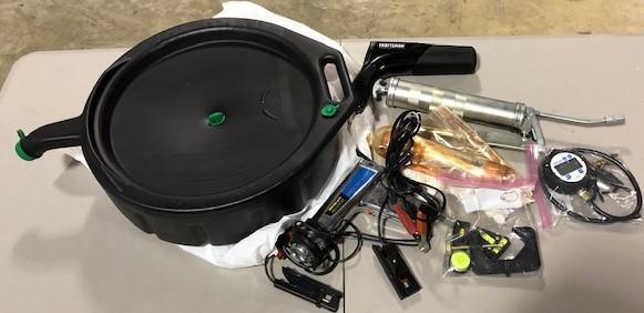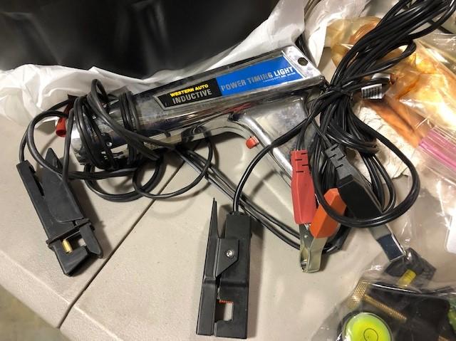 Lot includes: Grease gun, two (2) timing lights, oil pan, Ashcroft temperature gauge
