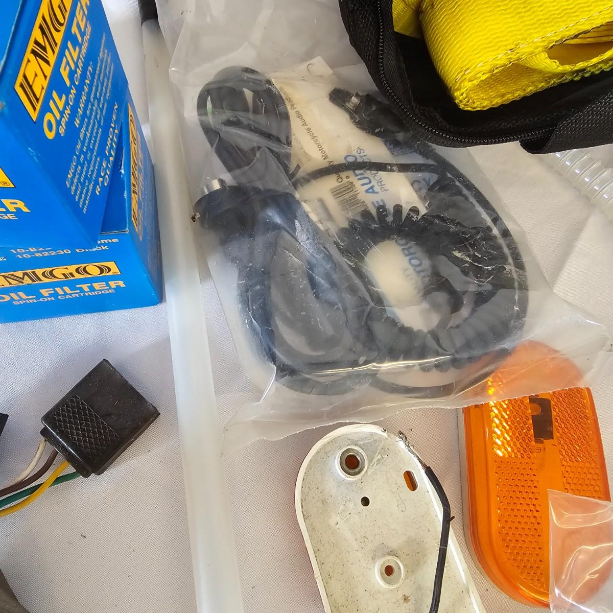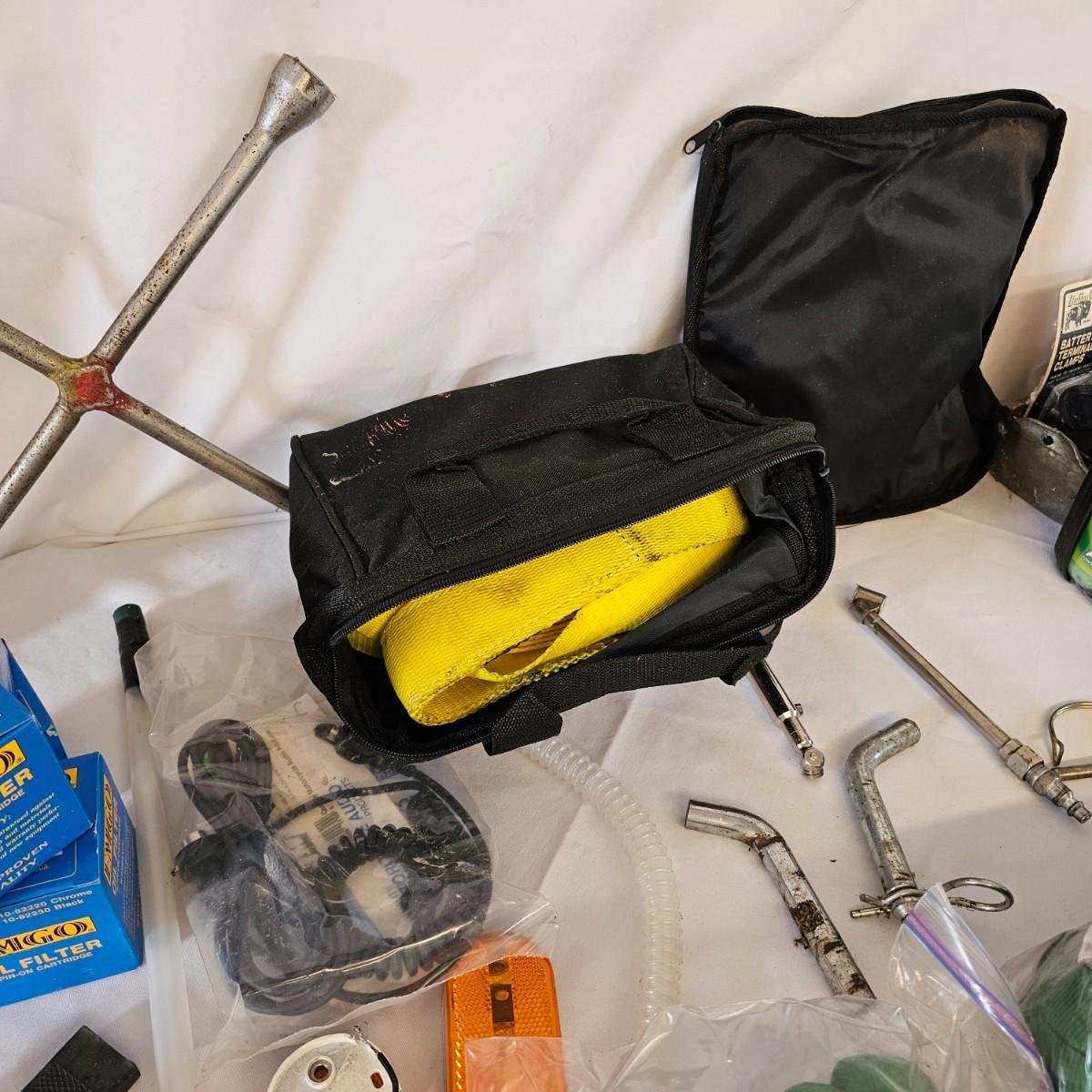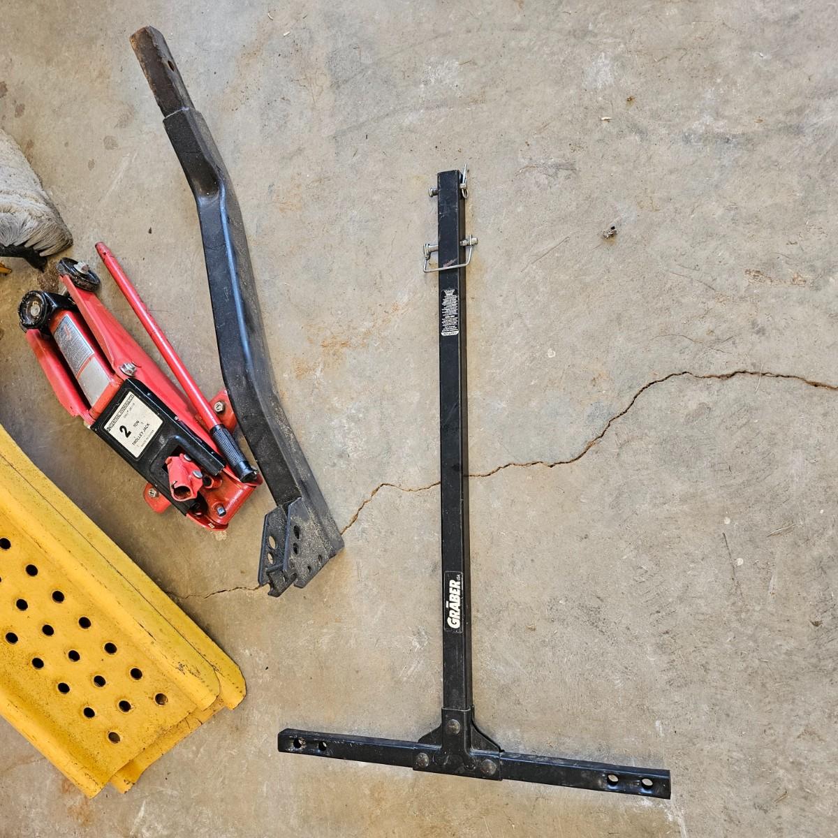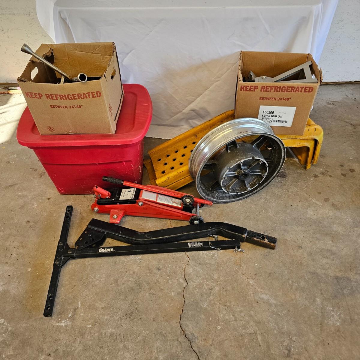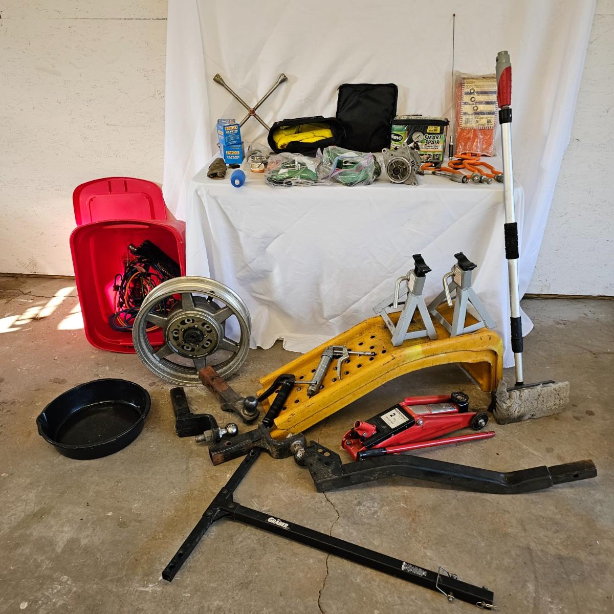 An assortment of tools and other pieces for automotive use. Car ramps, jack stands, trailer hitch pieces and pins, more. Straps, bungies, tire gauges. Generator for 2000 Honda Goldwing.. Graber tow bar setup. One Honda motorcycle rim, approximately 17"D. Grease guns, tread assists, tire repair kit. Ramps are 10" x 34" x 11"H. One steel tow chain, approximately 13' long. Red tub included. See photos for details. Local pickup only.