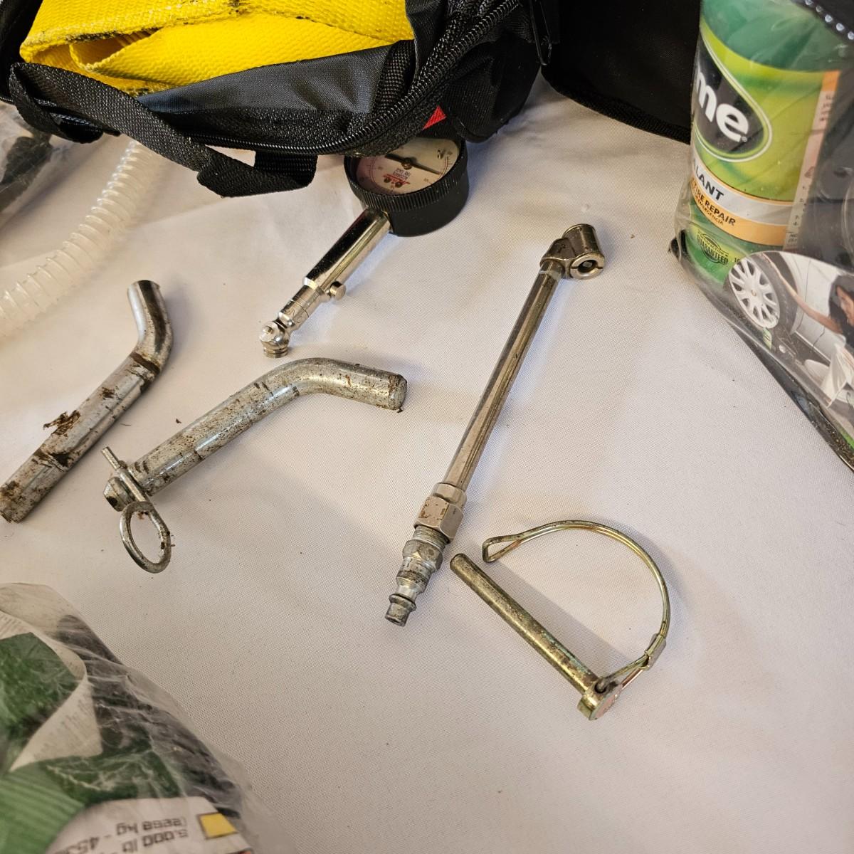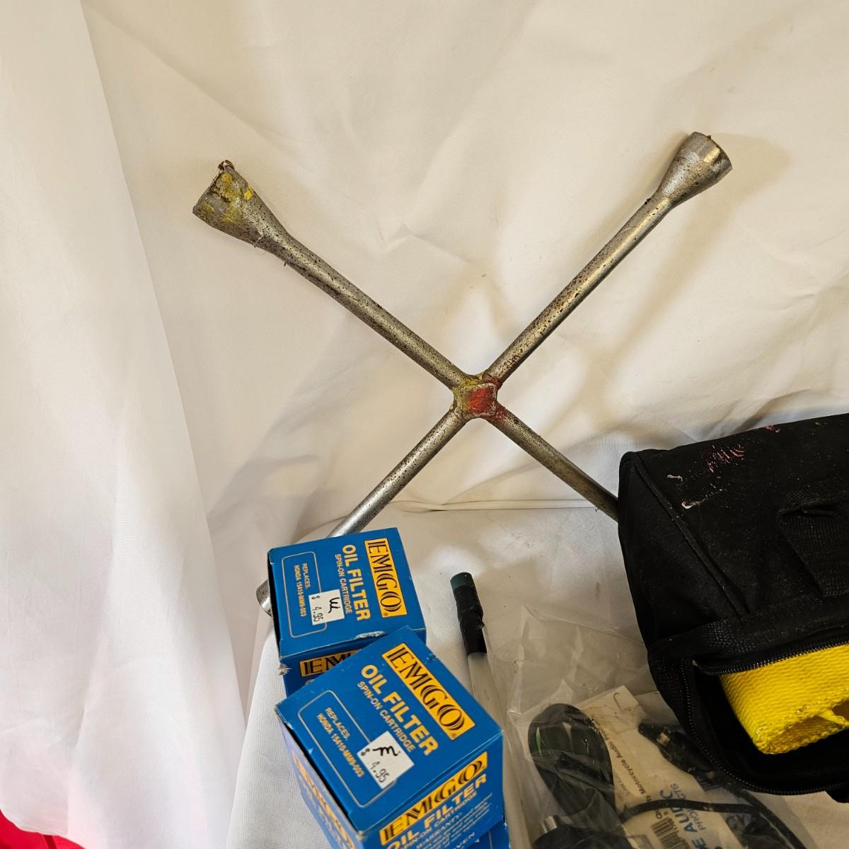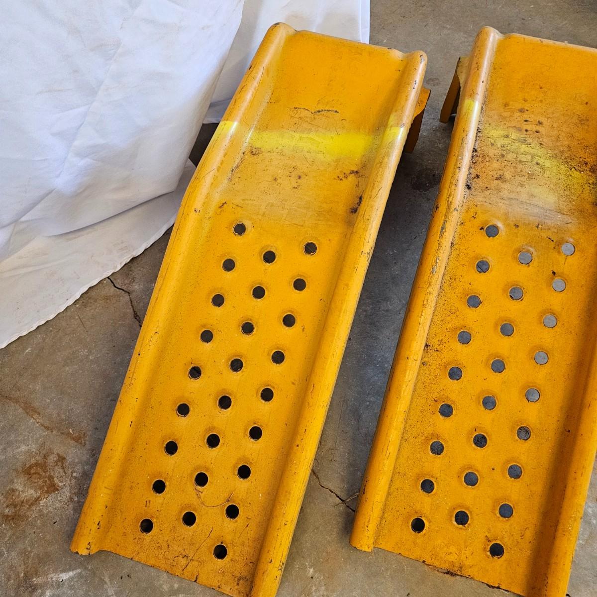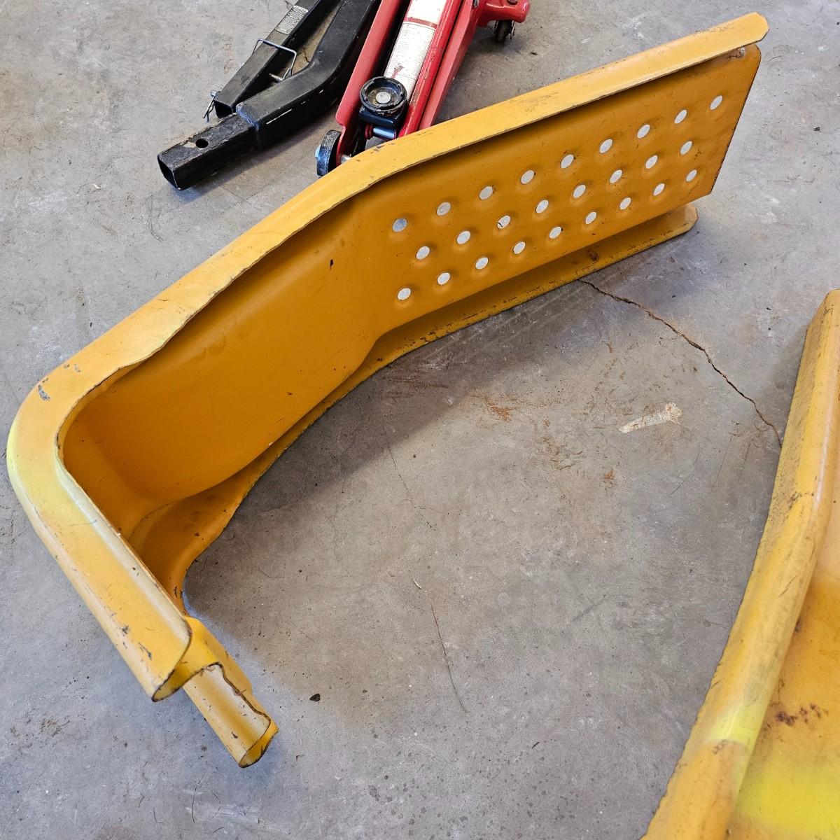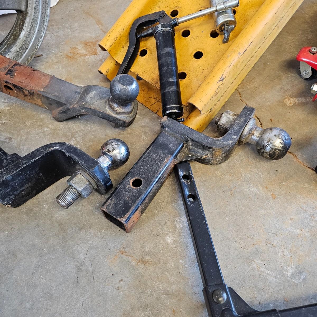 An assortment of tools and other pieces for automotive use. Car ramps, jack stands, trailer hitch pieces and pins, more. Straps, bungies, tire gauges. Generator for 2000 Honda Goldwing.. Graber tow bar setup. One Honda motorcycle rim, approximately 17"D. Grease guns, tread assists, tire repair kit. Ramps are 10" x 34" x 11"H. One steel tow chain, approximately 13' long. Red tub included. See photos for details. Local pickup only.
