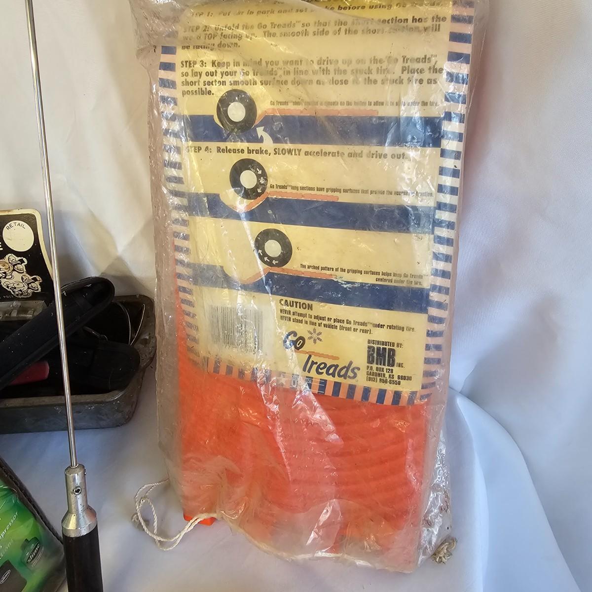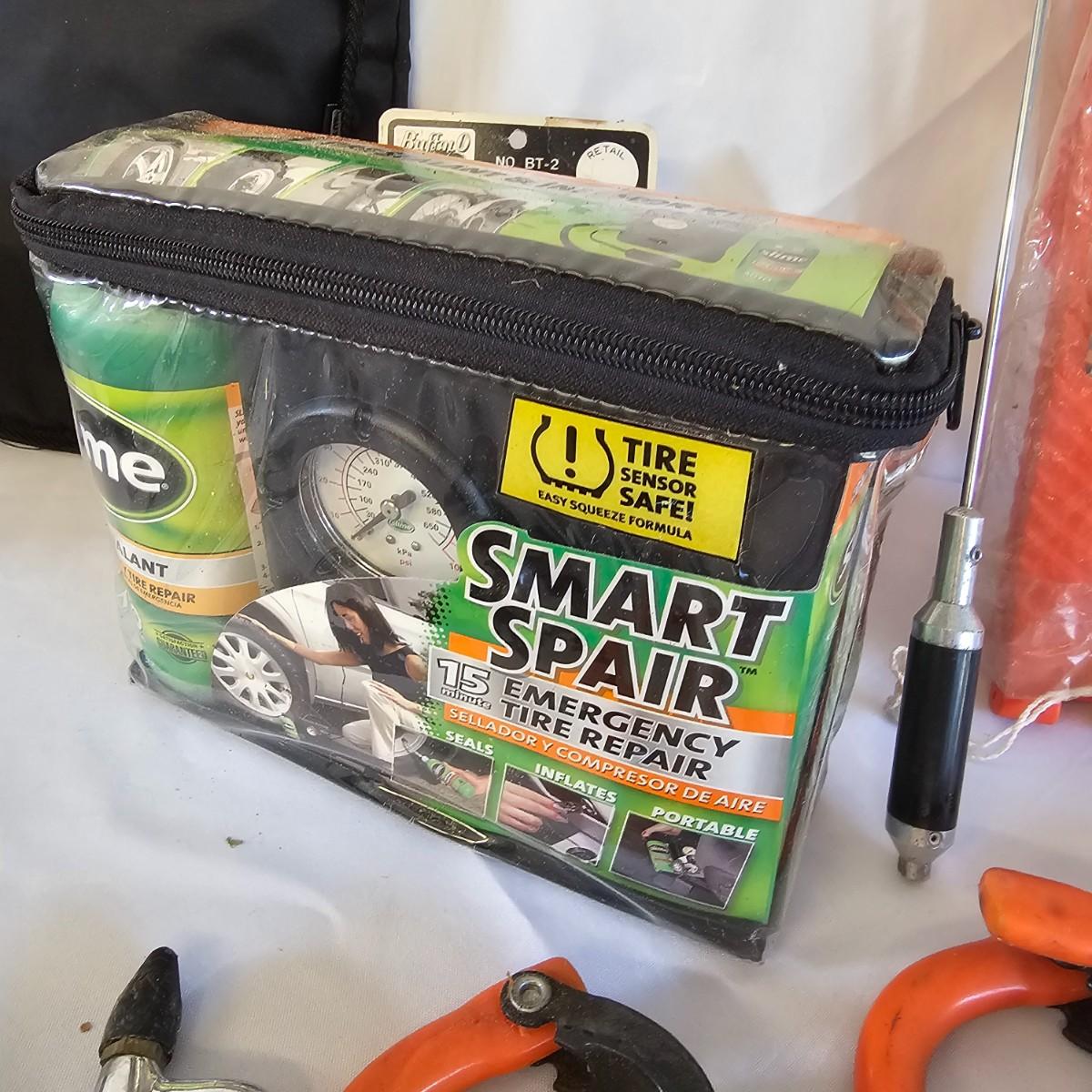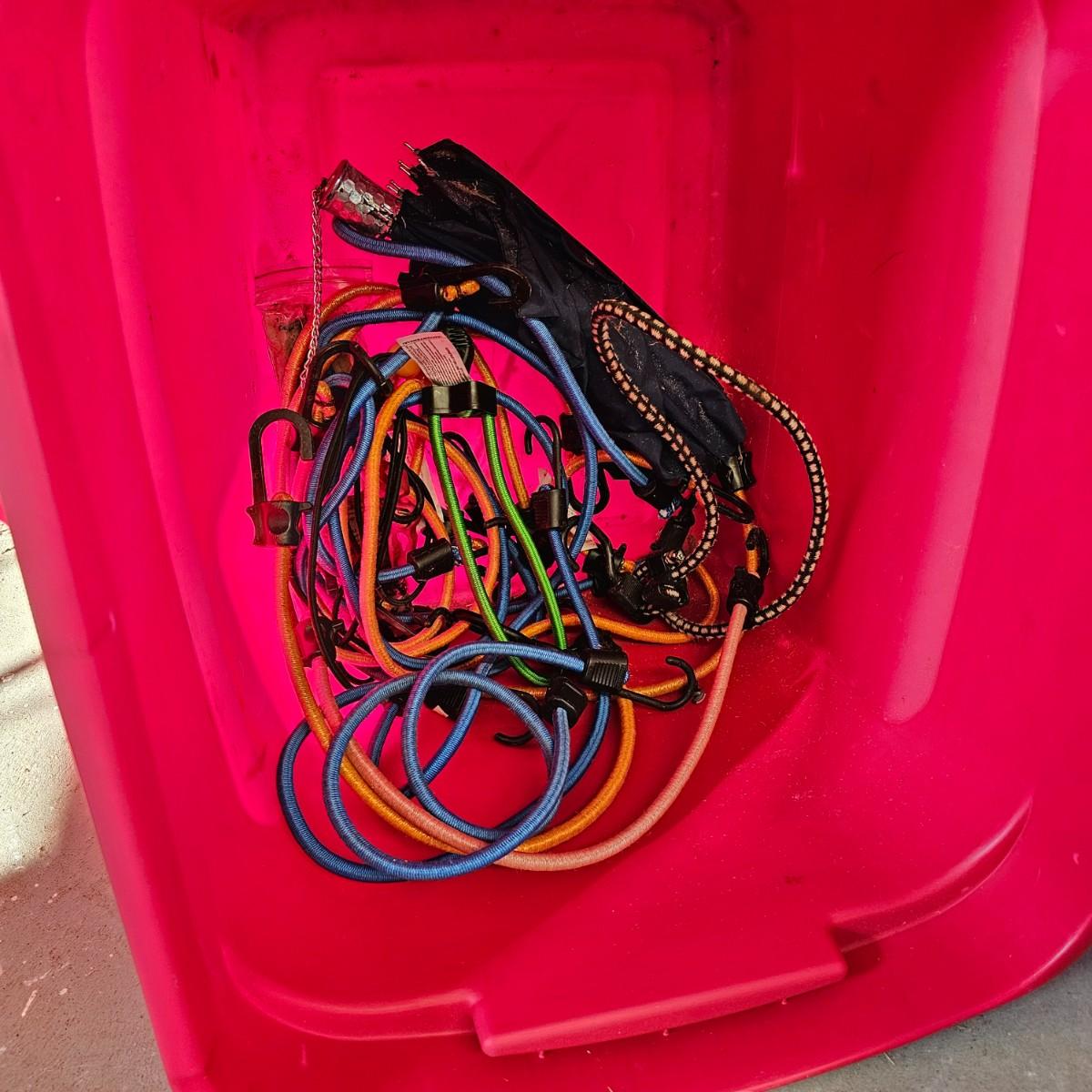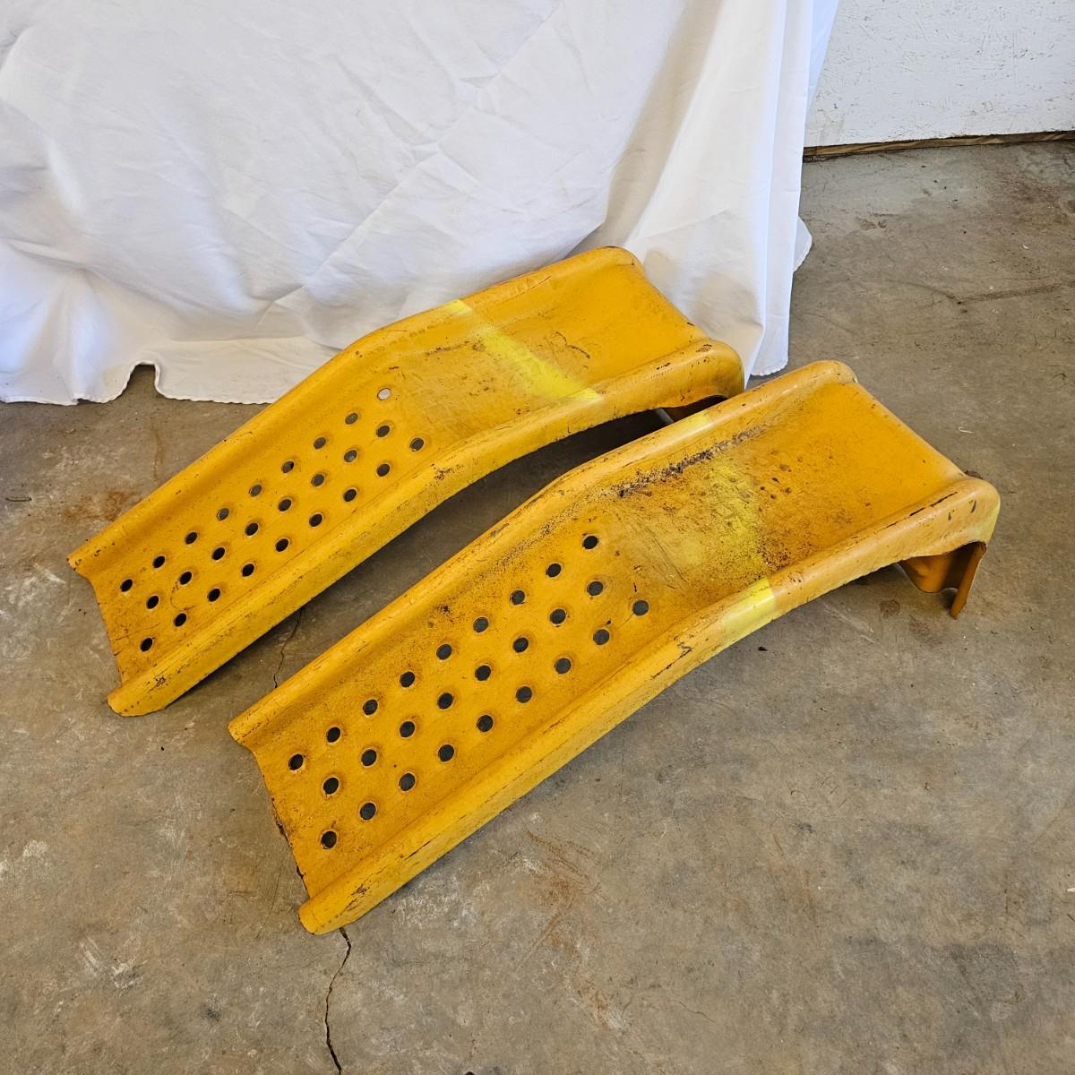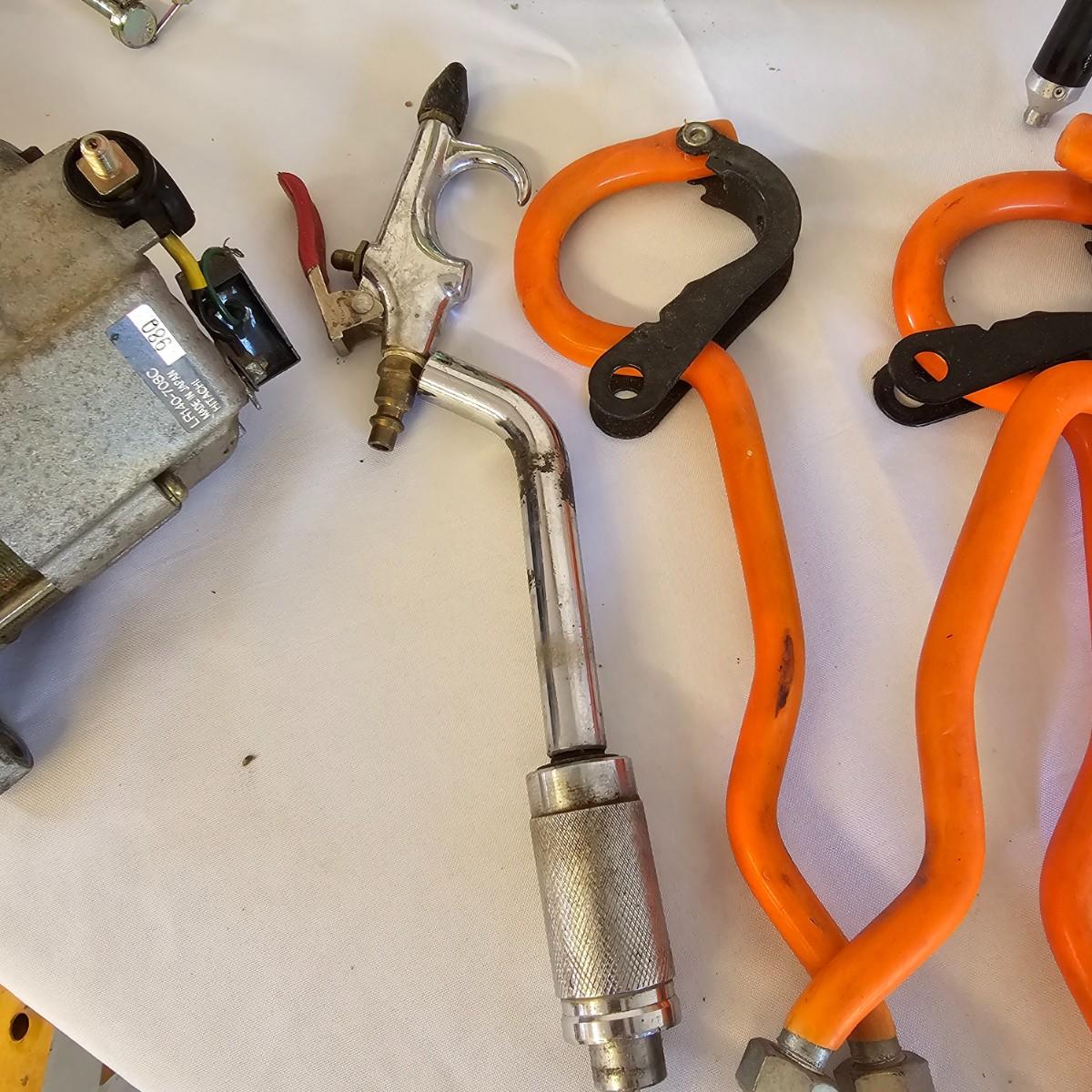 An assortment of tools and other pieces for automotive use. Car ramps, jack stands, trailer hitch pieces and pins, more. Straps, bungies, tire gauges. Generator for 2000 Honda Goldwing.. Graber tow bar setup. One Honda motorcycle rim, approximately 17"D. Grease guns, tread assists, tire repair kit. Ramps are 10" x 34" x 11"H. One steel tow chain, approximately 13' long. Red tub included. See photos for details. Local pickup only.